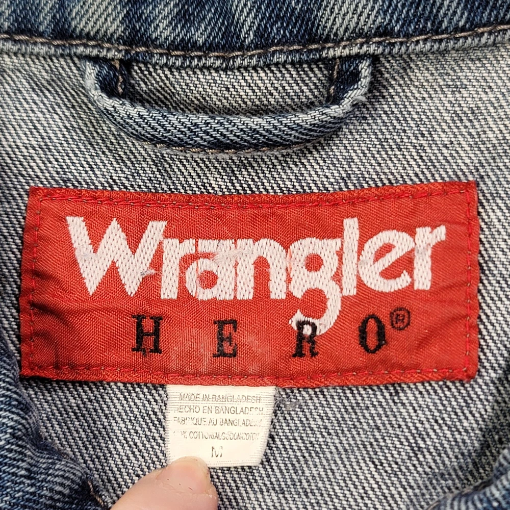 This vintage Wrangler denim jacket is a must-have for any fashion-savvy man. With a solid blue color and short length, it's perfect for any occasion. The jacket features a spread collar, button closure, and accents that give it a unique look. Made of high-quality cotton denim, it's comfortable and durable. The jacket is a size medium and has a regular fit. It's perfect for men who want to add a touch of style to their wardrobe. Whether you're going out with friends or running errands, this jacket is sure to turn heads. Don't miss out on the chance to own this one-of-a-kind piece.