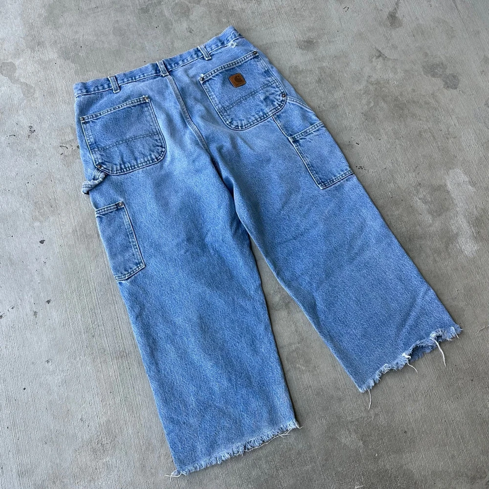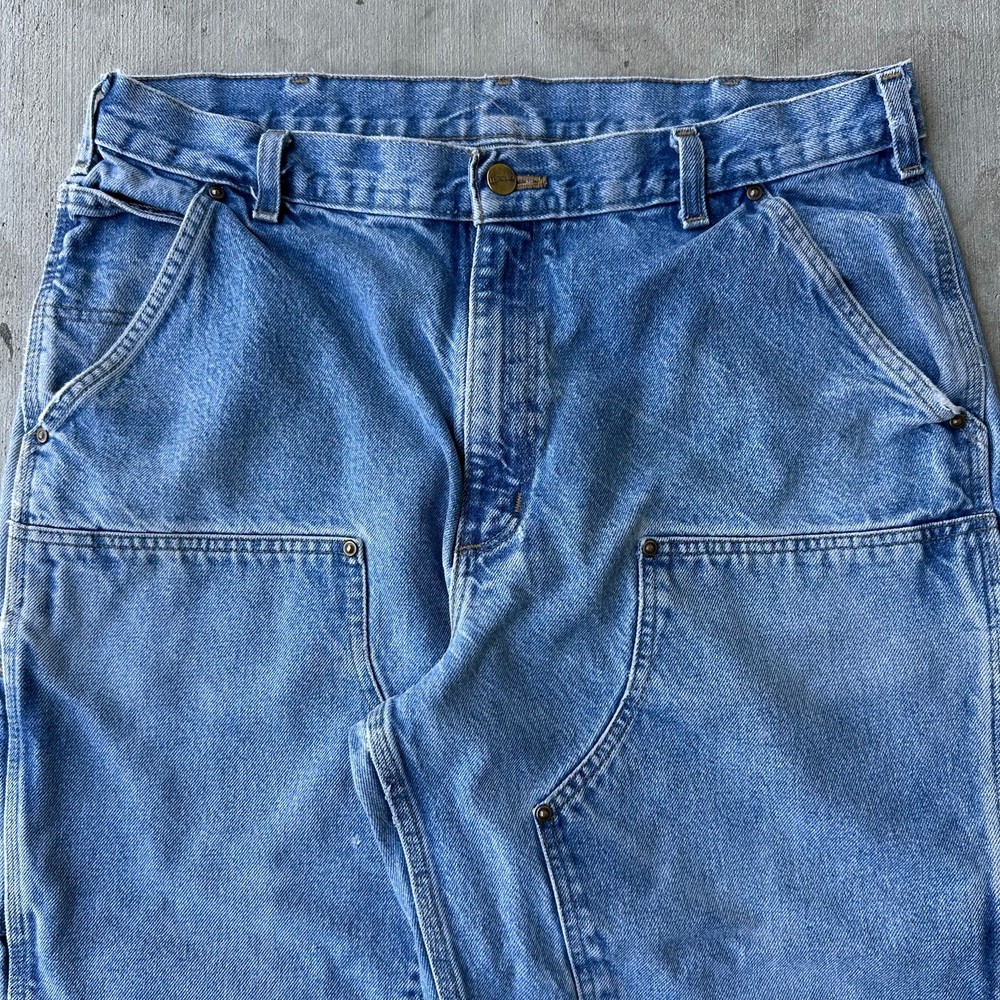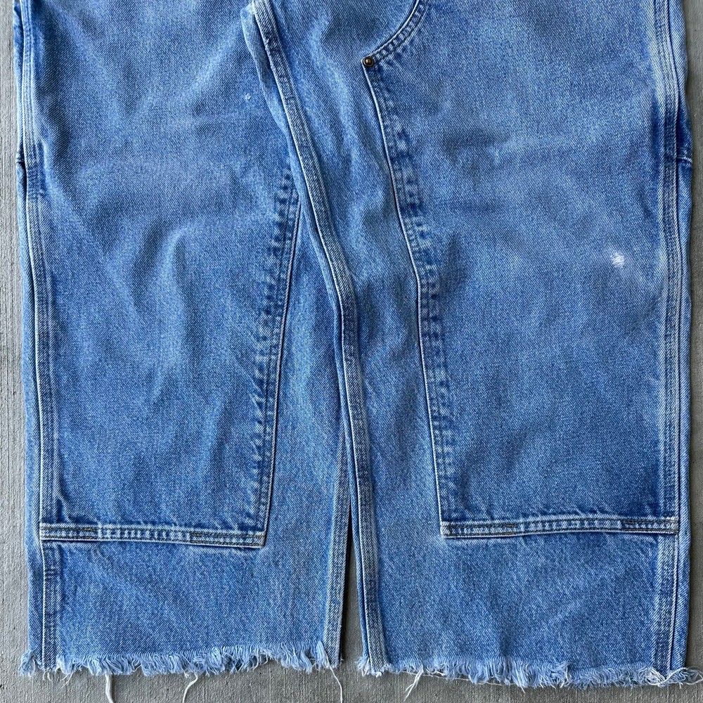 Vintage Y2K blue Carhartt double knee work wear carpenter pants. Cut into basically long shorts. Few markings on front. Measures 35x23 with a 10.25 inch leg opening. Please check measurements before purchasing. I do my best to show any flaws in pictures. Quick shipping! Bundles encouraged! @ants_haul on Instagram. 0685!!!