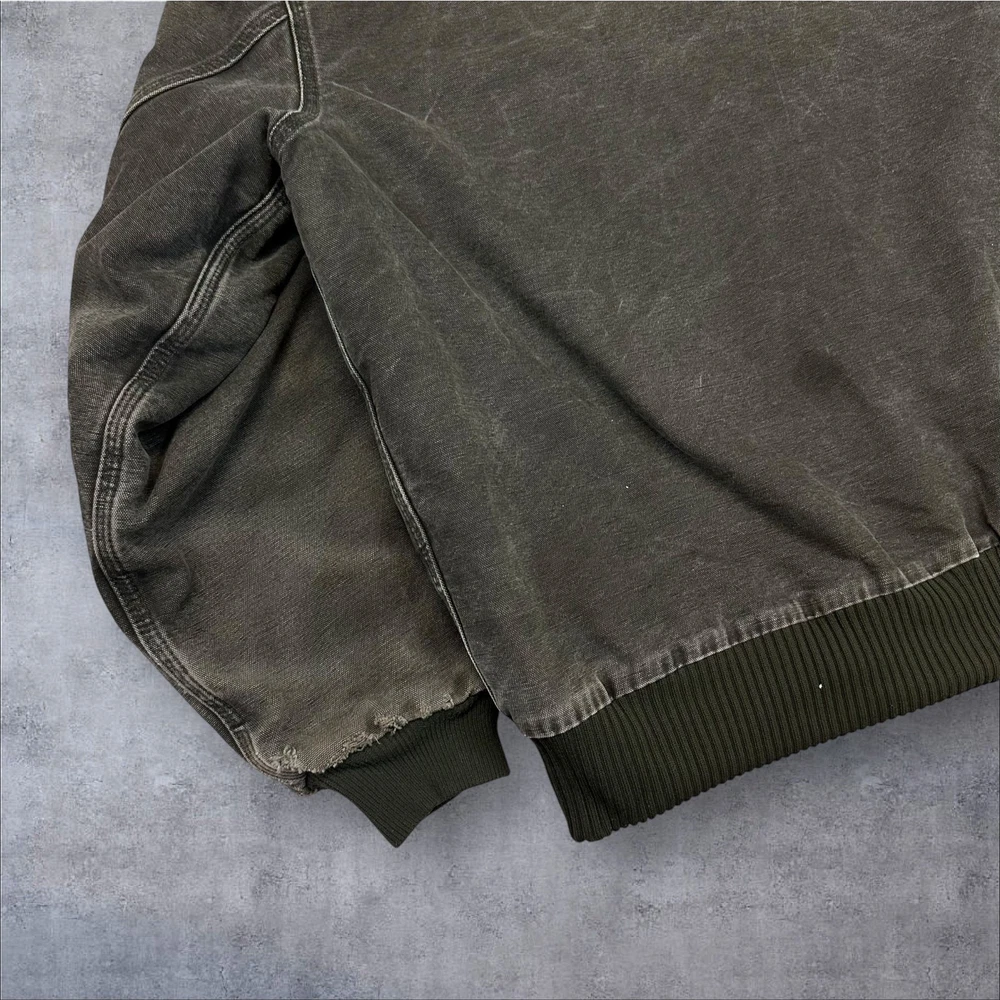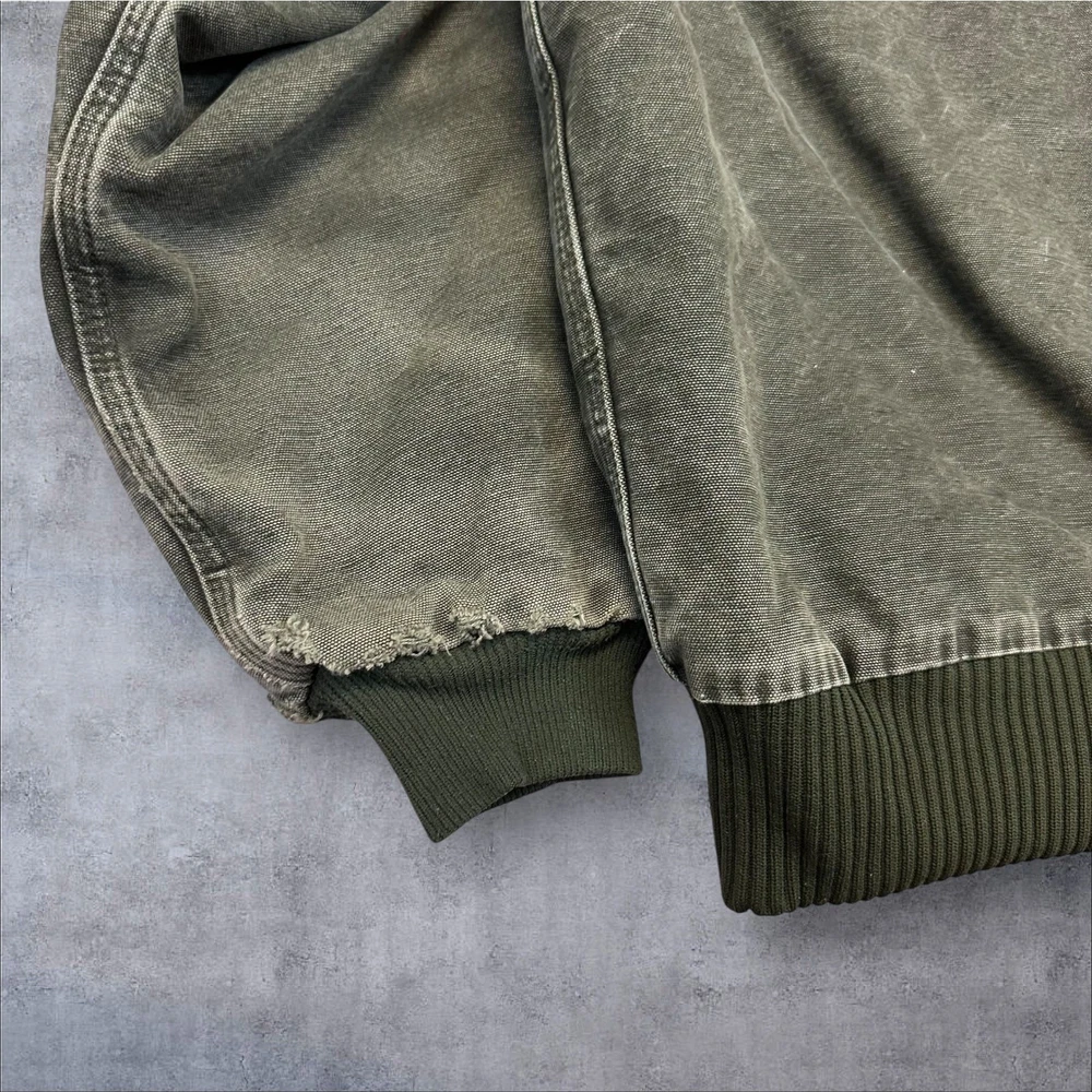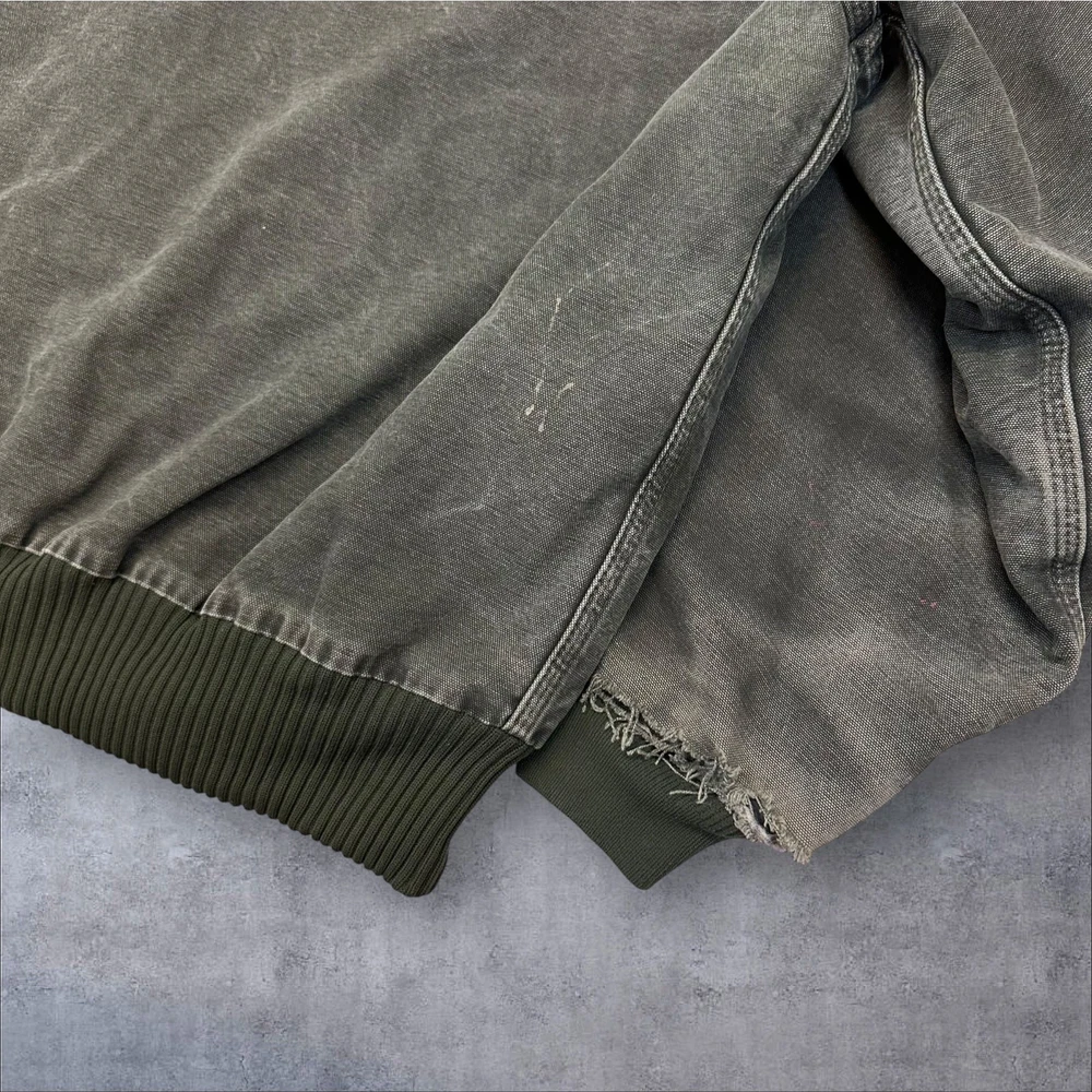 Vintage Y2K Carhartt green J130 MOS hooded work wear jacket. Great fade! Paint stains on chest. Missing zipper pull but still functional. Distressing at cuffs. Measures 29x29. Please check measurements before purchasing. I do my best to show any flaws in pictures. Quick shipping! Bundles encouraged! @ants_haul on Instagram. J0082!!!