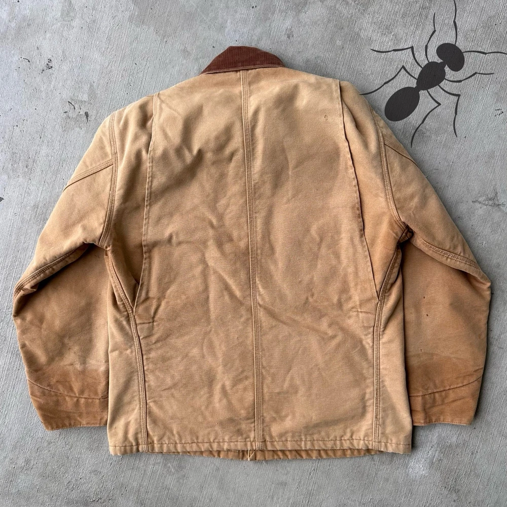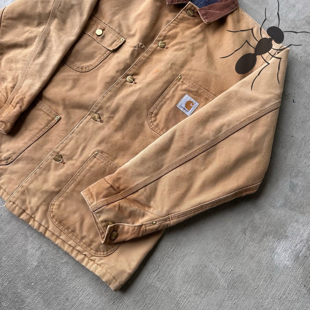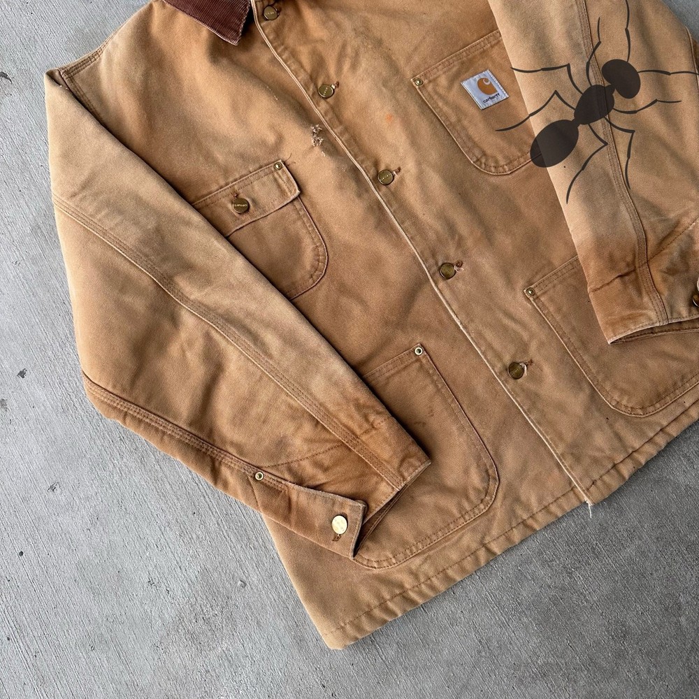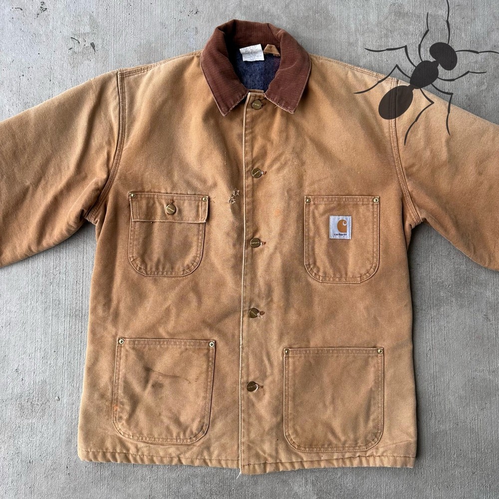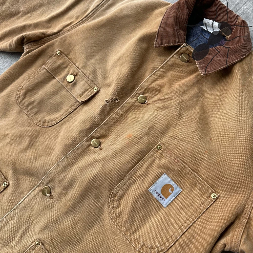 Vintage Y2K Carhartt brown chore work wear jacket. Good fade! Small holes on chest. Few spot stains throughout. Measures 24x29.5. Please check measurements before purchasing. I do my best to show any flaws in pictures. Quick shipping! Bundles encouraged! @ants_haul on Instagram. J0100!!!