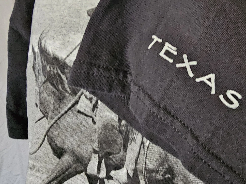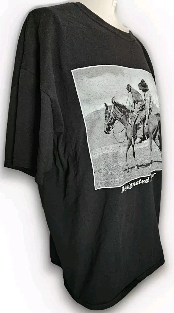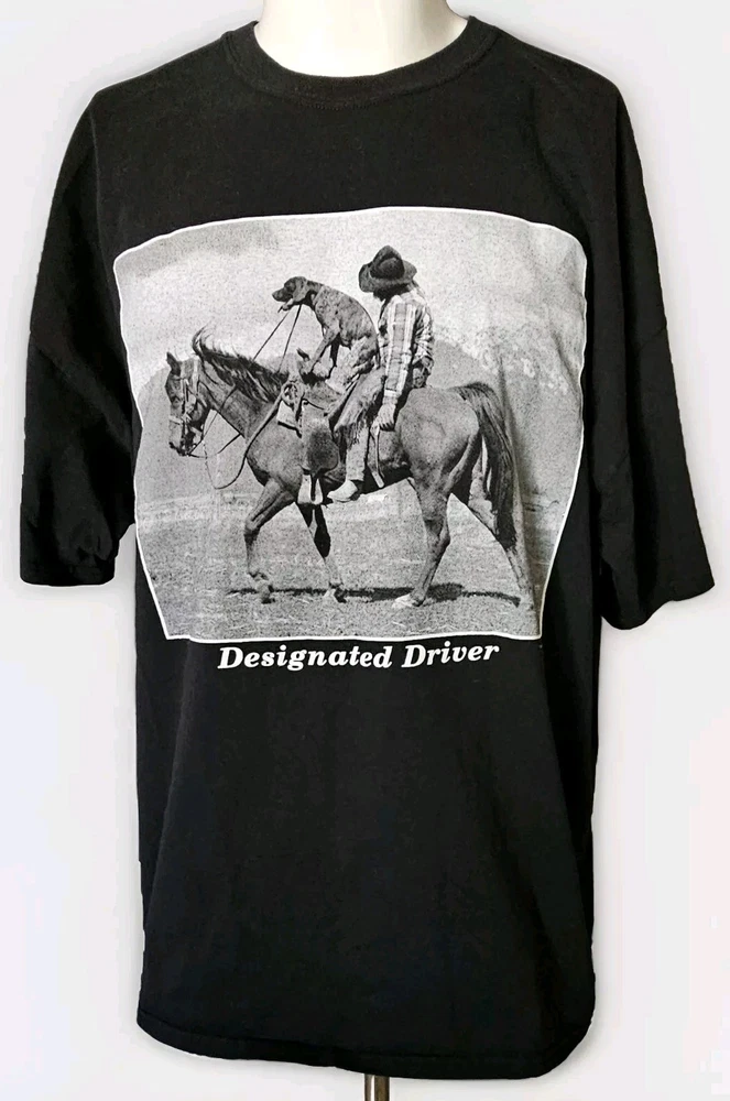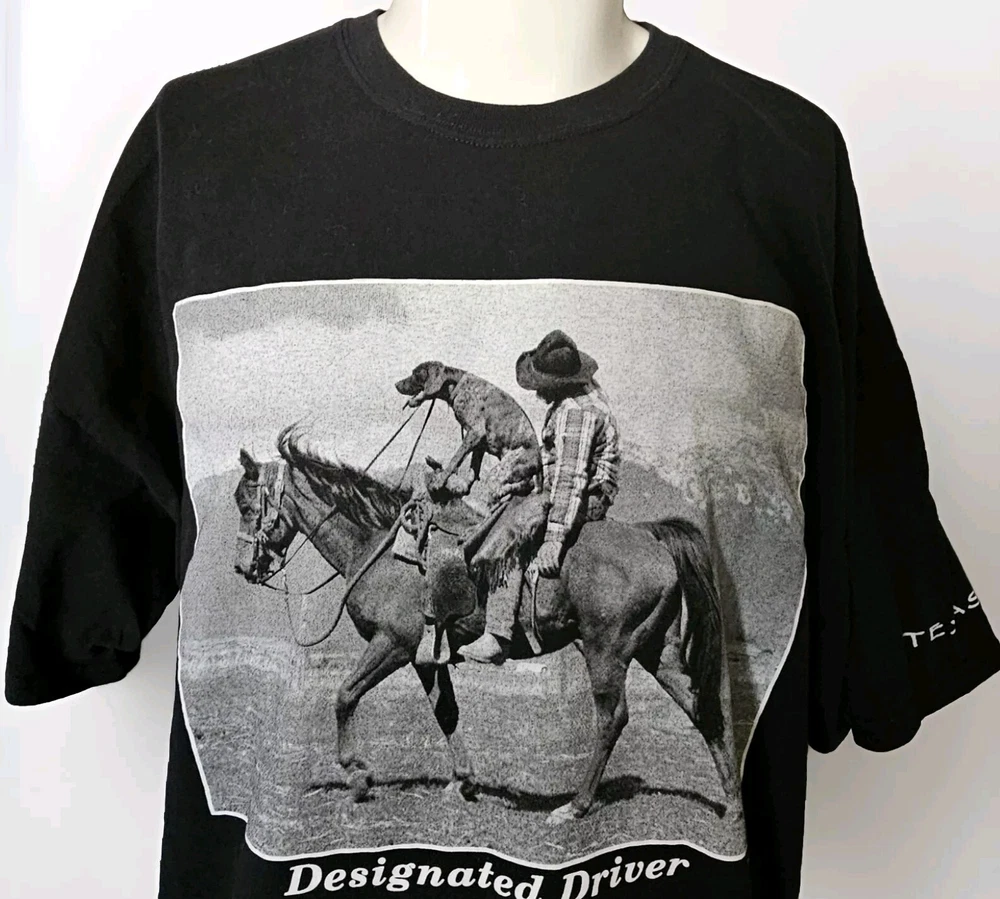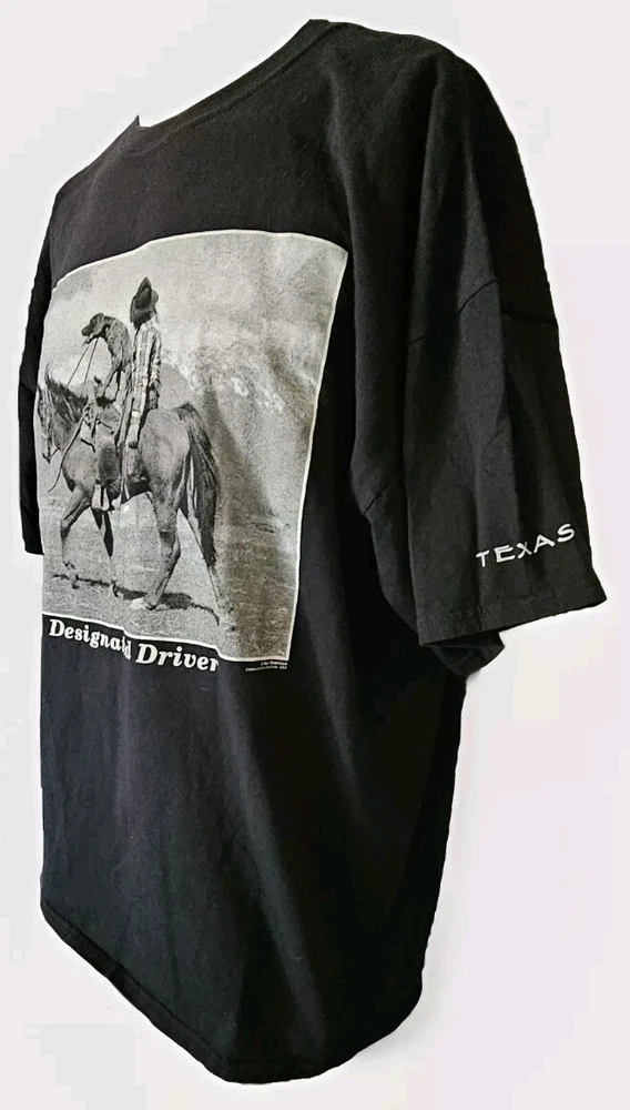 Awesome, humorous vintage 2006 Y2K 'Designated Driver' Texas black men's t-shirt in size XXL. Design by Paul Stanton, licensed by Polar Graphics, USA. Really great print of a drunk cowboy and dog riding a horse. 'TEXAS' is printed on the left sleeve as well. This has been securely stored for the last 15+ years. Only washed and worn one time! It's in EXCELLENT, LIKE NEW CONDITION! No holes, stains, frays, odors, etc. Comes from a smoke-free and pet-free home. (See photos for details and condition) The original Gildan Ultra Cotton tag is perfect. Labeled size 2XL. Fits true to size. 100% Cotton. Approximate measurements are as follows: Underarm to underarm/pit to pit (laying flat): 25.5" (51 inch chest) Length (laying flat) Neckline to bottom hem: 29" Please review the measurements and photos very carefully. This is a used shirt, and some light wear/fading should be expected unless otherwise noted. Please ask ANY and ALL questions prior to purchasing. This is being sold AS-IS, and NO RETURNS are accepted. Fully secure and insured shipping via USPS Mail. I SHIP FAST!! Please check out my other items for more awesome, vintage clothing and unique merchandise!!! Thanks for looking!