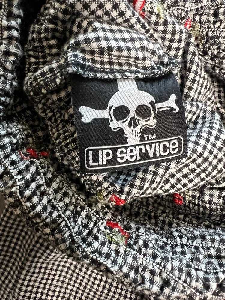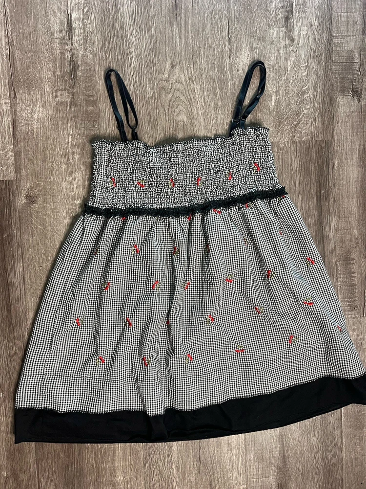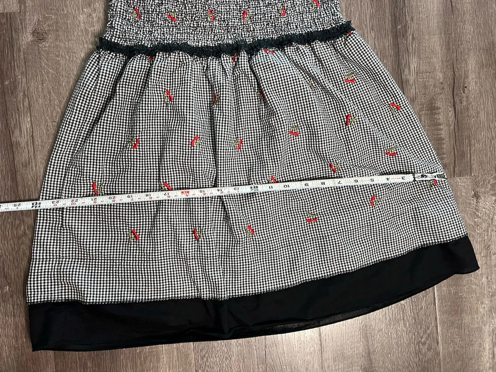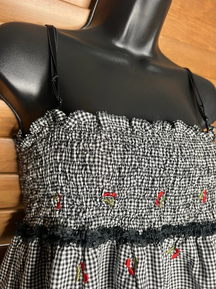 This vintage early 2000’s late 90s Lip Service mini dress or too is a must-have for any fashion-forward individual. With a unique blend of goth, punk, rockabilly and emo aesthetics, this mini dress or top is perfect for everyday wear. The black and white gingham cotton material with embroidered cherries adds a touch of whimsy goth to the outfit, while the cherries all over and hemline provide a playful touch. Adjustable bra type straps. Could be worn as a top over jeans Or leggings or as a mini dress! Could be casual or fancy depending on how you dress it up or down. The dress is an original piece from the 1990s, with measurements clearly displayed in the photos. It is a regular size fit for women, with a chest size that can be referred to in the photographs. Made in the United States, this vintage dress is a rare find that will make any outfit stand out. Beautiful vintage condition.