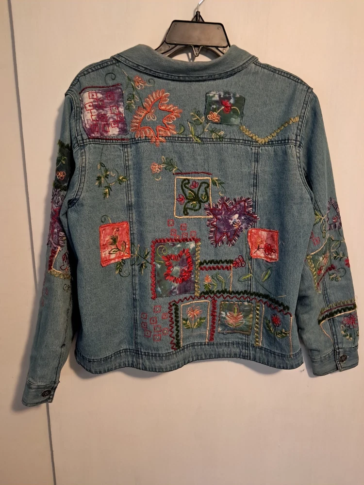 This vintage Coldwater Creek jacket is a unique piece that features a patchwork of floral embroidered denim. The jacket has a short length with long sleeves and a collared neckline. It is made of cotton outer shell material with a polyester lining and insulation material. The jacket is decorated with button closure and decorative buttons that add a bohemian touch to the overall look. The jacket is a regular fit and is available in petite size. This item is a must-have for any vintage clothing enthusiast.