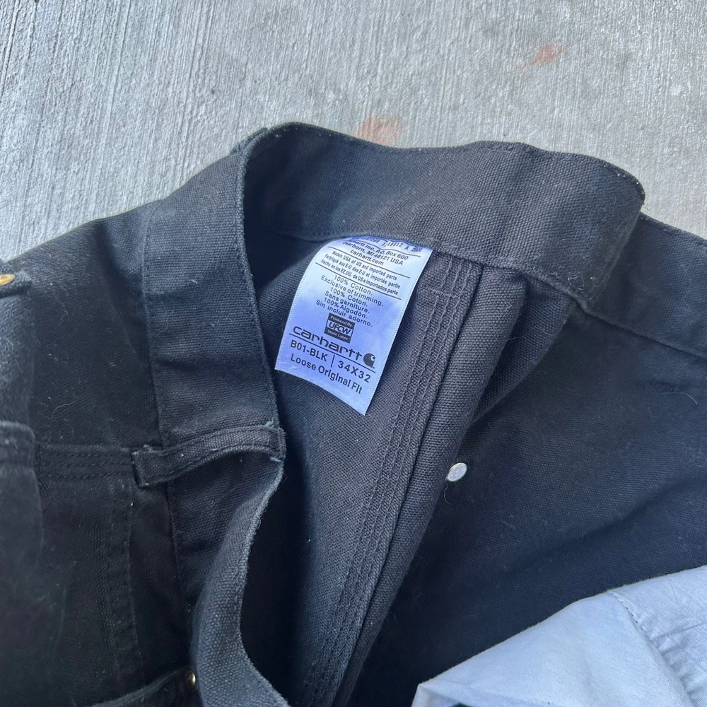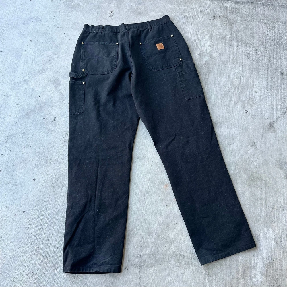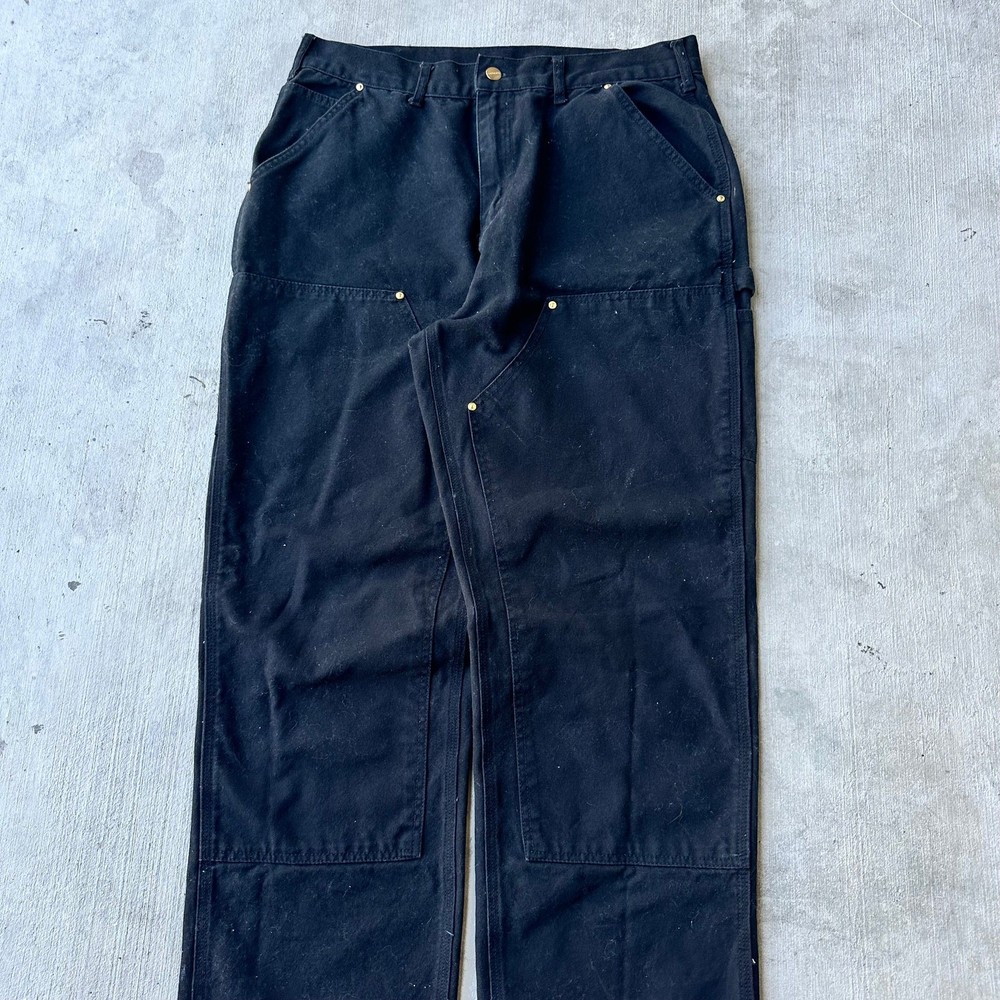 Vintage Y2K black Carhartt double knee work wear carpenter pants. Great pair! Could use a lint roll. Measures 34x32 and a 9 inch leg opening. Please check measurements before purchasing. I do my best to show any flaws in pictures. Quick shipping! Bundles encouraged! @ants_haul on Instagram. 0633!!!