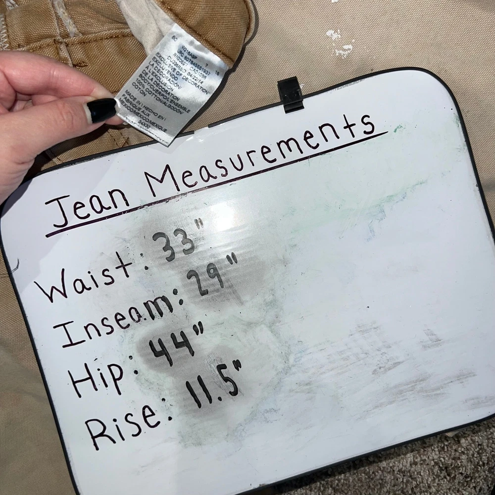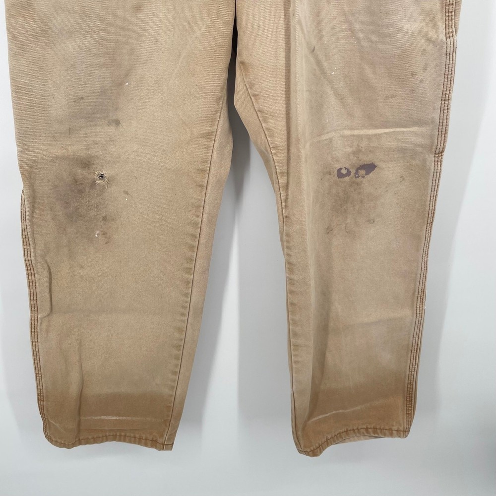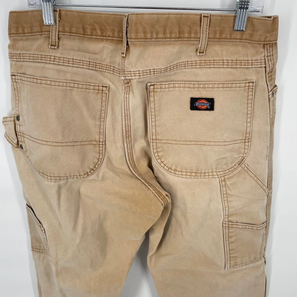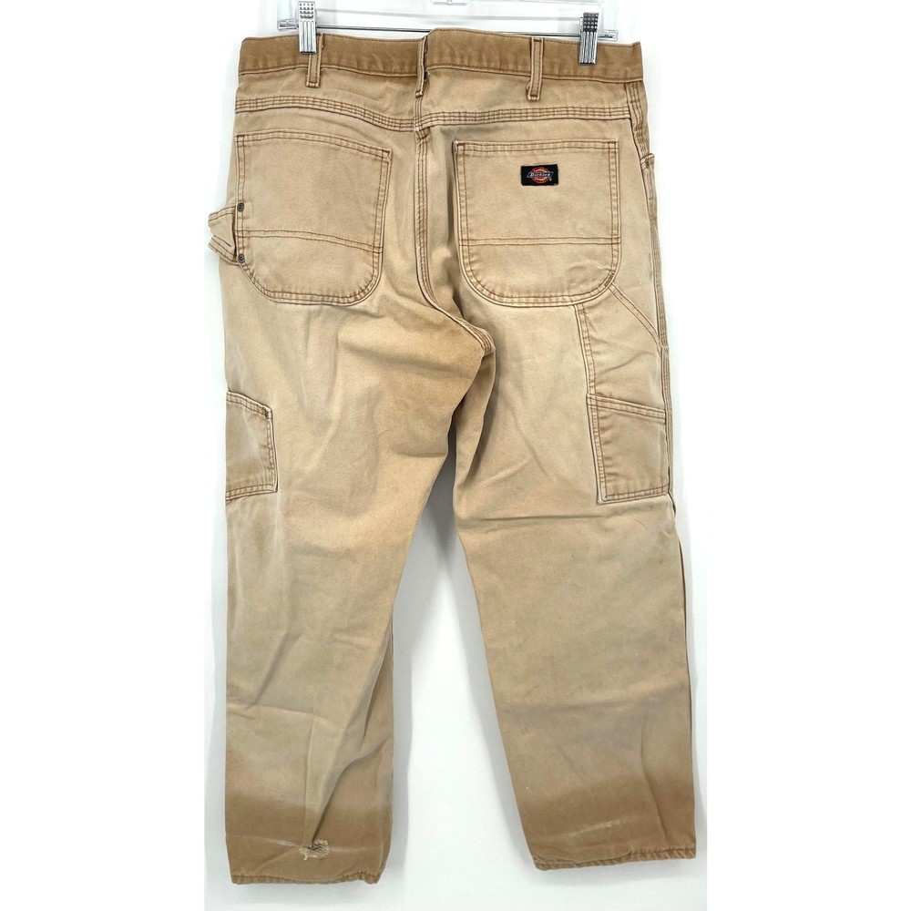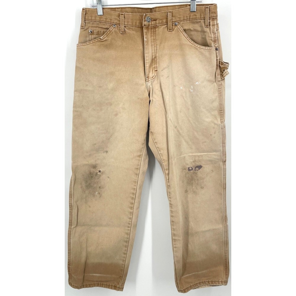 Vintage y2k men's tan canvas distressed Dickies carpenter utility painters faded work pants Waist: 33" Inseam: 29" Hip: 44" Rise: 11.5" Tag Size: 34x30 *Has some wear, staining/paint stains, rips* Item is in good used condition. Look at photos to see the condition. All, if any, flaws have been pictured. See the last photo for measurements. The waist and hip measurements are measured flat and then multiplied by 2 to get the full measurement around. Please know which measurements fit you prior to purchasing, and don’t just rely on the size tag. Feel free to ask any questions! ***Item is cross posted on several platforms***