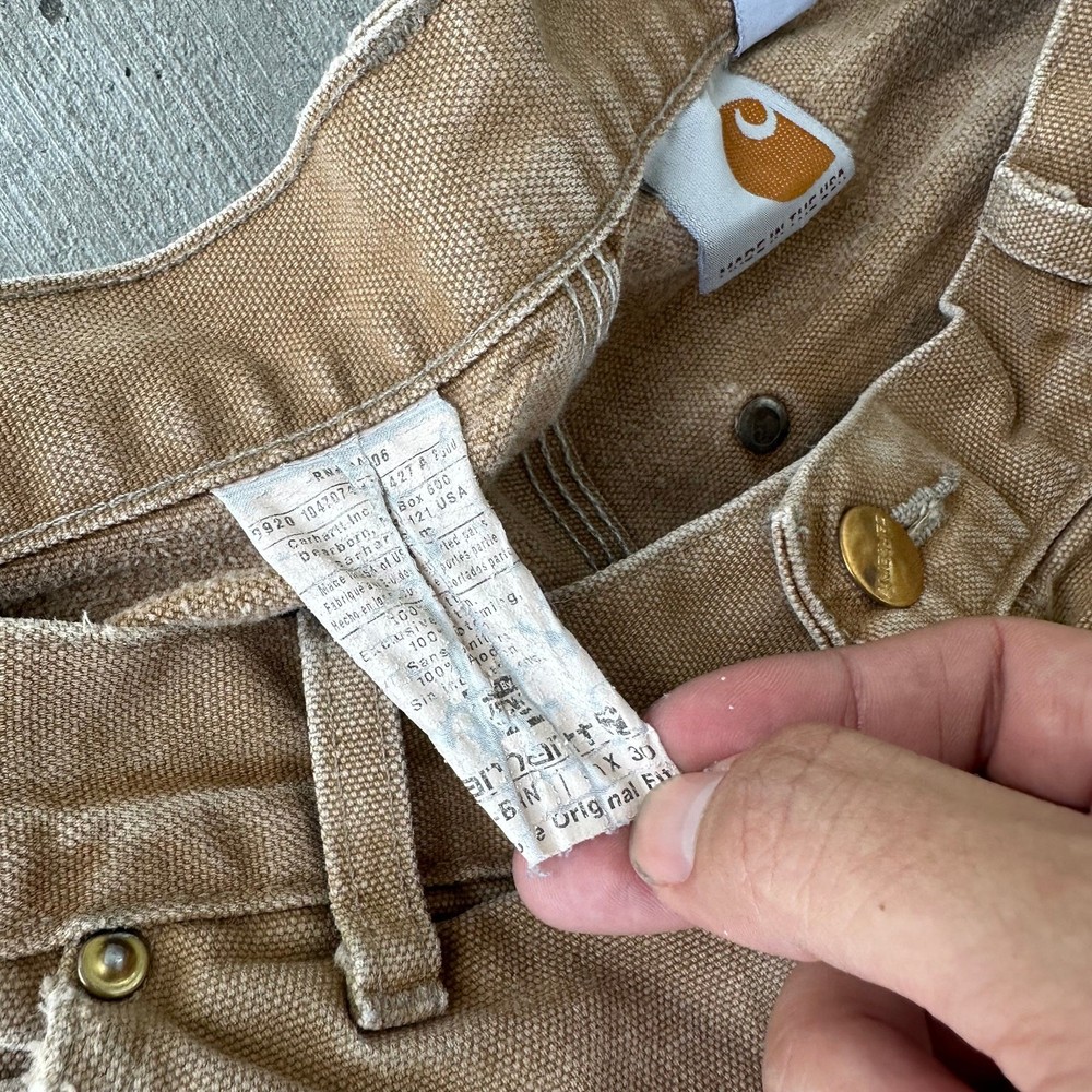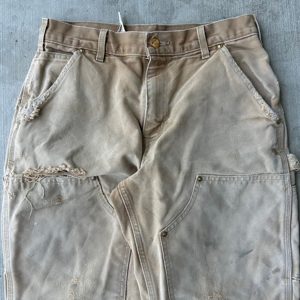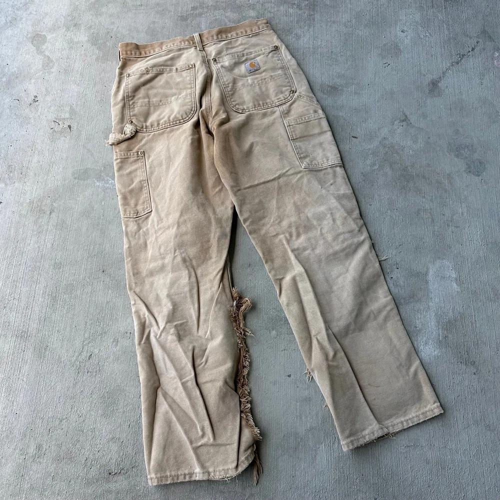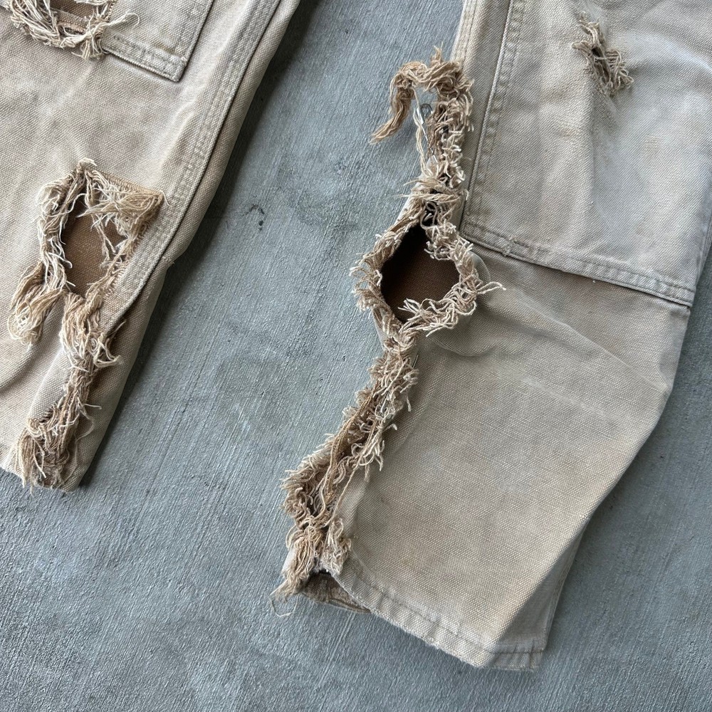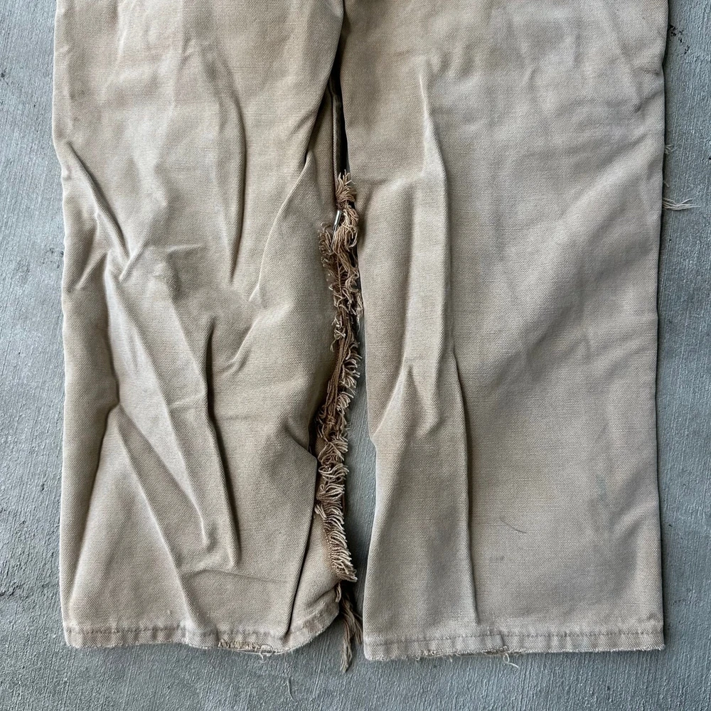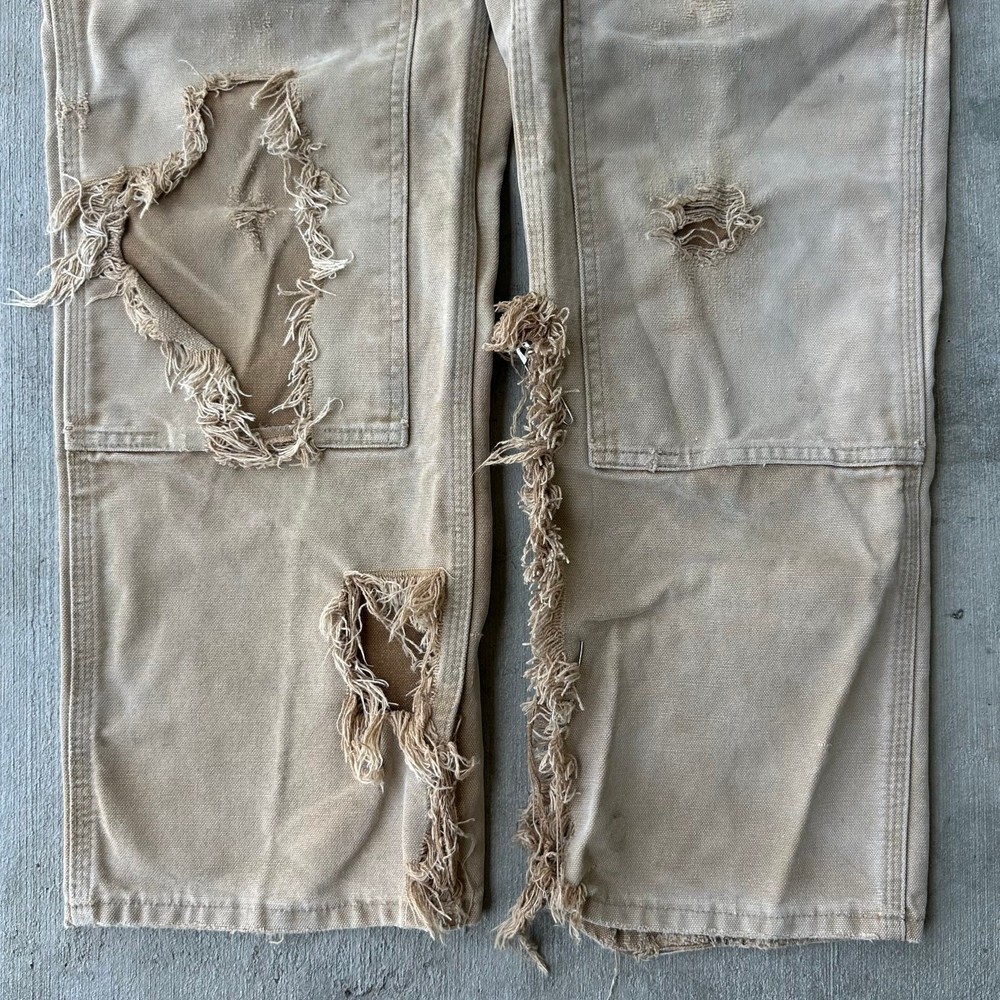 Vintage Y2K brown DISTRESSED Carhartt double knee work wear carpenter pants. Great fade on these! Tears throughout. Long rip along inside leg seam saftey pinned together. Measures 29x29 with a 8.5 inch leg opening Please check measurements before purchasing. I do my best to show any flaws in pictures. Quick shipping! Bundles encouraged! @ants_haul on Instagram. 0712!!!