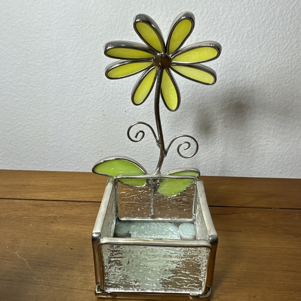 This vintage stained glass yellow flower figure trinket holder is a decorative candle holder made of glass, standing at 7 inches tall. Its retro style and flower shape make it a charming addition to various rooms in your home, such as the bedroom, living room, or bathroom. With a single unit quantity, this piece adds a touch of nature-themed elegance to your home decor.