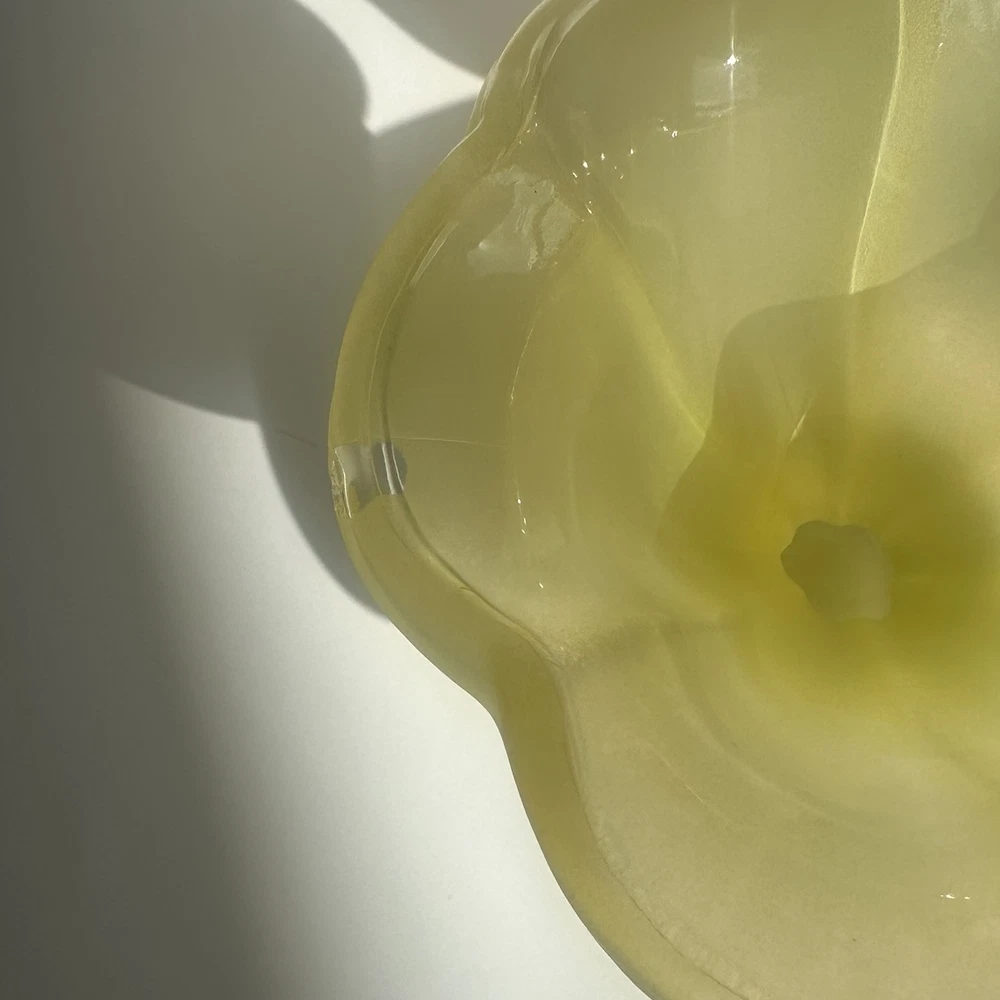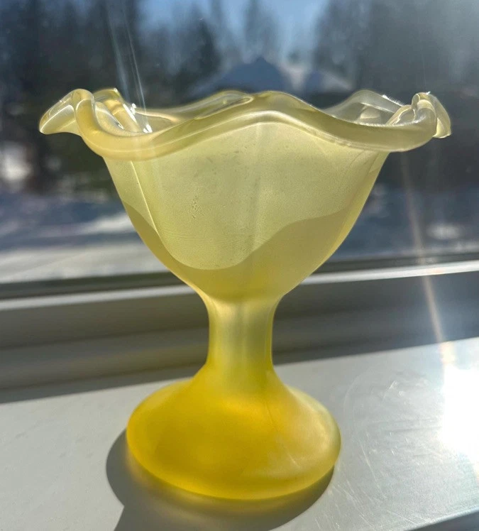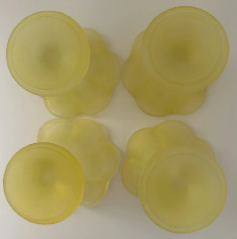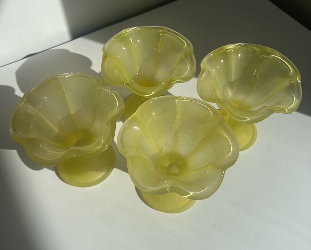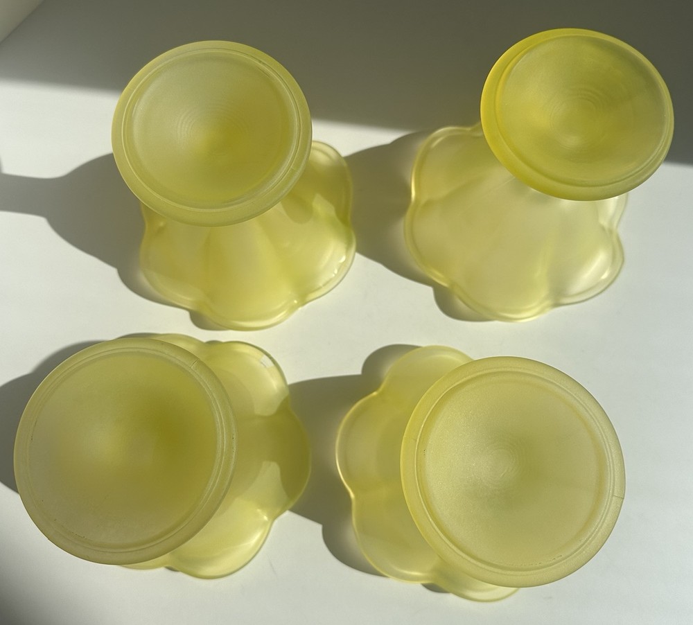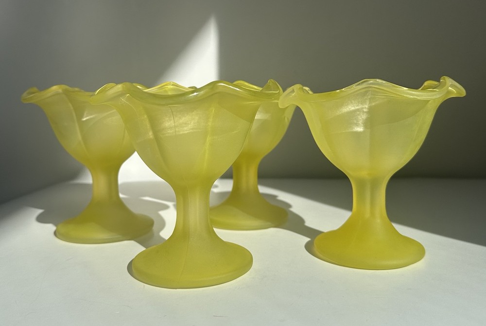 The Vintage Ice Cream Sundae Frosted Yellow Tulip Glass Dessert Cup from Italy exudes Mid-Century Modern charm with its yellow hue and matte finish. This set of 4 sundae cups, crafted in the 1950s, adds a touch of elegance to any table setting. Perfect for serving up delicious ice cream treats, these vintage cups are a timeless piece of Italian glassware that brings a touch of retro flair to your home decor. *one of the cups is slightly chipped, as shown on the last two pictures***