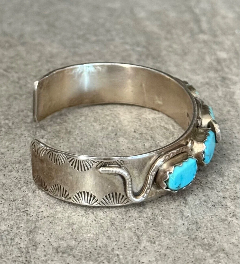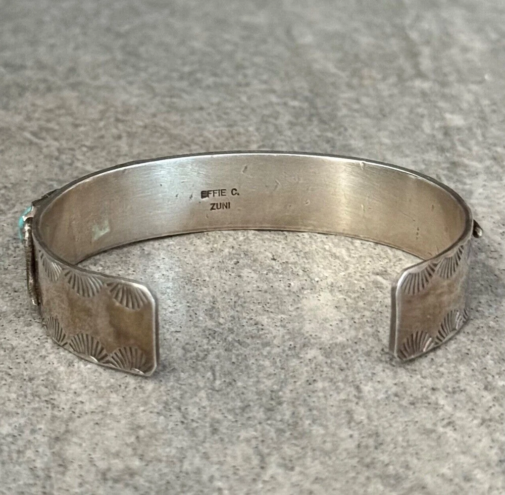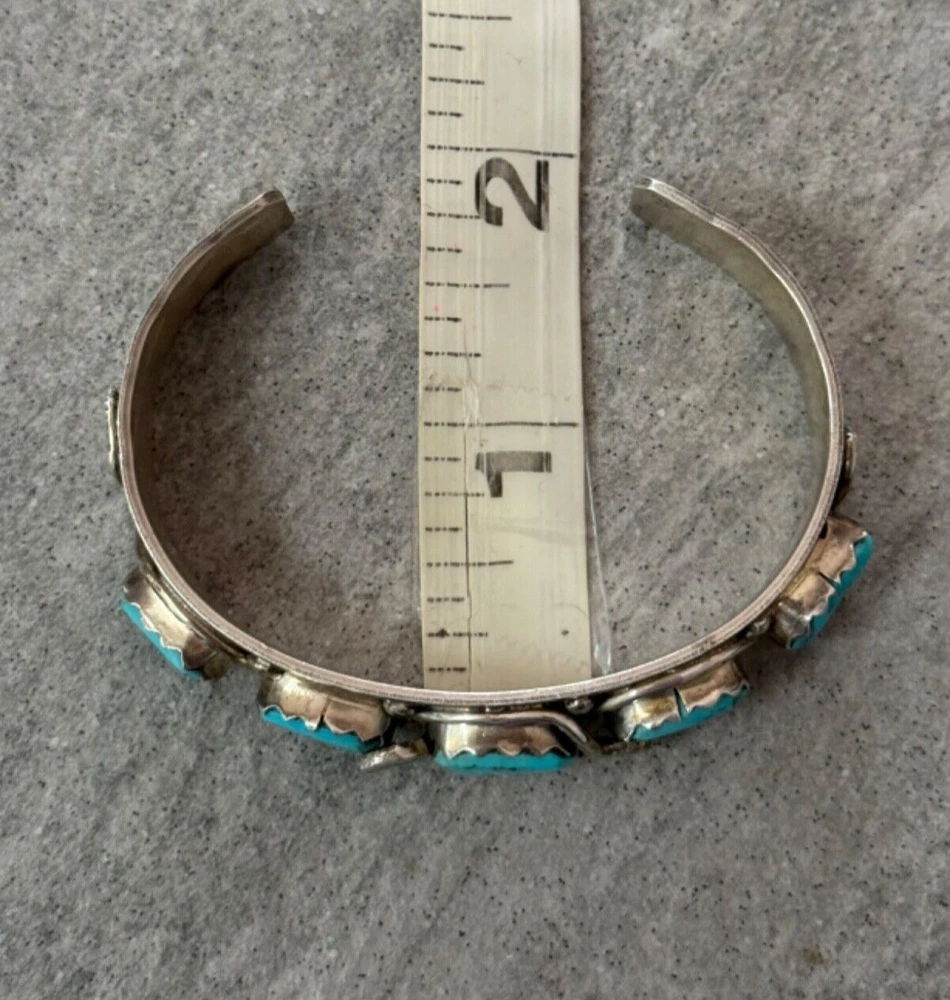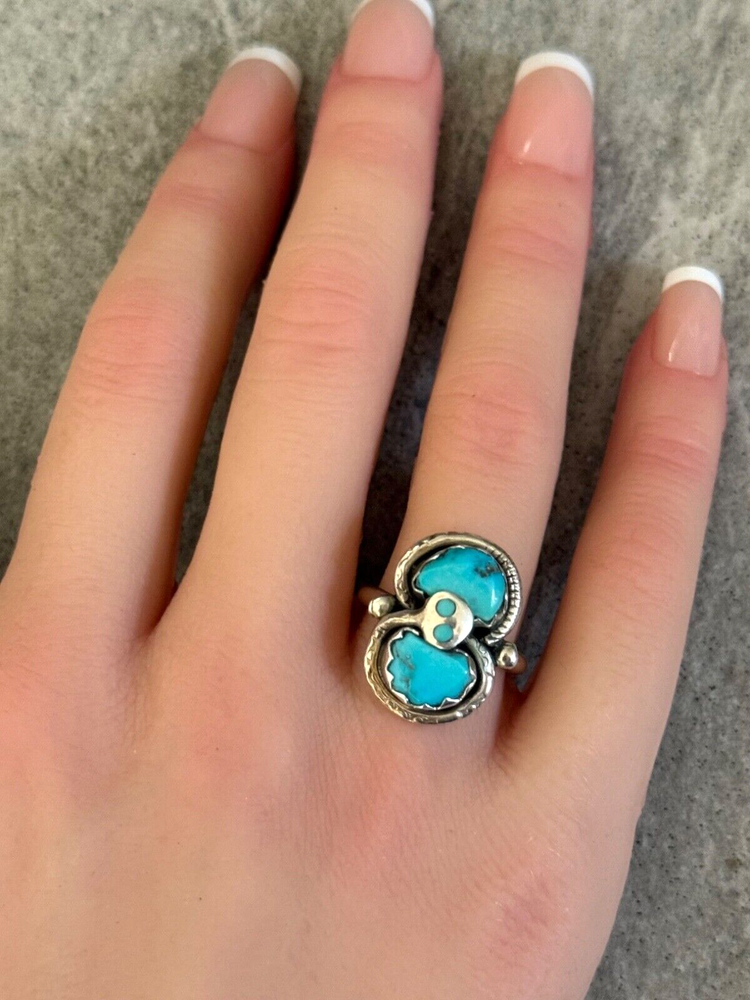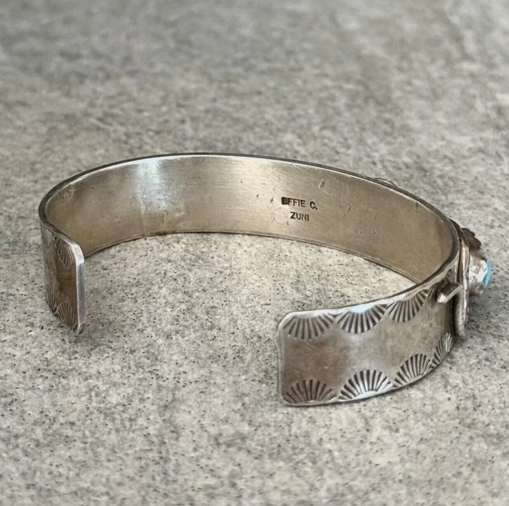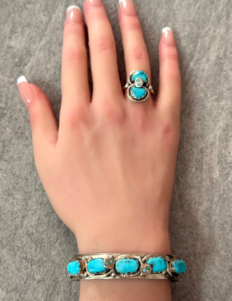 This is an amazing Vintage Zuni Rattlesnake sterling silver bracelet, ring and earrings set. This set features natural Hand cut High grade 11 sleeping beauty turquoise gem stones. There is no purity mark ,however it has been tested positive for sterling silver. Signed by renowned Zuni artist Effie Calavaza (1927-2019). The inside measurement of the bracelet from tip to tip is approximately 5-3/8" and the opening measurement between the tip is approximately 1-1/4" Approximate width of the bracelet is 2-1/2"(across inside). Approximate height of the bracelet center/face is 1/2"(measured from center of the bracelet). Sturdy 35.2 grams in my scale. Ring size is 6.5 (6-1/2) in my ring sizer. Approximate height of the ring is 7/8" Approximate size of the earrings are 1-1/4"L, 1/2"W Approximate total weight of the set is 53g in my scale. This bracelet would be a great addition to any Native American or Southwestern jewelry collection. Also this amazing jewelry set is a timeless beauty with lots of good energy! SMOKE AND PET FREE ENVIRONMENT. If you have any question please contact me via eBay messages and PLEASE CHECK MY OTHER LISTINGS AS WELL! THANK YOU FOR STOPPING BY!