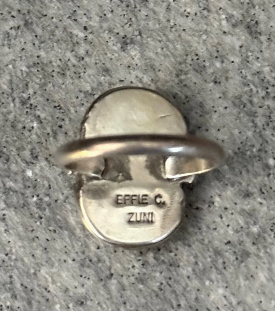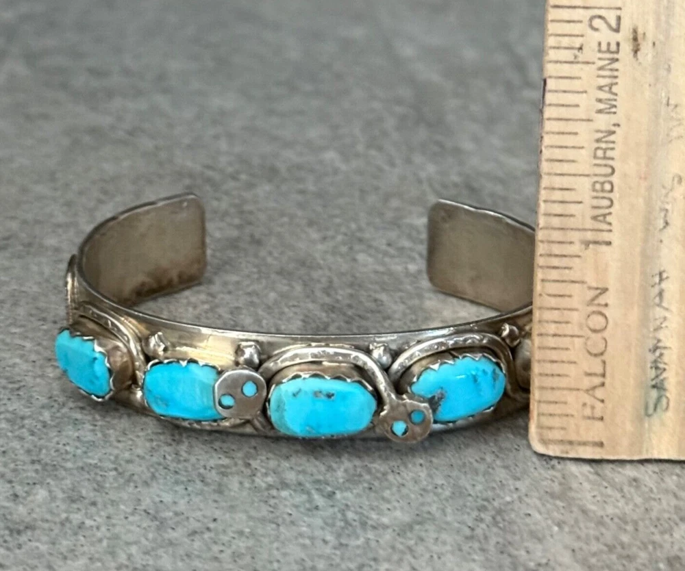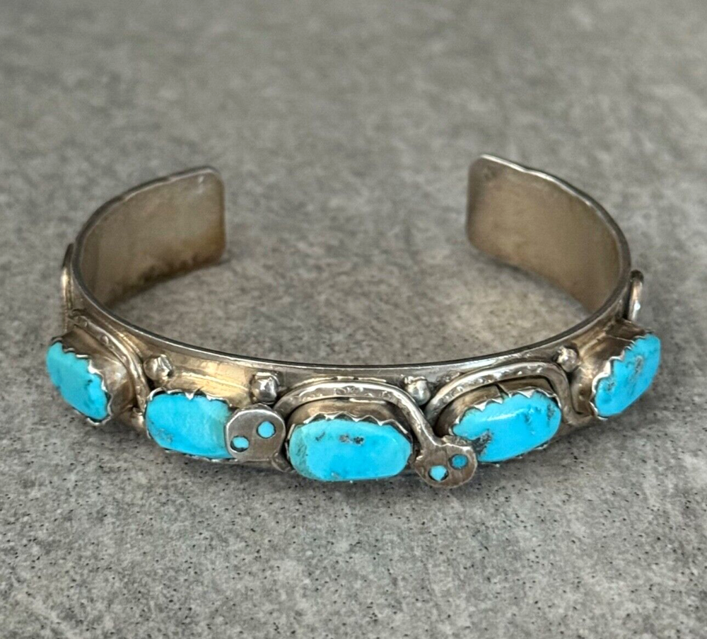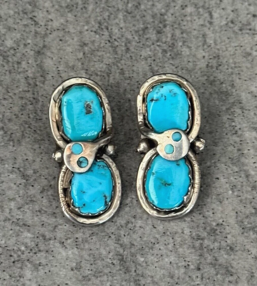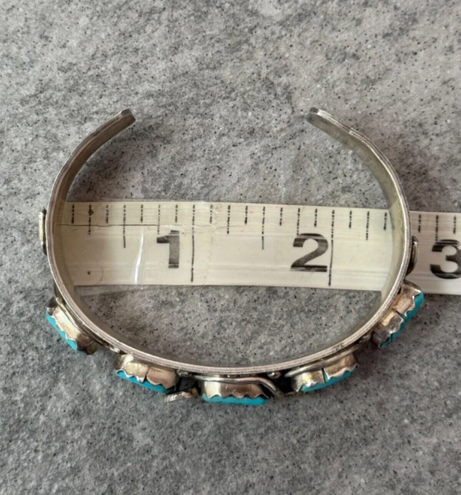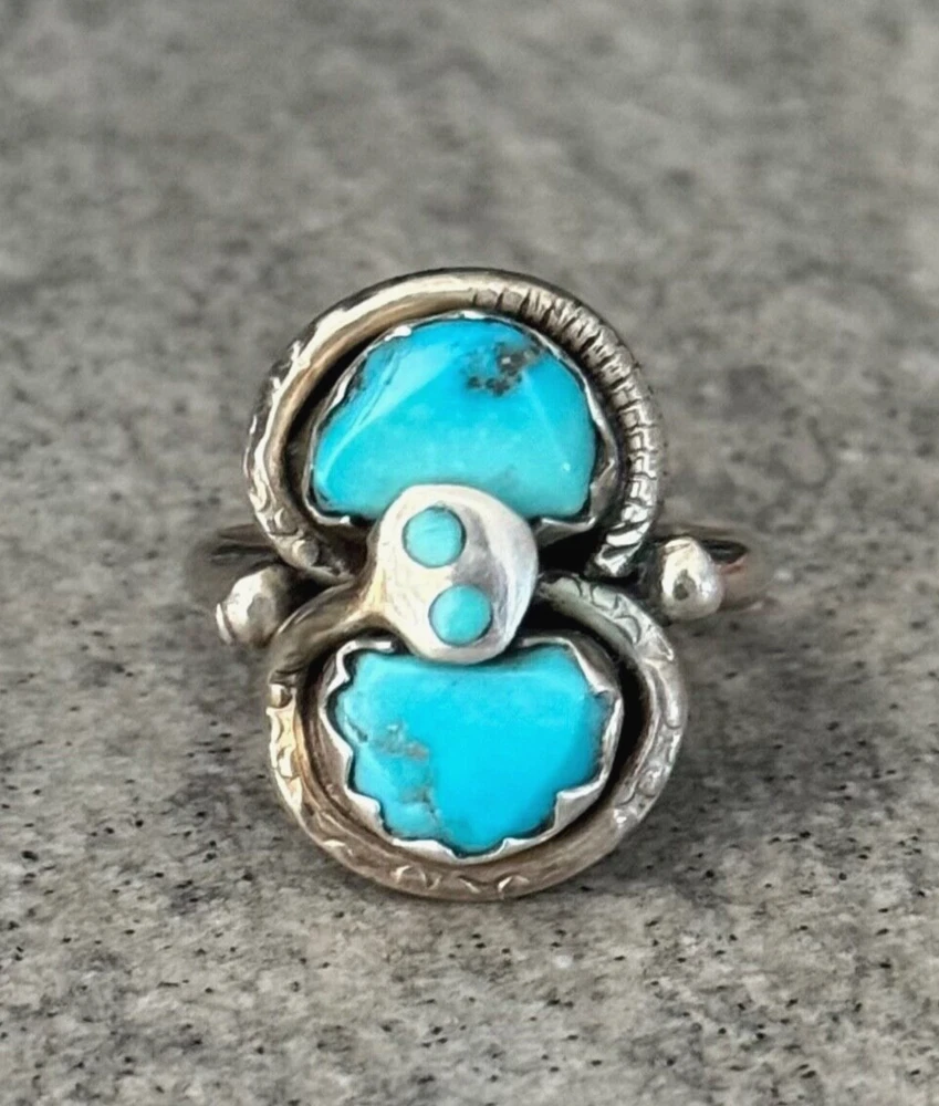 This is an amazing Vintage Zuni Rattlesnake sterling silver bracelet, ring and earrings set. This set features natural Hand cut High grade 11 sleeping beauty turquoise gem stones. There is no purity mark ,however it has been tested positive for sterling silver. Signed by renowned Zuni artist Effie Calavaza (1927-2019). The inside measurement of the bracelet from tip to tip is approximately 5-3/8" and the opening measurement between the tip is approximately 1-1/4" Approximate width of the bracelet is 2-1/2"(across inside). Approximate height of the bracelet center/face is 1/2"(measured from center of the bracelet). Sturdy 35.2 grams in my scale. Ring size is 6.5 (6-1/2) in my ring sizer. Approximate height of the ring is 7/8" Approximate size of the earrings are 1-1/4"L, 1/2"W Approximate total weight of the set is 53g in my scale. This bracelet would be a great addition to any Native American or Southwestern jewelry collection. Also this amazing jewelry set is a timeless beauty with lots of good energy! SMOKE AND PET FREE ENVIRONMENT. If you have any question please contact me via eBay messages and PLEASE CHECK MY OTHER LISTINGS AS WELL! THANK YOU FOR STOPPING BY!