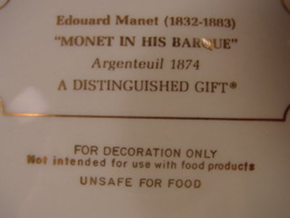 1081/11 BEAUTIFUL EDWARD MANET "MONEY IN HIS BARQUE" ART PORCELAIN PLATE This is a Wonderful Edward Manet Porcelain ART Plate featuring "Money in His Barque". It measures 10 inches in diameter. It is in good condition with little wear, and is marked on the back. This would be great to decorate with or add to any Collection. ~ ~ MORE COLLECTOR PLATES IN MY EBAY STORE ~ ~