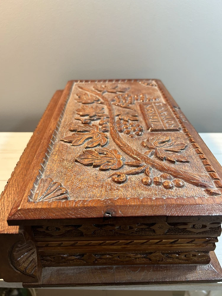 vintage large hand carved Folk Art Wood Box, Leaves , Branches Romania . Box measures 15.5 inches long, 10 inches wide 5 inches tall and 9.5 deep. Not sure of use or origin but beautiful work of art. Very good condition
