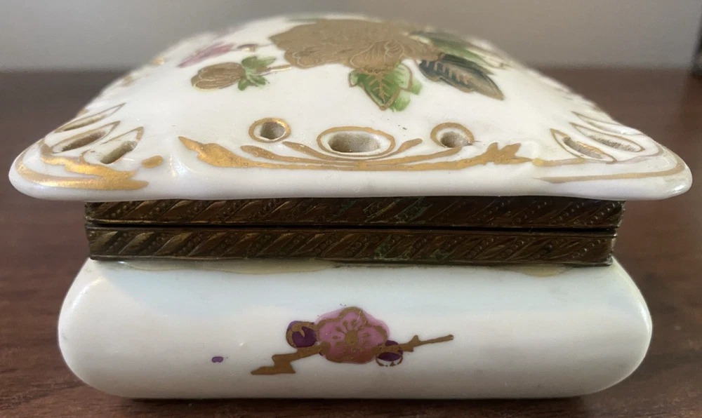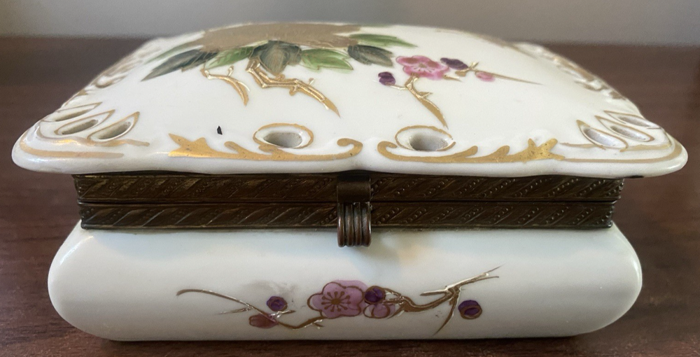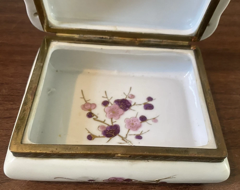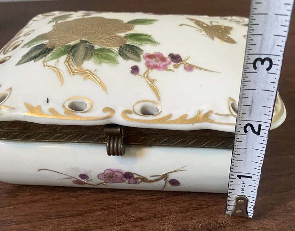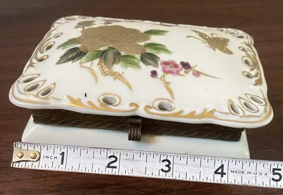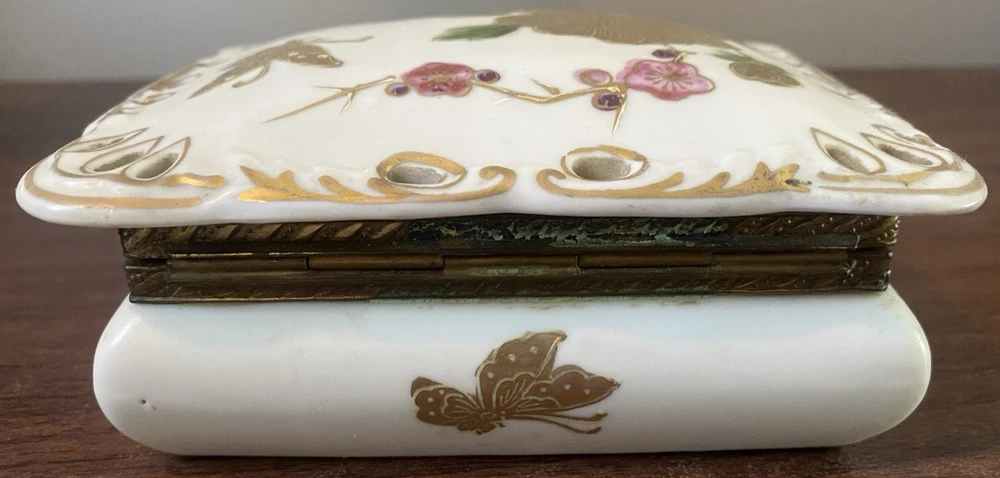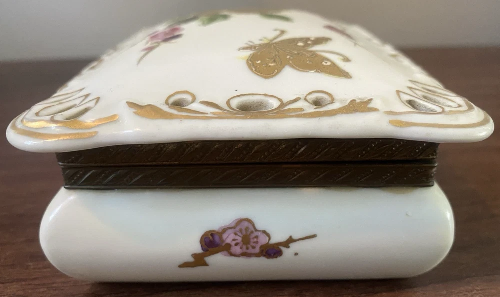 Delve into the elegance of vintage porcelain with this exquisite trinket jewelry box, a true keepsake from a bygone era. Adorned with a tasteful floral and butterfly motif, it boasts a white background that serves as a canvas for the intricate gold detailing, making it a charming addition to any collection.Crafted from the finest porcelain, this original piece showcases the beauty and durability of traditional craftsmanship. Whether used to store cherished jewelry or displayed as a decorative item, it brings a touch of nostalgia and sophistication to any setting. Please note that on the inside of the box, on the inside as shown in photos, there is a small piece of additional material that seems to be original. Lovely on a vanity or dresser.