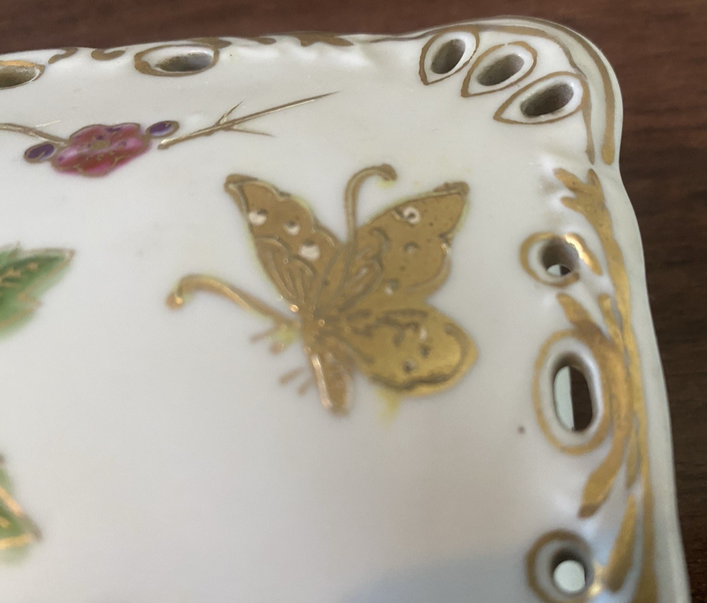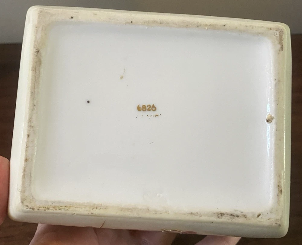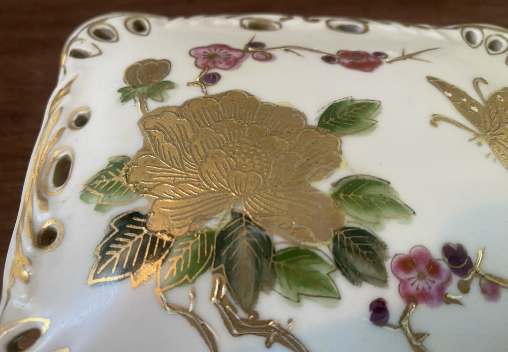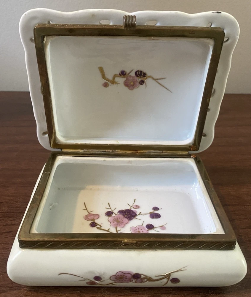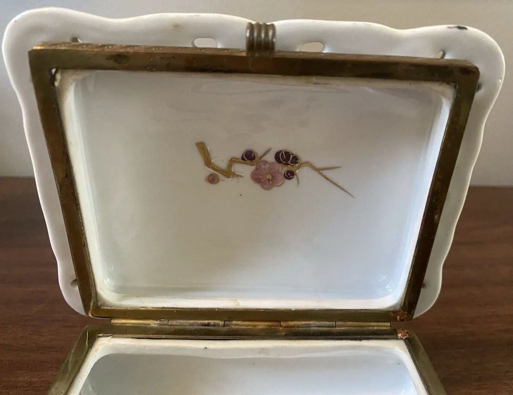 Delve into the elegance of vintage porcelain with this exquisite trinket jewelry box, a true keepsake from a bygone era. Adorned with a tasteful floral and butterfly motif, it boasts a white background that serves as a canvas for the intricate gold detailing, making it a charming addition to any collection.Crafted from the finest porcelain, this original piece showcases the beauty and durability of traditional craftsmanship. Whether used to store cherished jewelry or displayed as a decorative item, it brings a touch of nostalgia and sophistication to any setting. Please note that on the inside of the box, on the inside as shown in photos, there is a small piece of additional material that seems to be original. Lovely on a vanity or dresser.