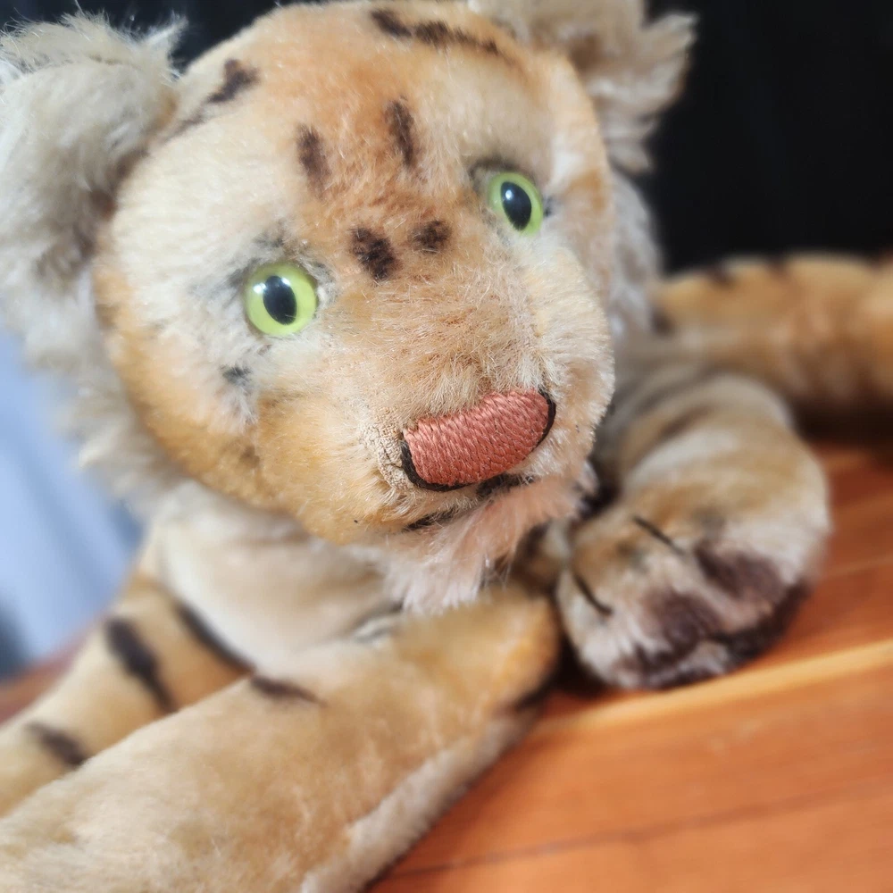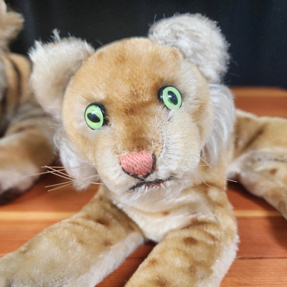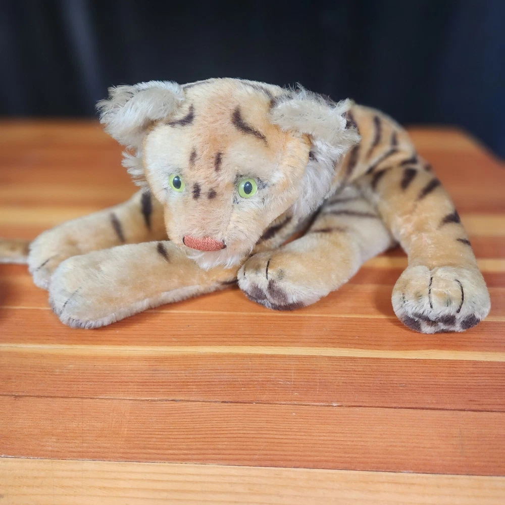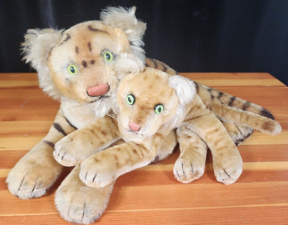 Vintage set 1950's to 60's Steiff Mo-Hair Laying Bengal Tiger and Cub plush toys. No tags are attached. Vintage plush items. Imperfections can and will be found. Please look at pictures for full condition. Feel free to ask for more if needed. Mom has an approximately 13" body and a 8" tail. Tail shows some/small wear. Cub has a 9" body and a 5" tail. Cub has dots and not stripes, looks like it is a rarer variety. No holes or rips that I can find in either. Both have luminescent eyes Hi and welcome to my store. I always strive to offer the highest quality vintage, new, used or unique items I can find. Much of my inventory has been previously used. I always try to find the most gently used items I can find but this does mean that minor imperfections may be present. I will always try and put these imperfections in the item description. Please use the pictures as a guide to the item's condition. Be aware that due to camera limitations minor differences in color can occur. If you ever have any problems or issues with an item that you have purchased please do not hesitate to reach out to me so I can correct or address the situation. I always try and respond to or accommodate all questions about items I am selling. I will offer the fastest and safest shipping with care that I am able to. Thank you for your business and support. Have a great day I look forward to filling your order. Sincerely Coopadoopas