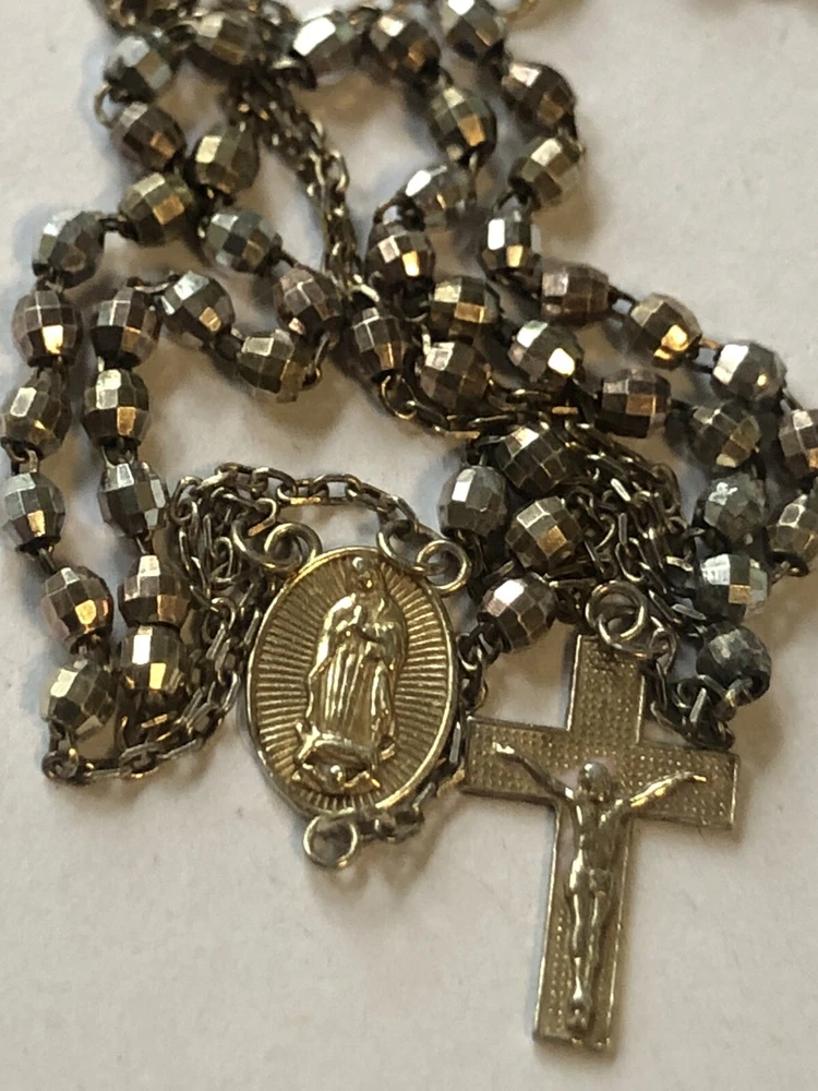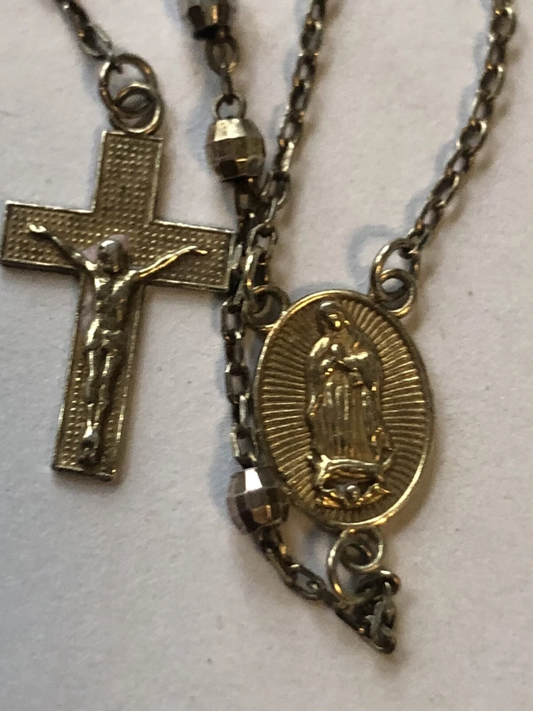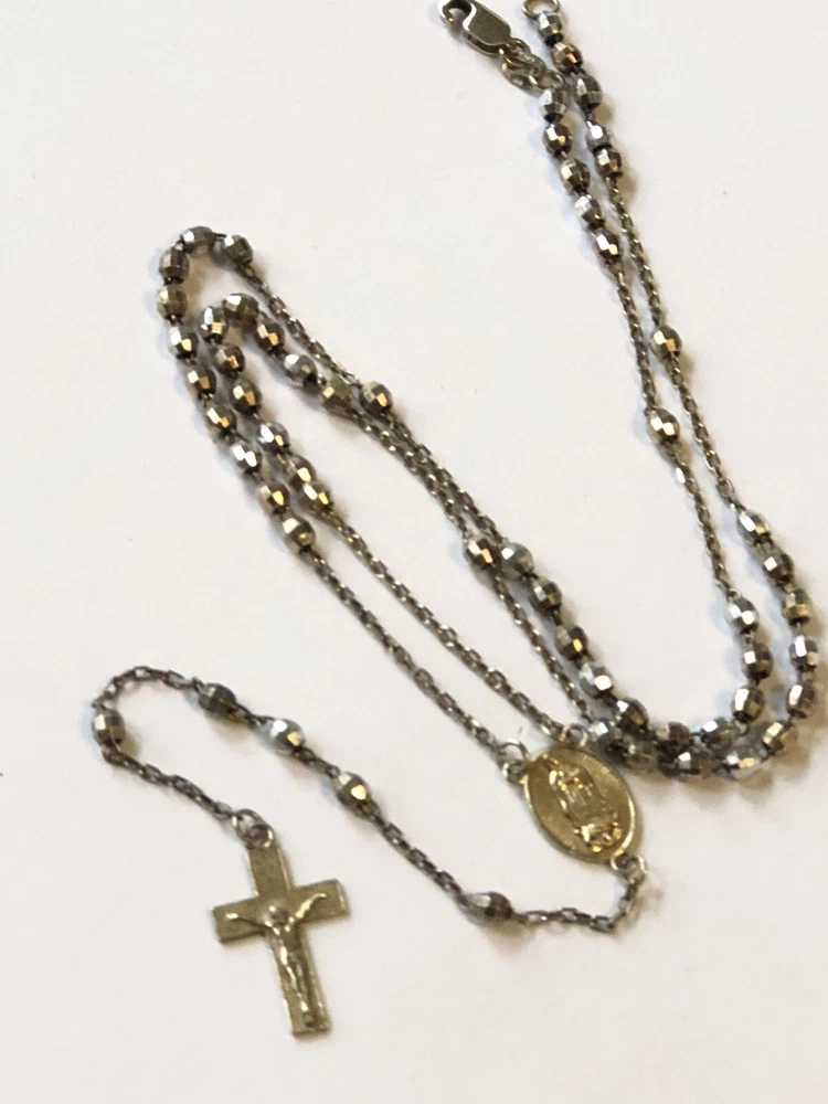 Awesome quality vintage piece very petite light weight designed , this is a designer signed piece purchased as Macys department store decades ago 18 “ necklace with a 4” Crucifix and medallion pendant drop .. has a disco ball look to it , all sterling silver with areas of the Sterling that were played with 14th gold