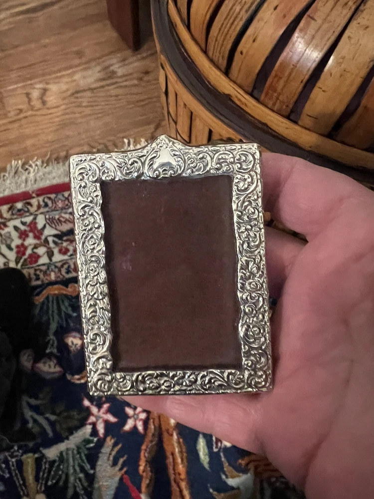 Crafted with an eye for elegance, this vintage 2 x 3 picture frame infuses a touch of Art Nouveau style into your home decor. The frame boasts a hammered sterling silver sheet with flowers and a heart at the top, attached to the front, providing a classic and sophisticated finish that complements any room.Measuring 3 1/4" in height and 2 1/4" in length, this frame is perfect for showcasing your cherished photos. The Sterling brand ensures quality and durability, while the silver color offers a timeless appeal that seamlessly blends with various interior design themes.