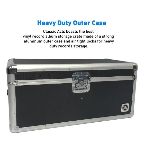 Product details Are you tired of the stacks of your vinyl records laying around unprotected? Forget the milk crate and wooden crates for storing your vinyl records! Classic Acts offers the perfect organizer storage product to protect your lps in between the time when you listen to the records. Made from strong aluminum, our storage crates boast heavy duty protection better than any wooden storage or milk crate for your vinyl records. Each vinyl record crate is equipped with a plush foamed roof, felt sides and air tight locks for protection against dust and any mishandling. Not only does each crate come with the best record storage, it also comes with a solid case handle sturdy enough for all heavy lifting and keeps each album safe and sound inside unlike faulty wood storage. Classic Acts boasts a large vinyl player storage amount that fits up to 75 doubles and up to 150 singles. Many record player companies’ offer a wooden table or wooden crate for storage but Classic Acts with its heavy duty aluminum and overall interior protection can give you and your vinyl records the best quality guaranteed. Heavy Duty Outer Case- Classic Acts boasts the best vinyl record album storage crate made of a strong aluminum outer case and air tight locks for heavy duty records storage. Overall Interior Protection- Each of our vinyl record crates is equipped with a plush foamed roof, felt sides and air tight locks to keep your vinyl records safe from dust and falls. Solid Case Handle - Forget the milk crate and wooden crates to keep your records safe, Classic Acts provides a sturdy handle for heavy lifting. Large Quantity Storage- While many record player storage organizer storage products can only store a certain limit, Classic Acts’ lps crate can fit up to 100 doubles and up to 150 singles.