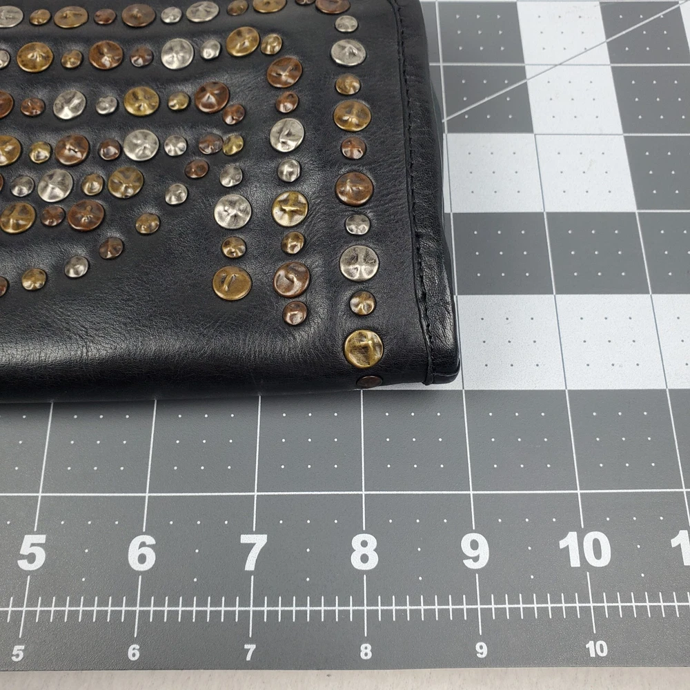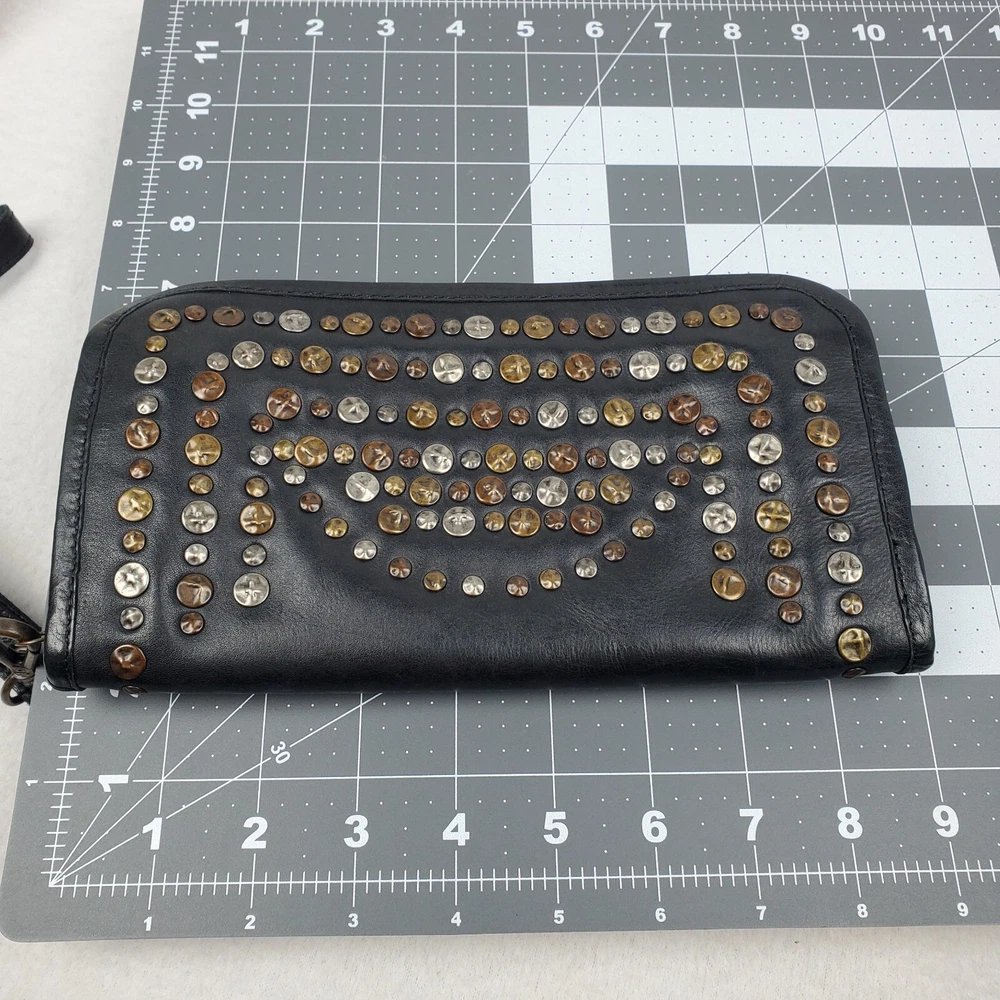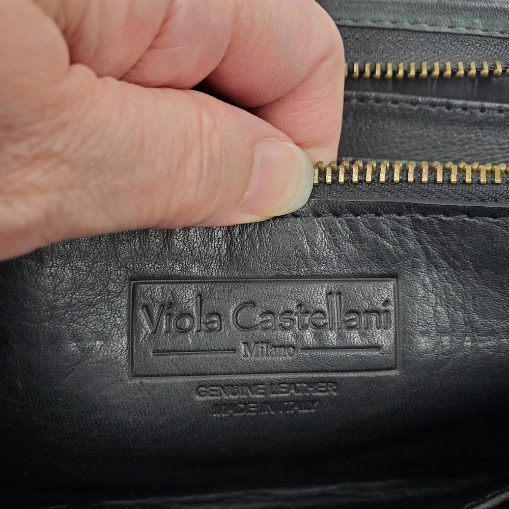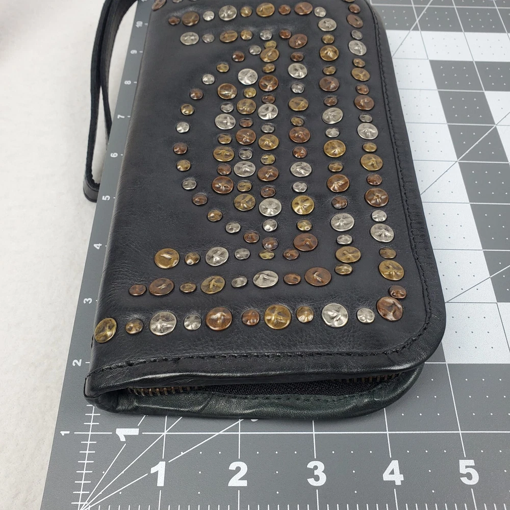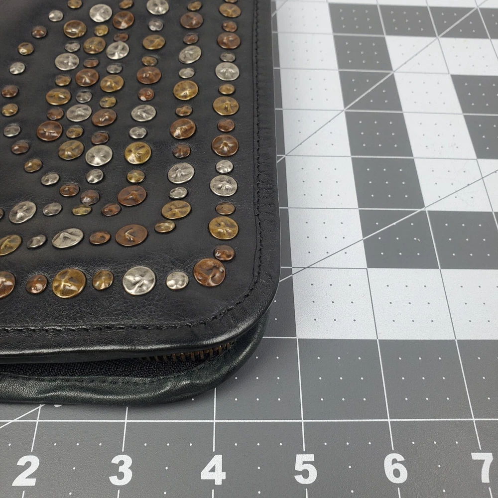 Viola Castellani Italian Soft Black Leather Studded Zip Around Wallet Wristlet Clutch Shows 2 spots to inside credit card slots from use/handling shown in pic #15, please view all pics. Does not effect function or design Approximate Measurements: Height: 4.5 in Width: 9 in Depth: 1 in