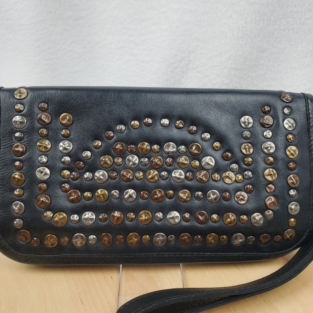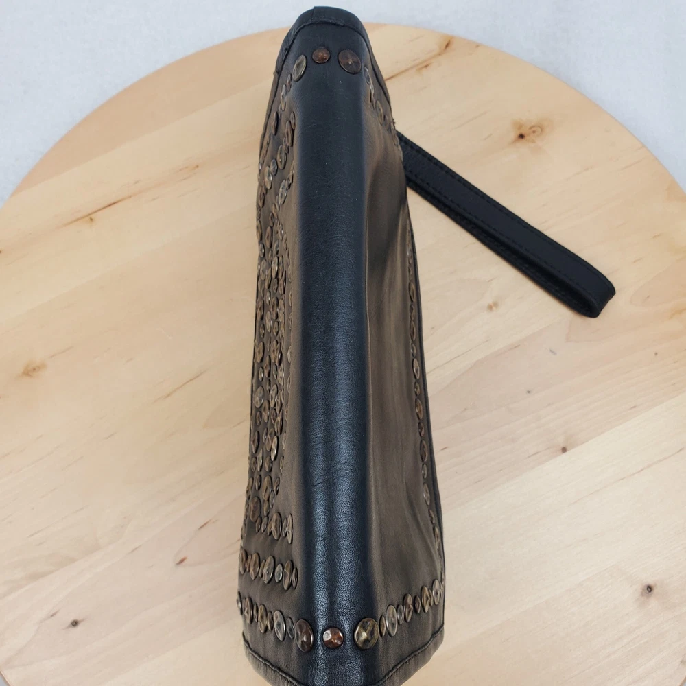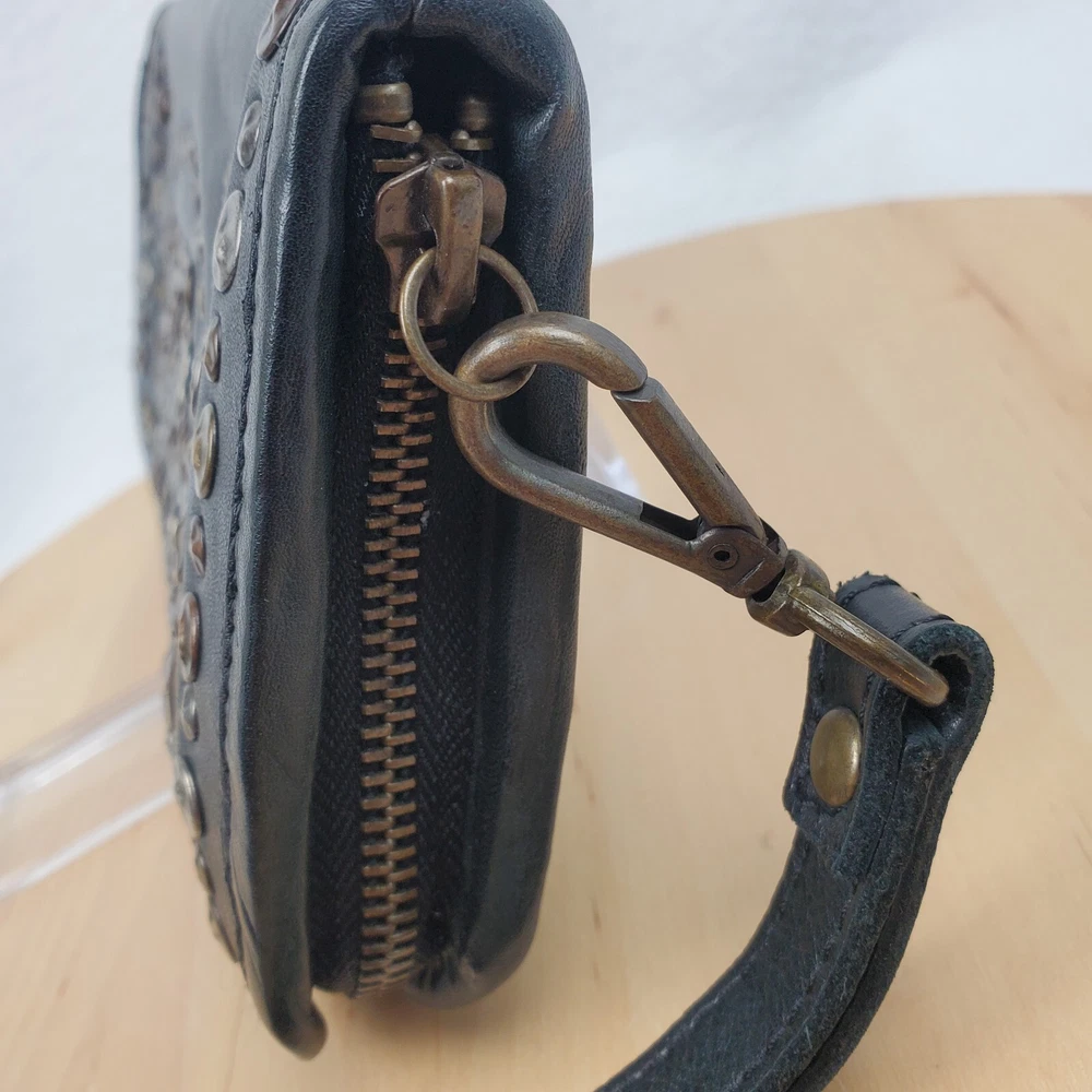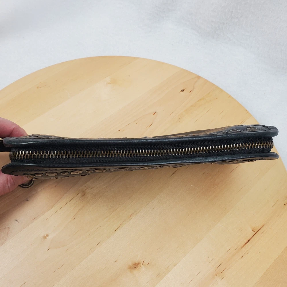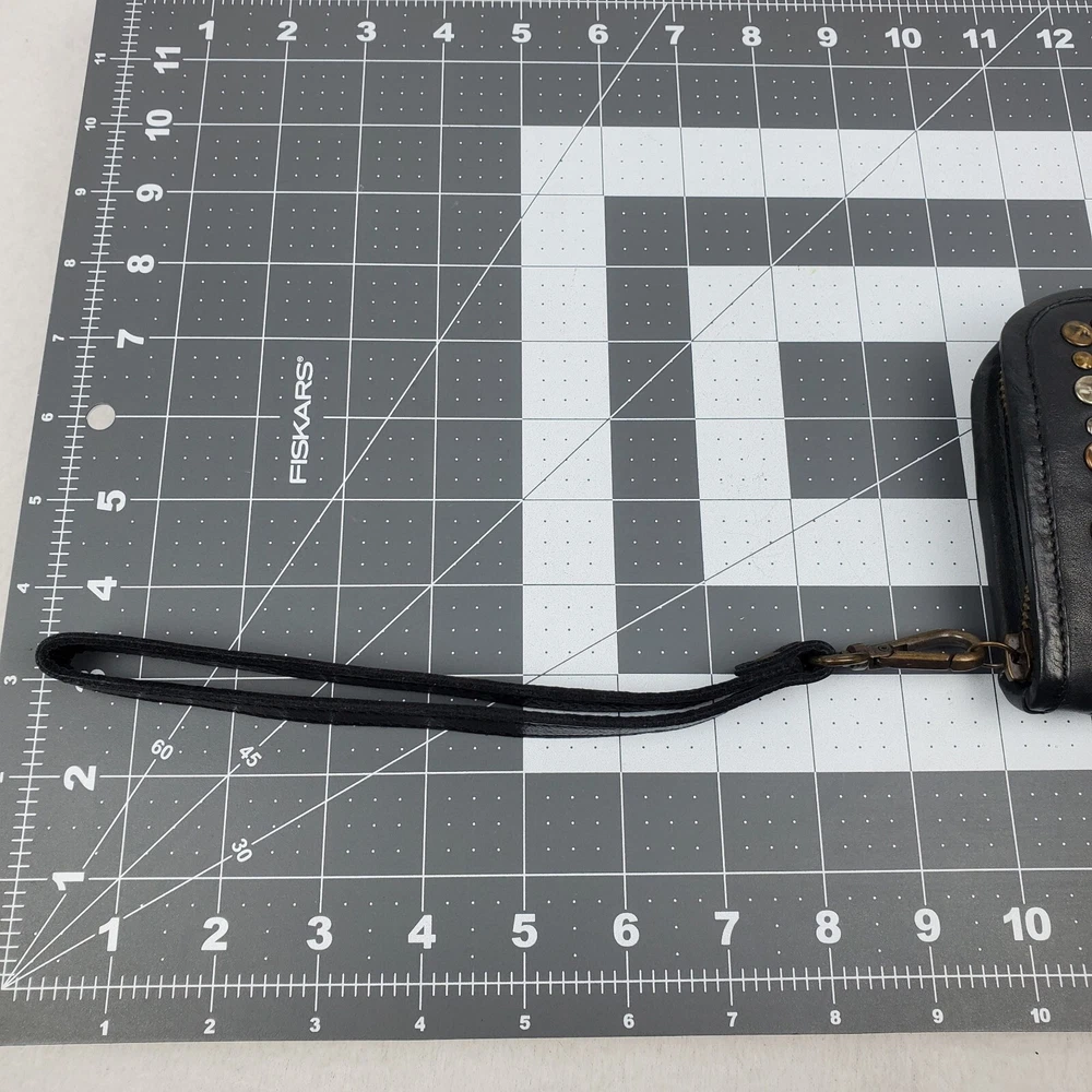 Viola Castellani Italian Soft Black Leather Studded Zip Around Wallet Wristlet Clutch Shows 2 spots to inside credit card slots from use/handling shown in pic #15, please view all pics. Does not effect function or design Approximate Measurements: Height: 4.5 in Width: 9 in Depth: 1 in