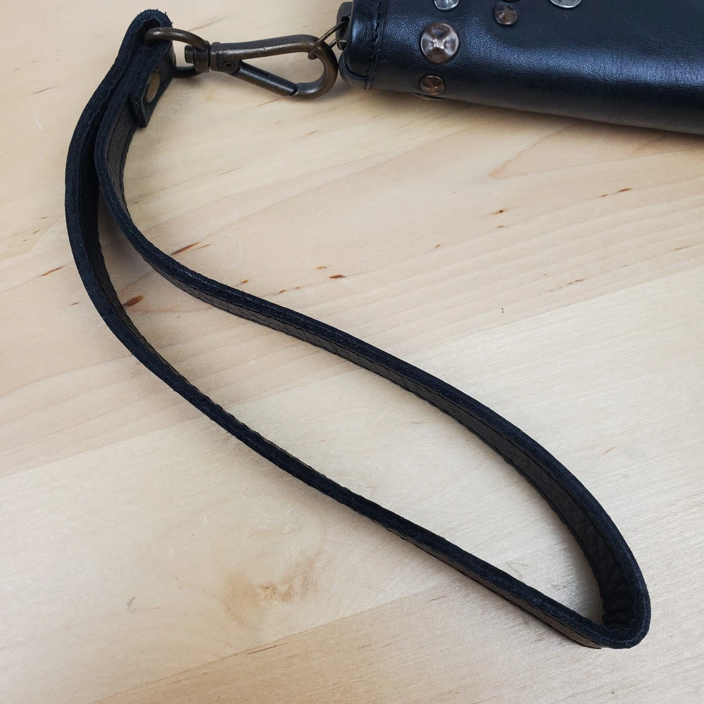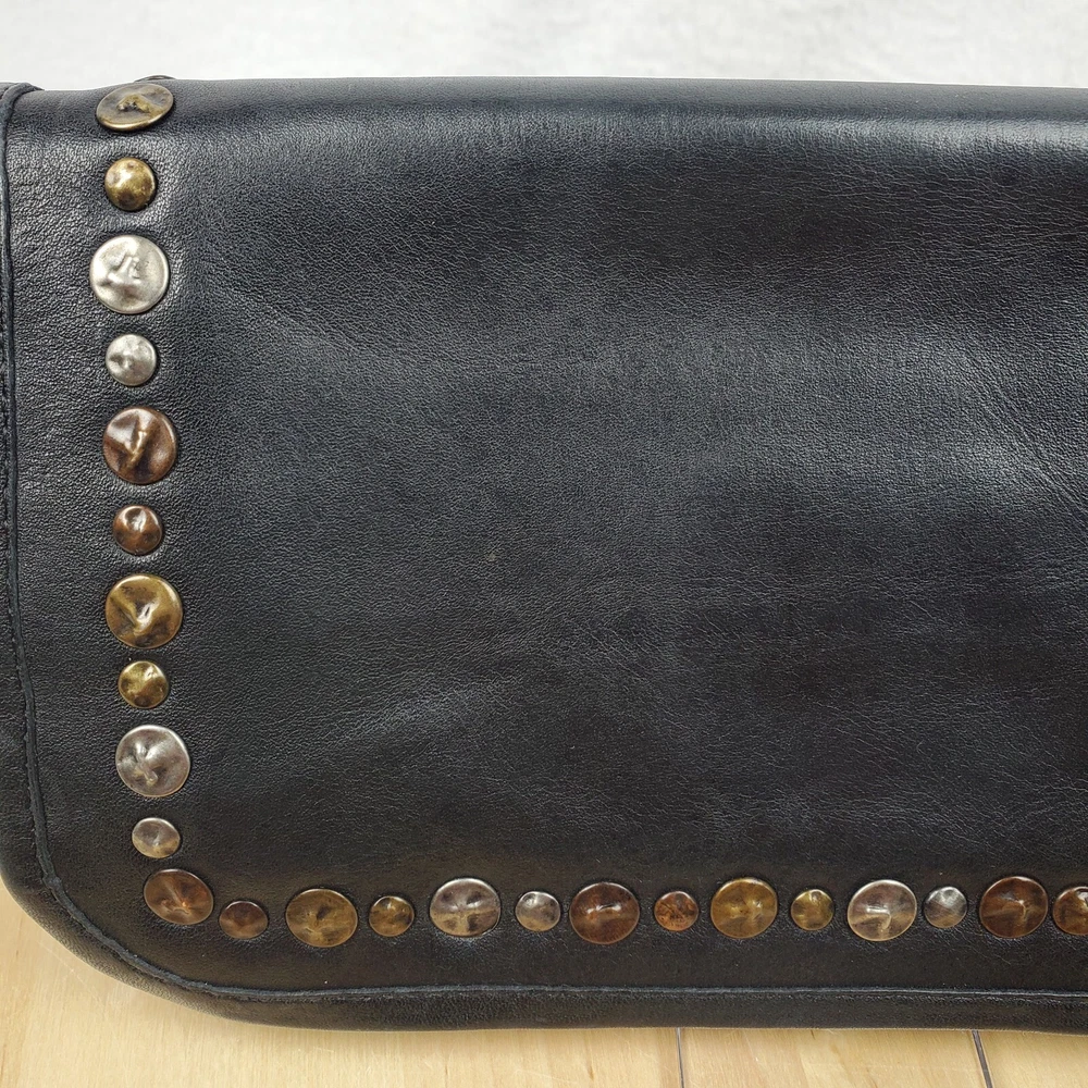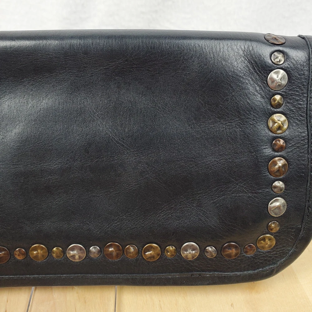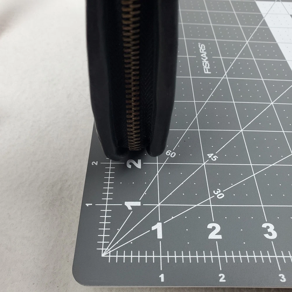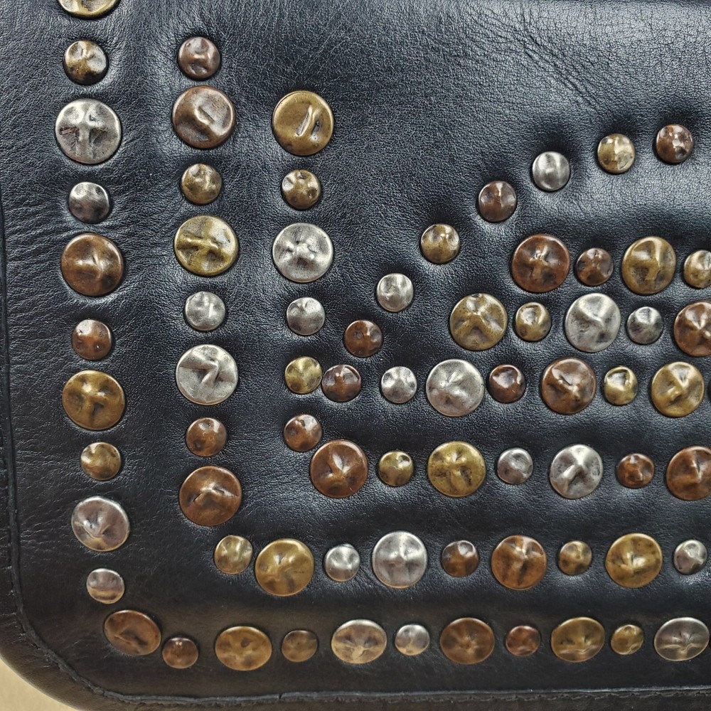 Viola Castellani Italian Soft Black Leather Studded Zip Around Wallet Wristlet Clutch Shows 2 spots to inside credit card slots from use/handling shown in pic #15, please view all pics. Does not effect function or design Approximate Measurements: Height: 4.5 in Width: 9 in Depth: 1 in