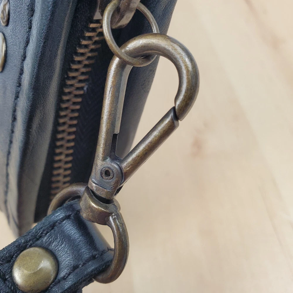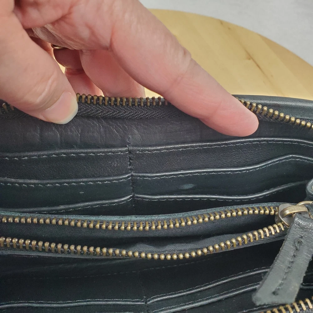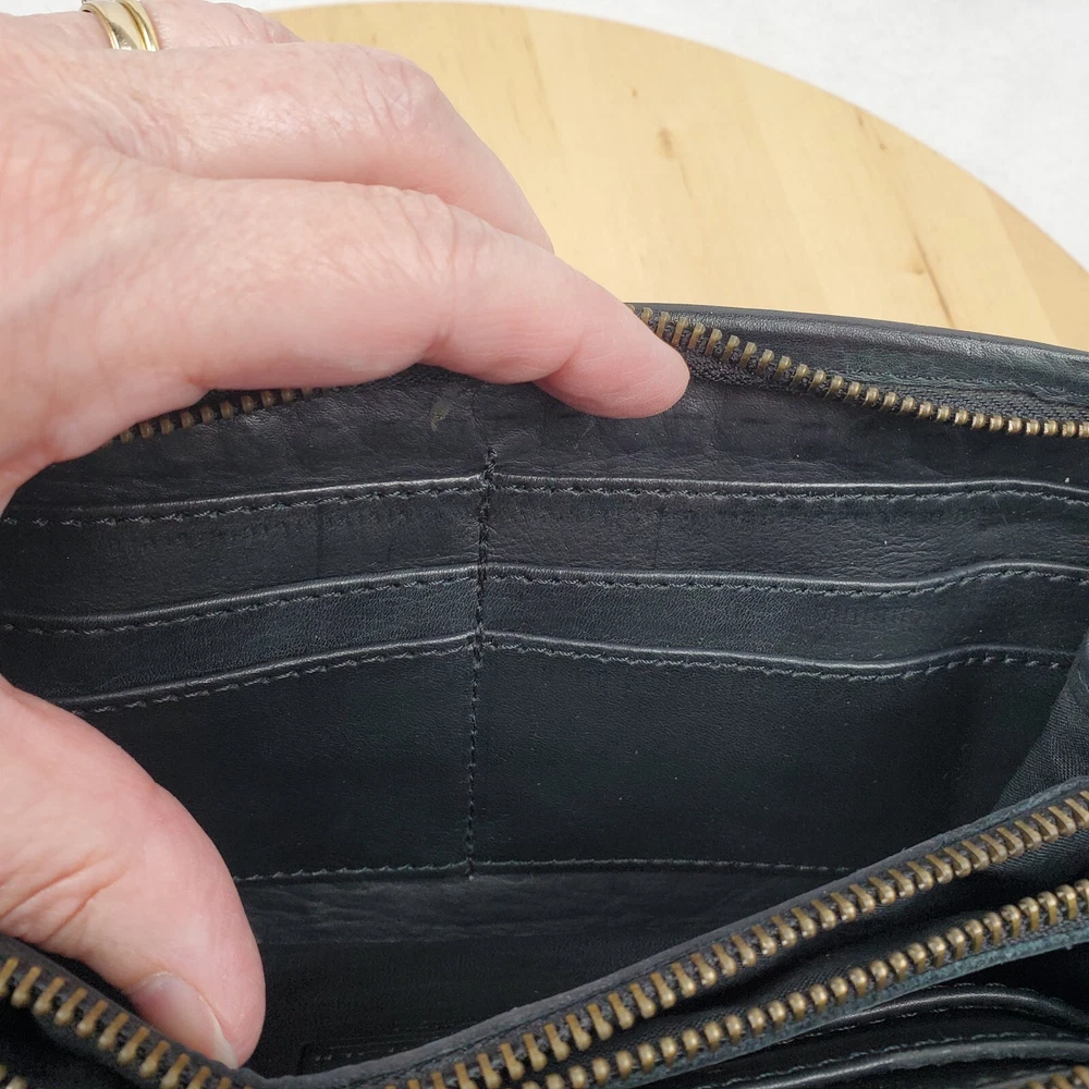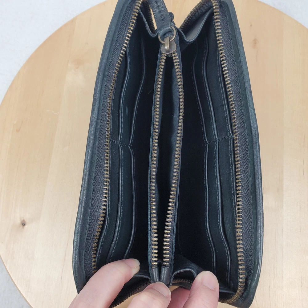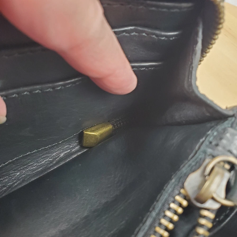 Viola Castellani Italian Soft Black Leather Studded Zip Around Wallet Wristlet Clutch Shows 2 spots to inside credit card slots from use/handling shown in pic #15, please view all pics. Does not effect function or design Approximate Measurements: Height: 4.5 in Width: 9 in Depth: 1 in