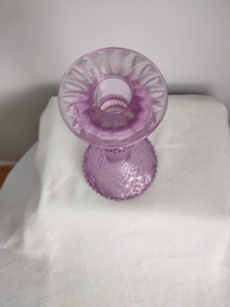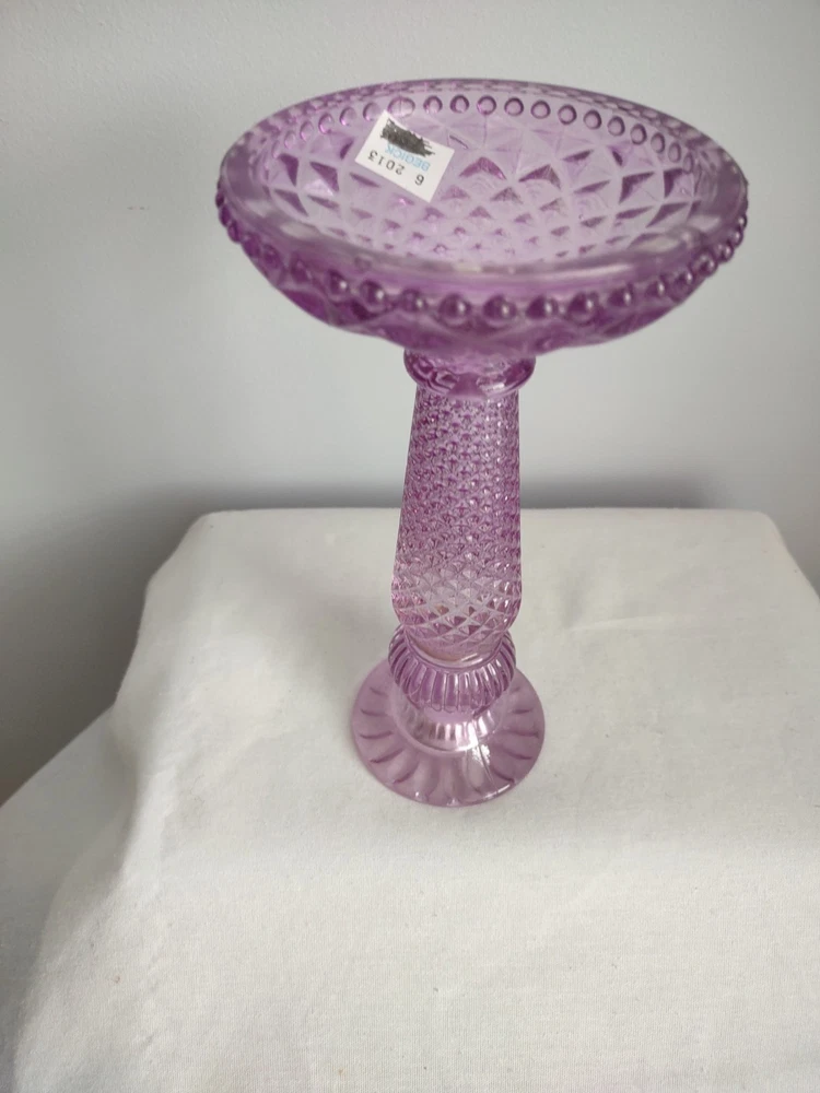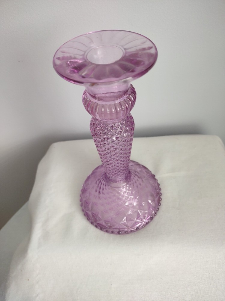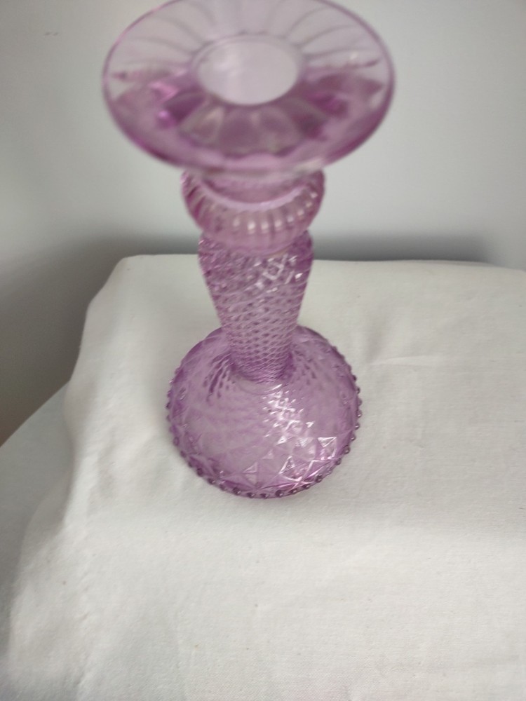 Beautiful Violet Pillar Candle Holder. The measurements are approx 7.25 inches tall, 2.25 inch round top, 4 inch round base, and holds a 1 inch round candle. Very Good Condition. Smoke Free Home