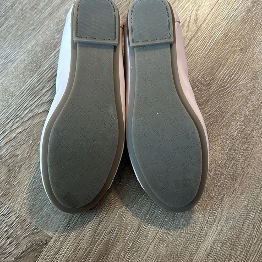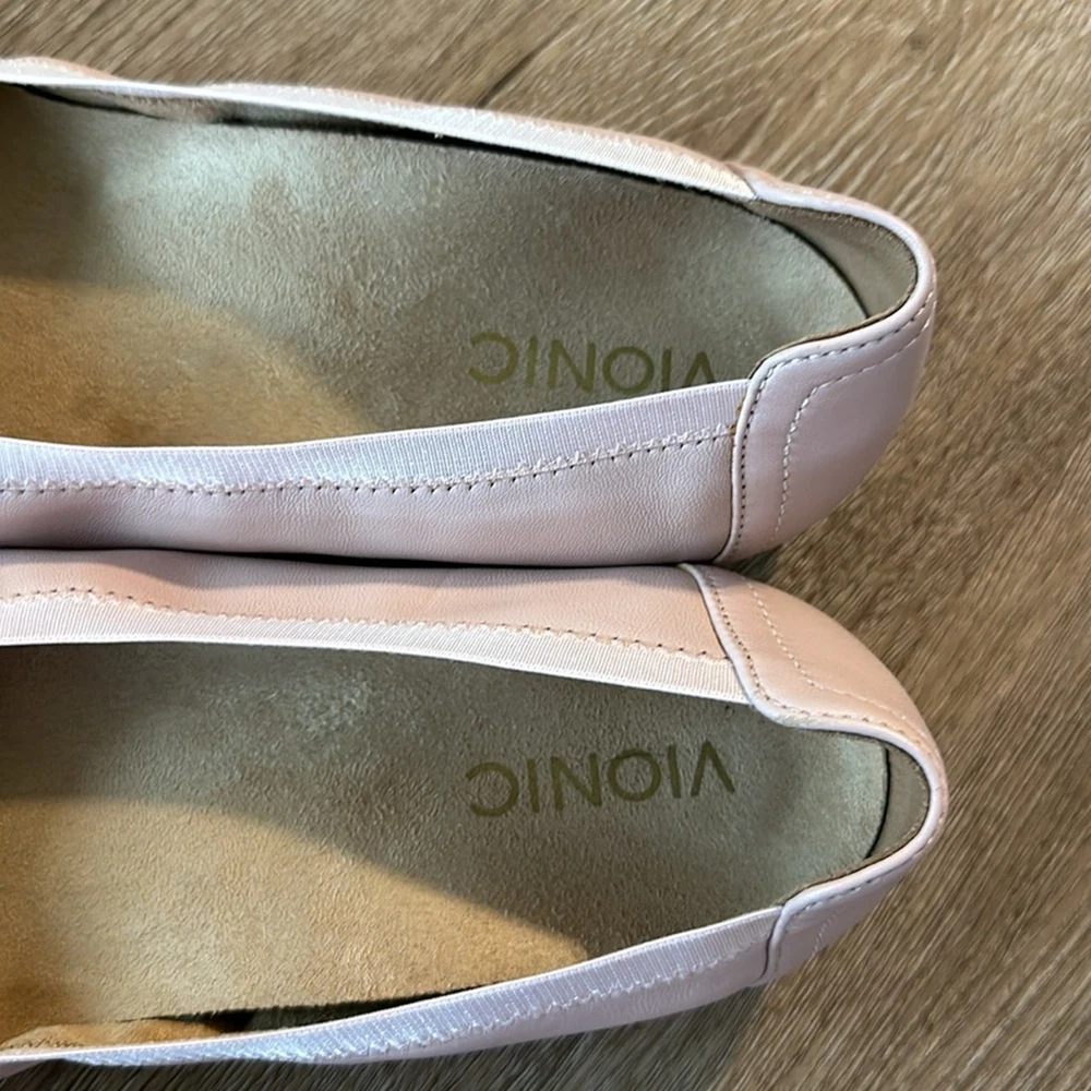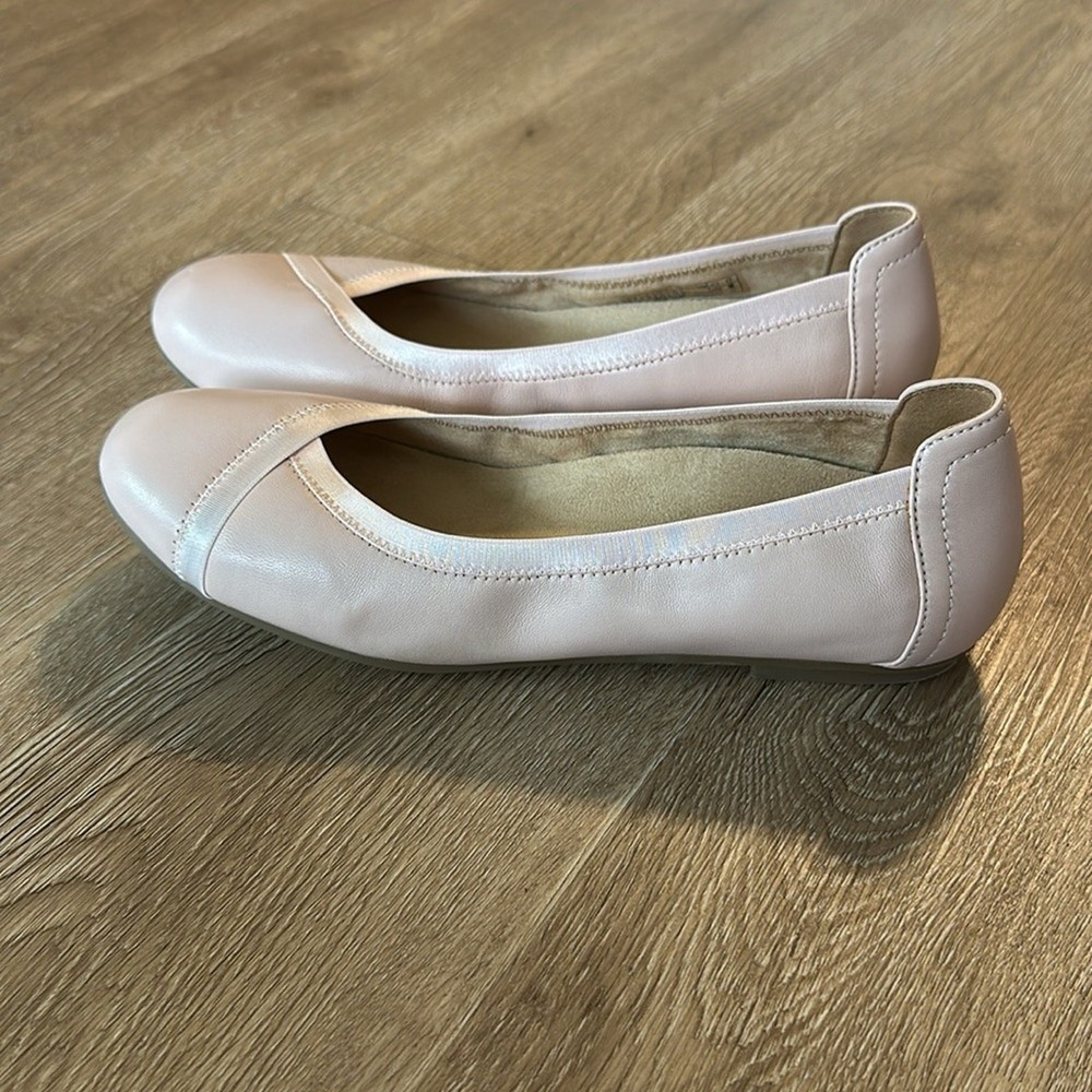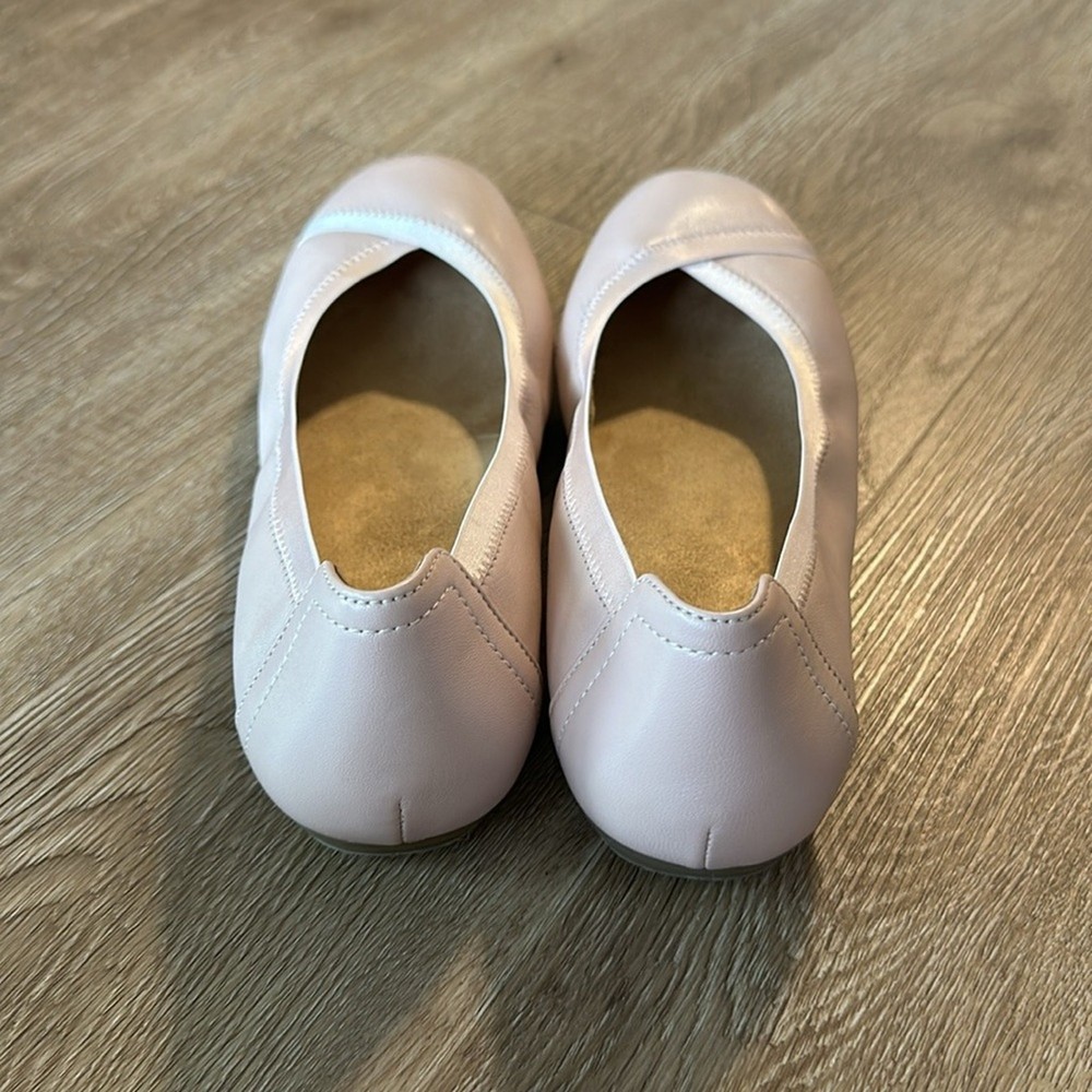 Excellent preowned condition No holes or stains; small scuff on one side, barely visible Size: 8 Color: Light Pink -Leather upper -Comfy elastic top line with cross over detail -Biomechanically designed to hug your arches -Removable microfiber wrapped footbed