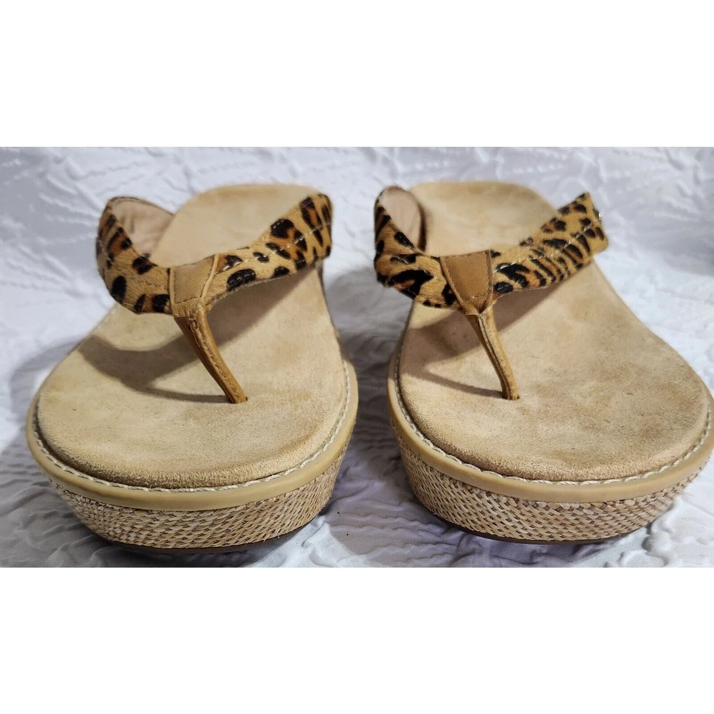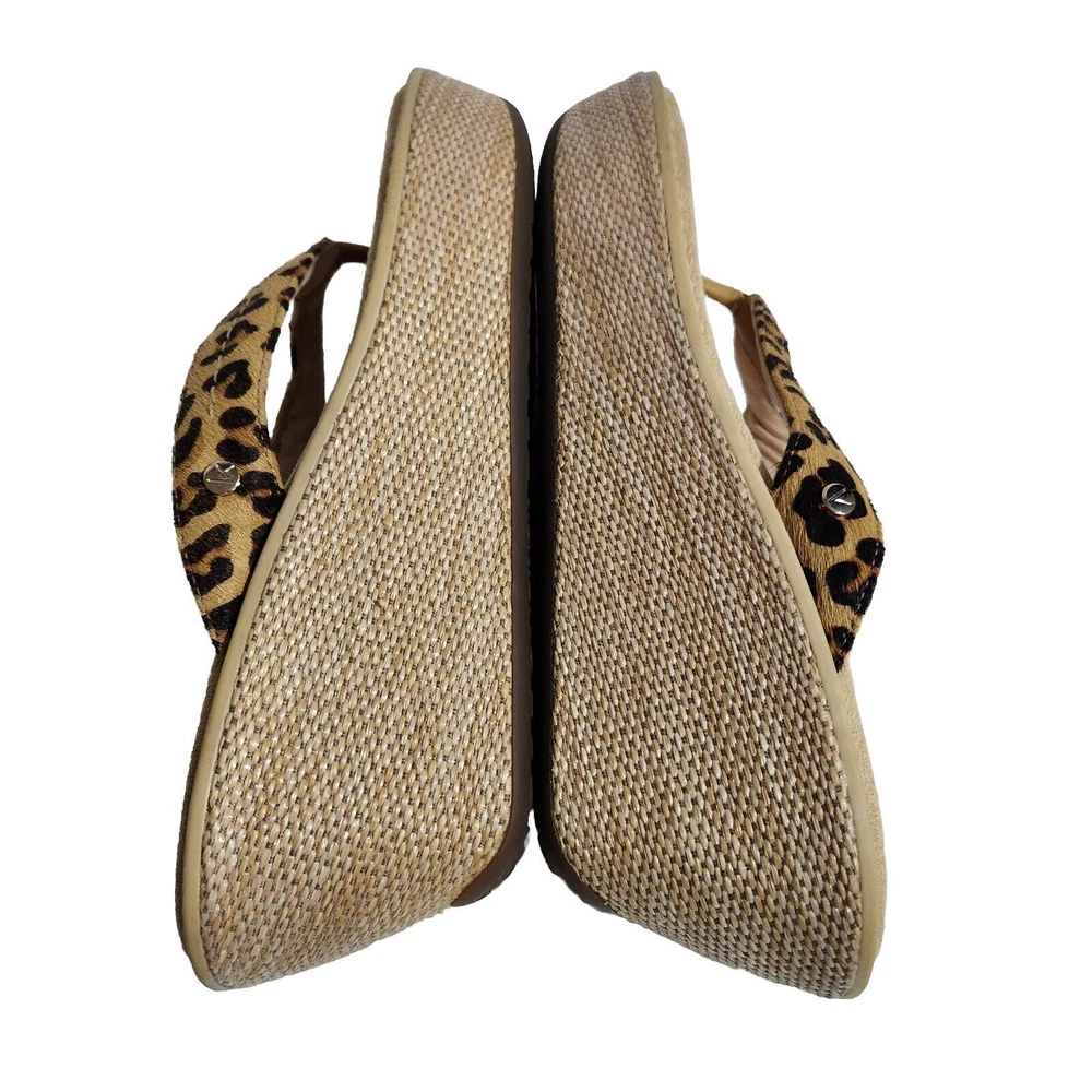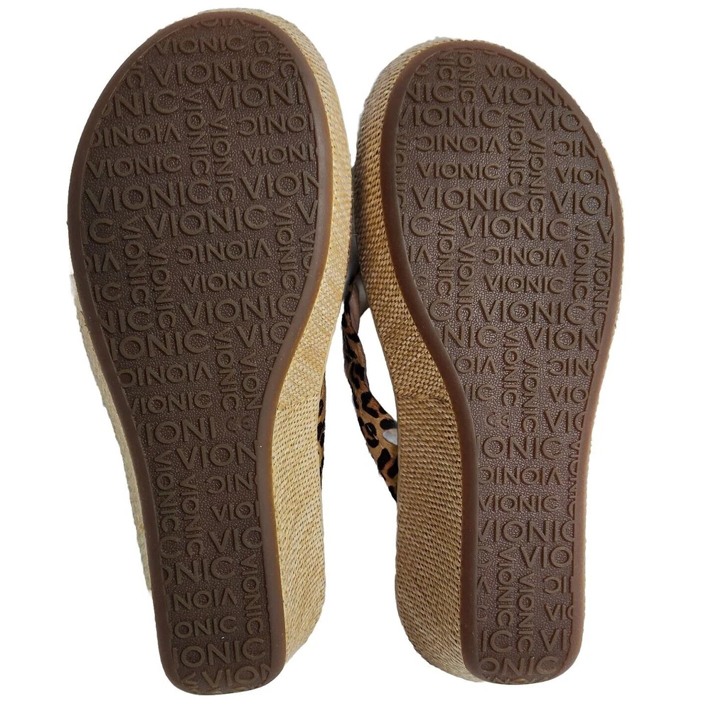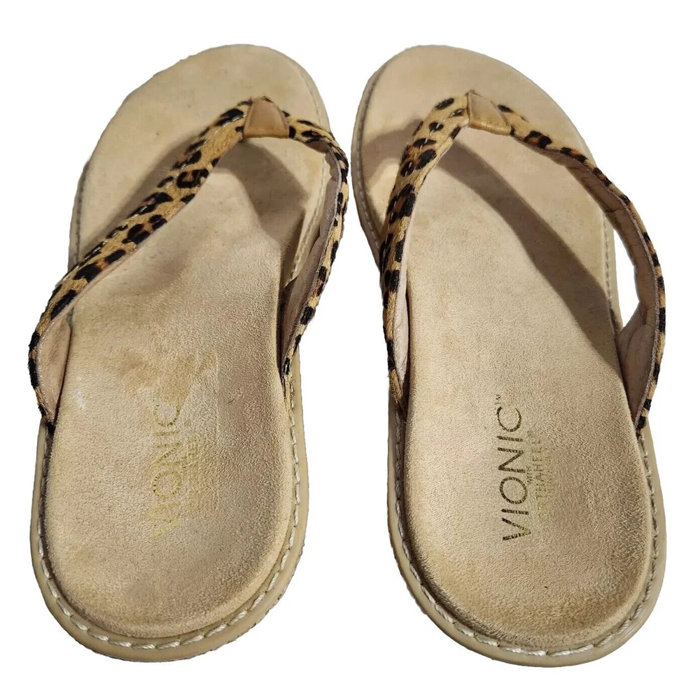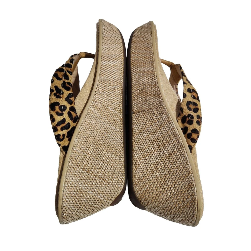 The Womens Vionic Orthaheel Grenada Leopard Print Thong Wedge Heel Sandals are a pre-owned pair of shoes designed for casual occasions. They feature a slip-on closure and a medium (B, M) shoe width. The sandals have a multicolor animal print pattern and a patent upper material. The outsole is made of rubber and the insole is made of Vionic material. The sandals are orthopedic and comfortable, with a wedge heel style. They are a size 11 and were manufactured in China.