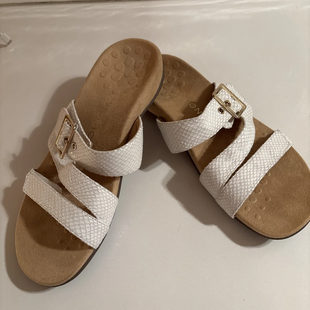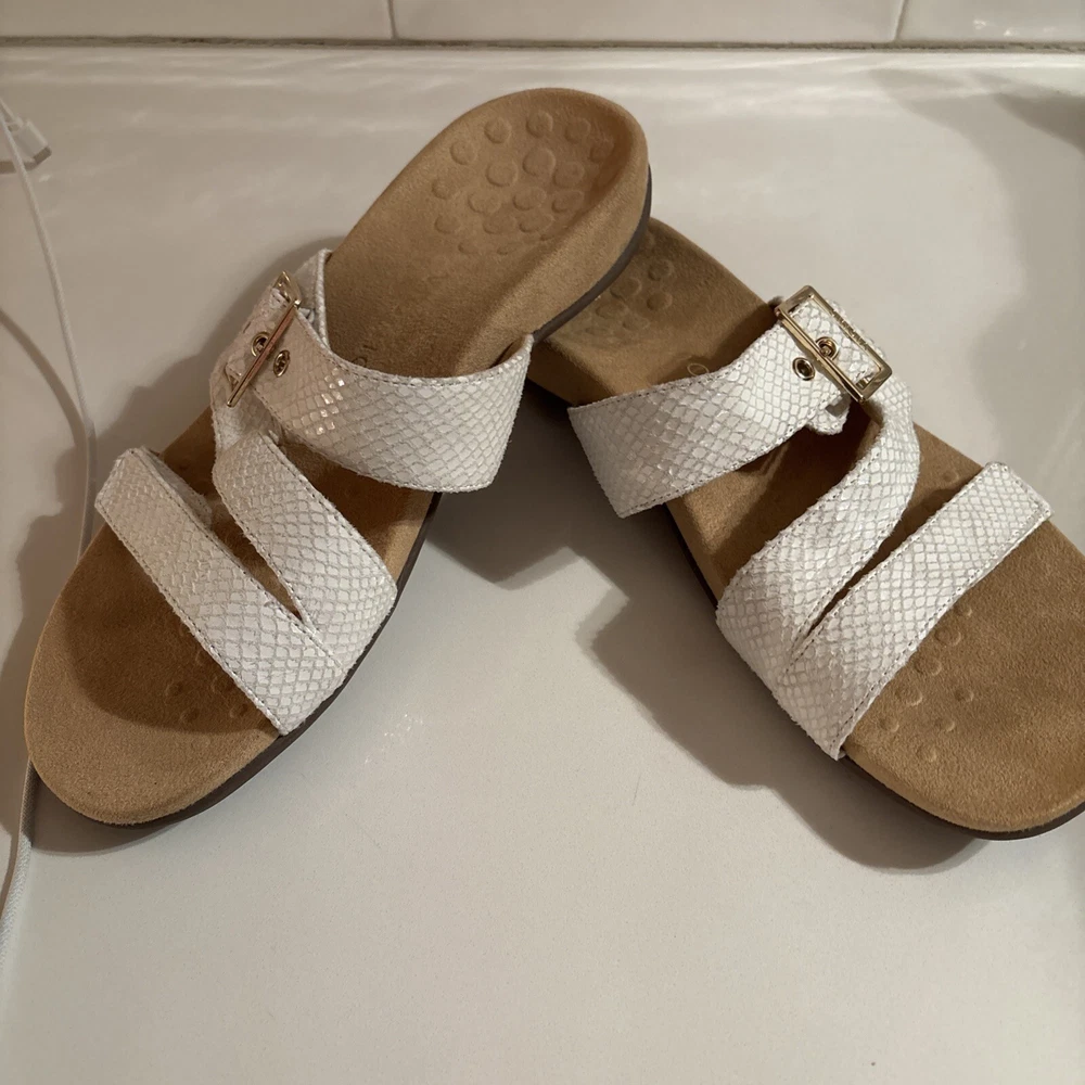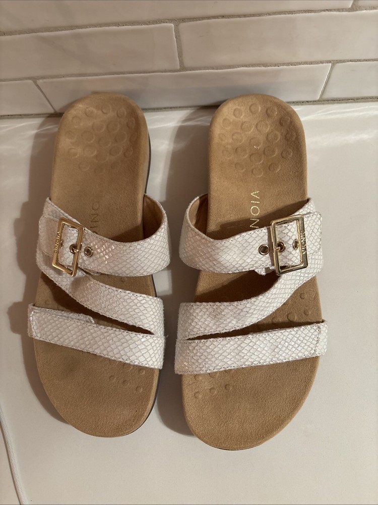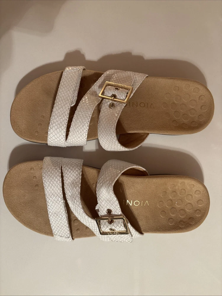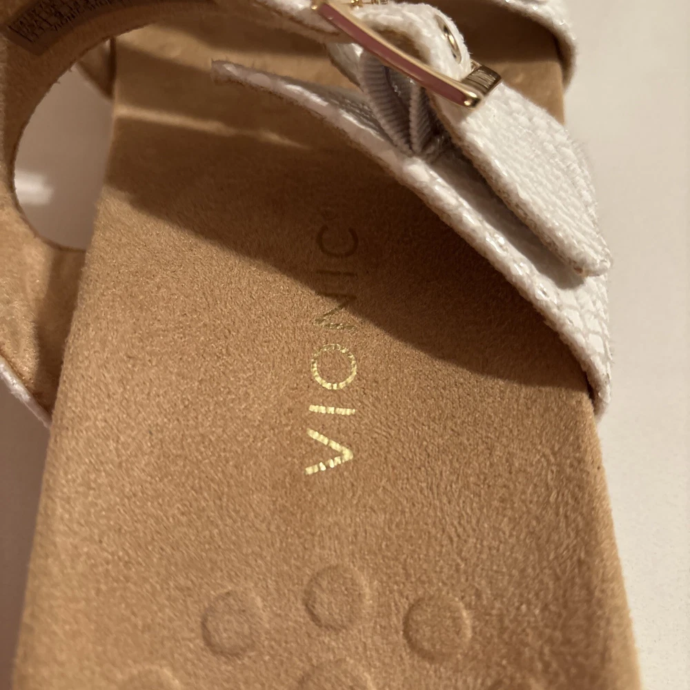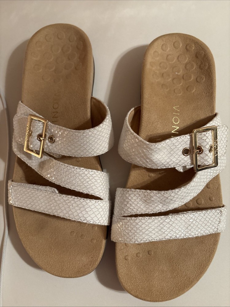 The Vionic Skylar leather sandals in size 11 for women feature a white color with gold buckle detailing. These slip-on sandals have a stylish design with straps and a cushioned insole for added comfort. The upper material is made of leather, giving the sandals a durable and high-quality feel. Perfect for a casual or dressy look, these Vionic sandals offer both style and support for all-day wear. Beautiful sandal with extreme comfort
