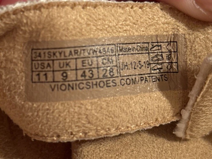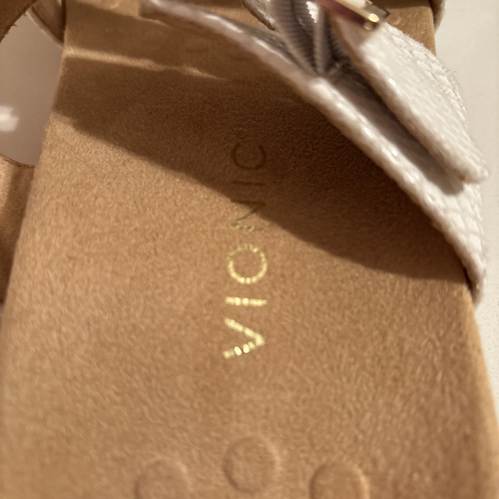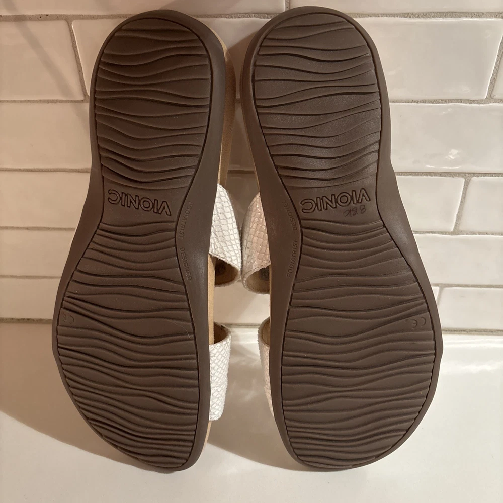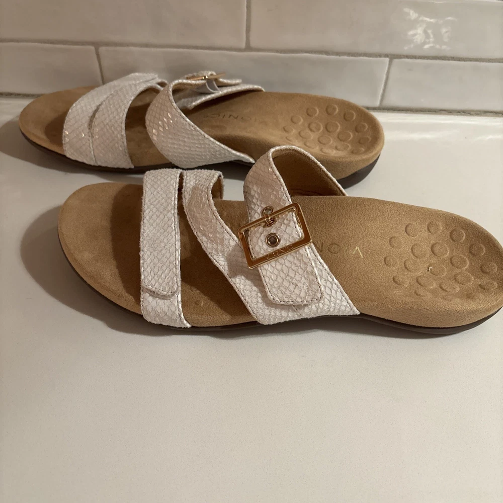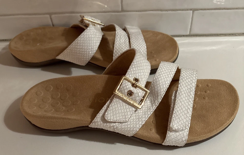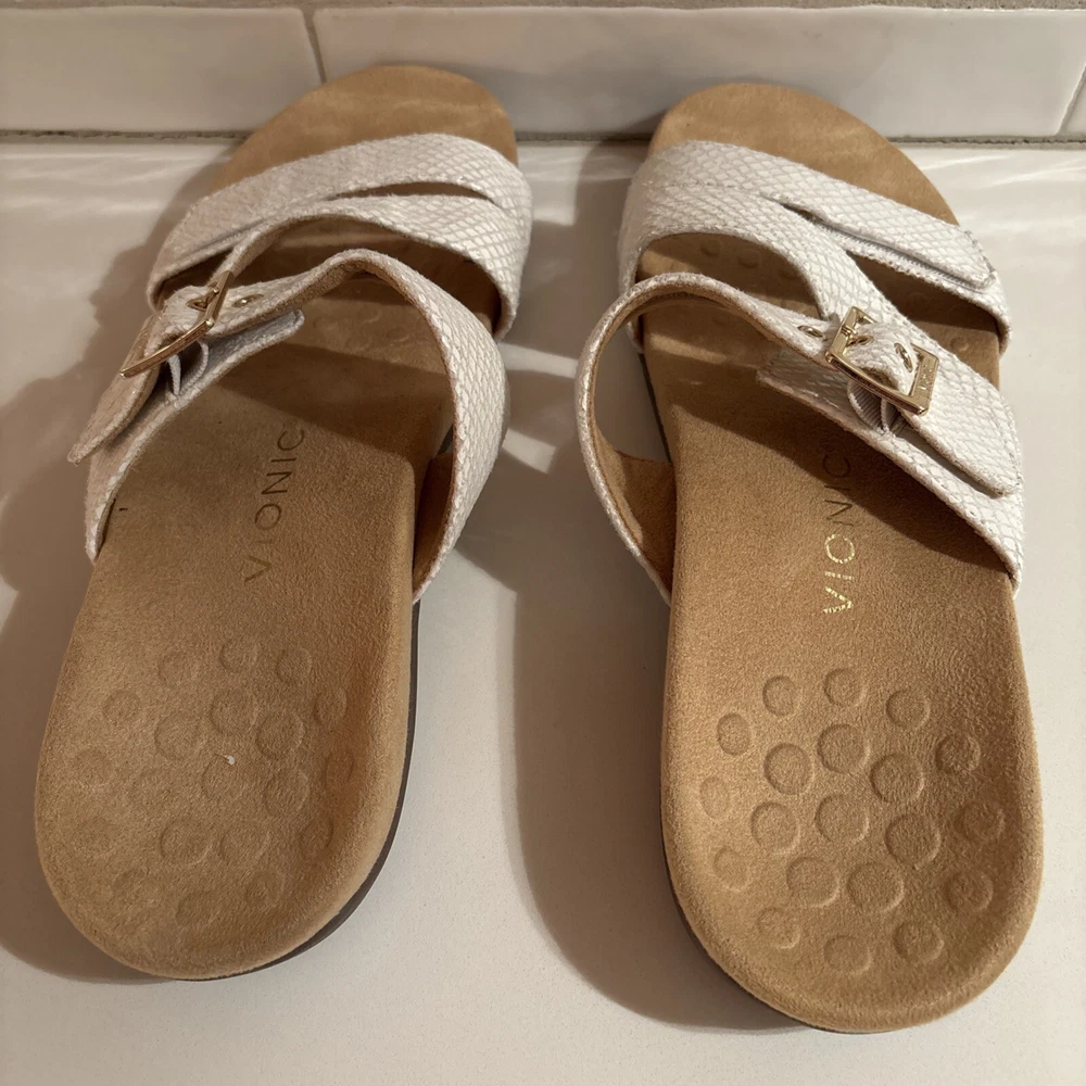 The Vionic Skylar leather sandals in size 11 for women feature a white color with gold buckle detailing. These slip-on sandals have a stylish design with straps and a cushioned insole for added comfort. The upper material is made of leather, giving the sandals a durable and high-quality feel. Perfect for a casual or dressy look, these Vionic sandals offer both style and support for all-day wear. Beautiful sandal with extreme comfort