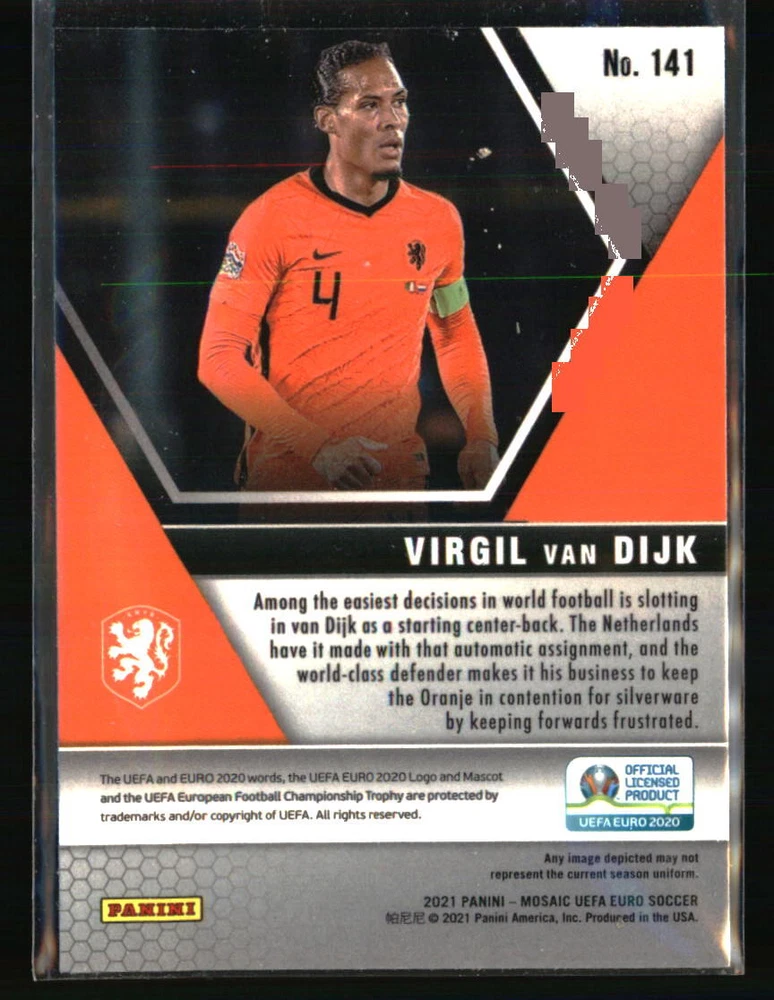 Manufacturer: Panini Set: 2021 Panini Mosaic UEFA EURO 2020 Team: Netherlands Season: 2021 Card Number: 141 Year Manufactured: 2021 Sport: SOCCER Player|Athlete: Virgil van Dijk Graded: No Autographed: No Type: Sports Trading Card