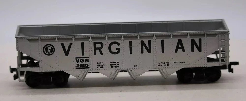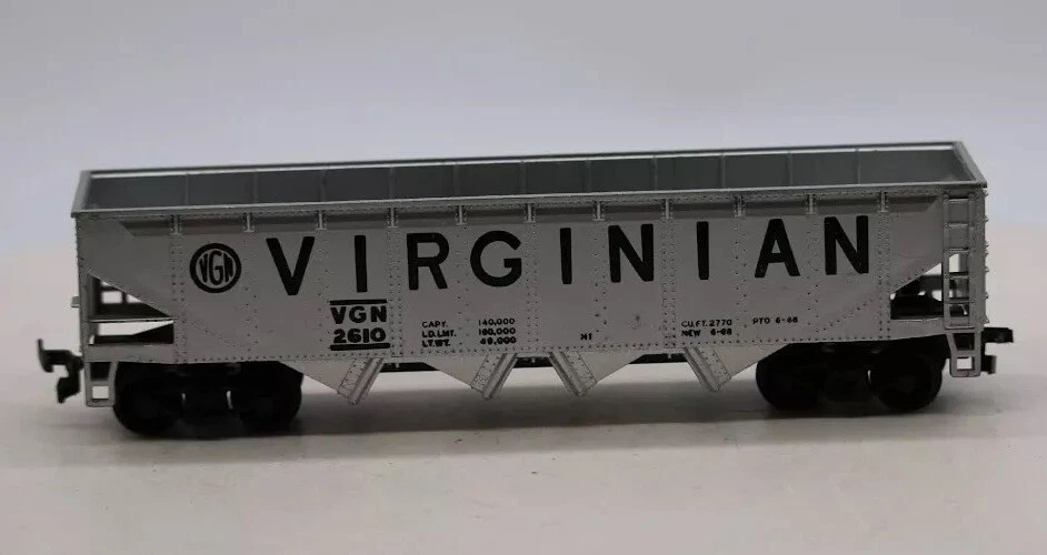 ATHEARN Virginian 4 bay Hopper train #2610 PLEASE see photos for detailed condition!! There may be pieces that are missing or broken including, but not limited too, couplers, brake wheels, steps, ladders, railings, etc. May need detailed cleaning. PLEASE LOOK AT THE PHOTOS CAREFULLY BEFORE PURCHASING!! If you are purchasing more than one item from us and would like combined shipping, PLEASE request an adjusted invoice from us while still in the cart and BEFORE paying. eBay does not usually calculate combined shipping accurately and you might get overcharged. Please be aware that when we photograph items, we use lighting that will show the details well. Although we try to present the product as accurately as possible, the lighting may affect the overall look of the item by appearing lighter/darker or possibly a different hue than the actual item. Depending on the type of lighting you have in your home, there may be some differences between the photos and the actual item. If this is a concern of yours, please feel free to request additional photos made in natural lighting or ask for a more detailed description of the item PRIOR TO PURCHASE! PLEASE NOTE: We greatly appreciate your interest in our item for sale. We look forward to a pleasant, quick and satisfying transaction for everybody, so please note the following information before bidding. Thank you! ITEM DESCRIPTIONS: * We will try to describe items well and provide plenty of photos. Please review these carefully before bidding or purchasing. * Only the items pictured and described are what you will receive when purchased. * We will occasionally offer an item clearly marked "AS-IS". This means that we are not sure if it works because we are unable to test it for whatever reason. We will offer these at a discounted price than a similar "working" item. It is possible that these items will work fine, but it also is possible that these items are more useful for their parts. Please only bid on or purchase these items if you are well aware of this, as we will only provide refunds of actual item price (no shipping cost refunds) for these items. * If you have any questions that aren't addressed by the descriptions or photos, please feel free to ask before you bid. SHIPPING: * We offer international shipping, if you have any questions please reach out. * We try to pack items as carefully as possible, but damage may occur during shipping. If you receive an item that was damaged in shipping, please contact us and we will work with you to resolve the problem. * We will combine shipping costs for all items the same buyer purchases from us within 2 days. Please wait to pay for items until you're done shopping with us. Please contact us if you're expecting to buy more items from us, or to have us adjust the shipping costs. * We will usually ship items out within 24 hours of payment being received Sunday through Friday at noon. We will notify the buyer if there will be a delay in shipping for some reason. Please allow additional time for holidays and weekends when the post office is closed. If payment is received after noon (EST) on Friday, the item might not be shipped until the following Monday. * We do try to recycle shipping materials as much as possible. RETURNS: We abide by eBay's Money Back Guarantee. We definitely want our customers to be happy with their purchase! You may return an item within 30 days of receiving it with the following guidelines: * If the item is defective or damaged (unless we clearly marked the listing "AS-IS"), the buyer will receive a full refund after the buyer returns it and it is received by us. Customers who falsely claim their item is defective, damaged, or not as described in order to receive a full refund and free return shipping will be permanently blocked from making future purchases from us. * If the item is as described (including "AS-IS" items) and the buyer decides for any other reason than defective/damaged to return it, only the actual price of the item will be refunded once it has been returned and it is received by us. The buyer will be asked to pay all original and return shipping charges. This includes all reasons other than defective/damaged, including wrong size, wrong type, changed mind, etc. All "AS-IS" items will fall into this category of return. Please make sure the item is what you want before purchasing it. * Please contact us before initiating a refund request. FEEDBACK: We always leave feedback at the end of transaction. We consider the transaction to be over when we receive feedback from the buyer confirming the item arrived satisfactorily. If you are unsatisfied with your purchase please contact us before leaving neutral or negative feedback. WE APPRECIATE POSITIVE FEEDBACK IF YOU ARE SATISFIED WITH YOUR PURCHASE! THANK YOU FOR YOUR INTEREST IN THIS ITEM!