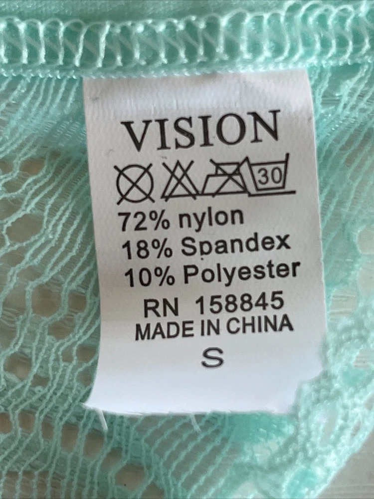 This Vision Intimates women's teal lace thong in size S features a floral pattern and is made of lightweight nylon material. It is designed as a thong/string style panty with lace fabric, emphasizing the waist area. The item is brand new with tags (NWT) and is ideal for women seeking a vision of elegance and comfort in their intimate wear.