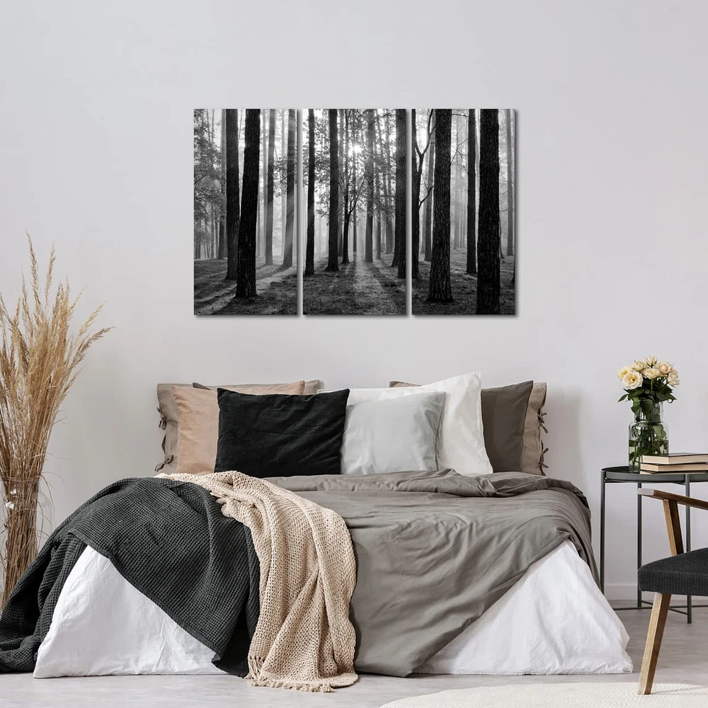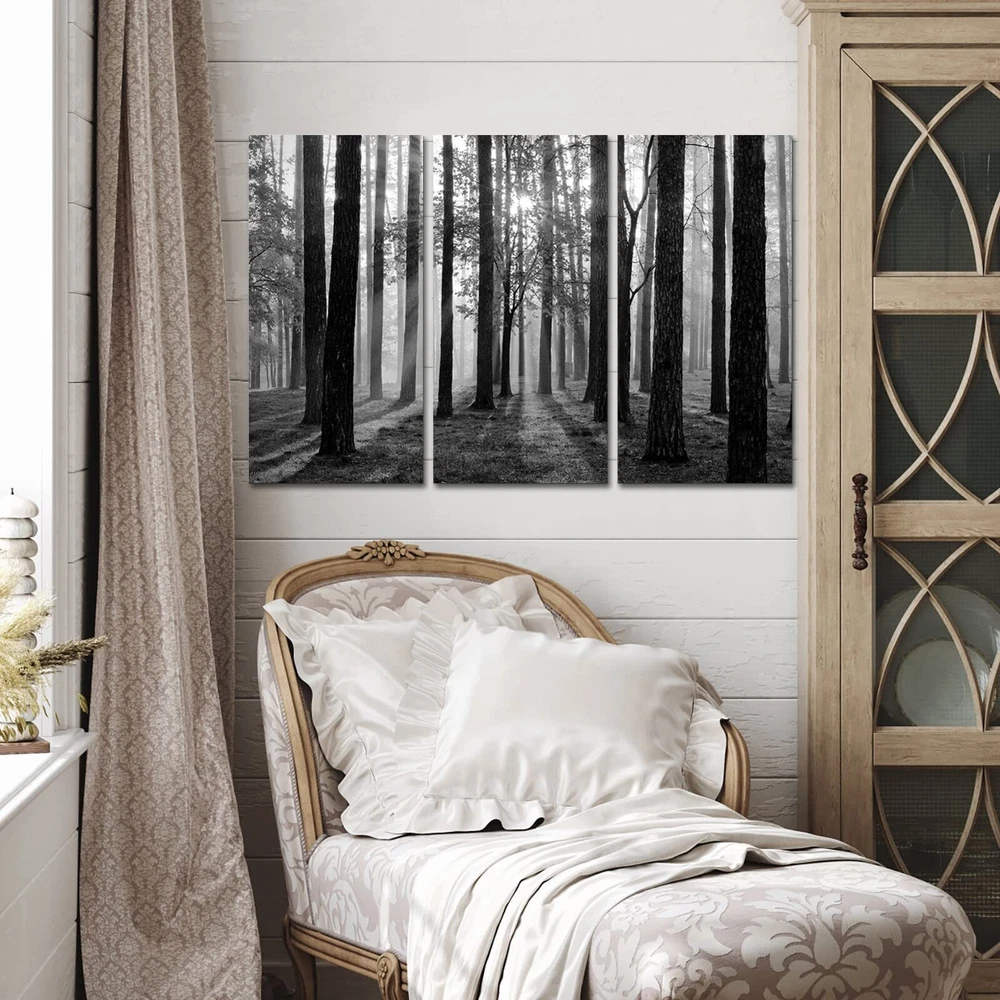 Visual Art Decor 3 Pieces Black and White Forest Wall Art Foggy Forest Pictures, Framed Canvas Wall Art Living Room Home Wall Decor Product Details Recommended Uses For Product: Bedroom, Living Room, Home Office Indoor Outdoor Usage: Indoor Seasons: Winter, Summer, Fall, Spring Color Family: Black and White Orientation: Landscape Color: Black and White Item Shape: Rectangular Pattern: Forest Theme: Forest Wall Art Form: Art Print Room Type: Living Room, Bedroom, Home Office Mounting Type: Wall Mount Frame Type: Framed Special Features: Lightweight UPC: 602668474652 Package Type: Standard Packaging Manufacturer: Xiamen Visual Beauty Import&Export Co.,ltd Number of Items: 3 Number Of Panels: 3 Brand Name: Visual Art Decor Paint Type: Oil Finish Type: Watercolor Material: Wood Paper Finish: Watercolor Frame Material: Wood Item Weight: 3.4 Pounds Size: 12inx24inx3 Pieces Item Dimensions L x W: 36"L x 24"W Unit Count: 3 count Size:12inchx24inchx3 Pieces (30cmx60cmx3 Pieces) Lightweight & Easy to hang: Included mounting hardware, making it a breeze to install on any wall Easy to Clean: Simply wipe clean with a damp cloth, making maintenance effortless for everyday life Durable & Long-Lasting: Built to withstand the test of time, our canvas wall art is made with premium materials and expert craftsmanship, ensuring it stays beautiful for years to come Perfect for bathroom decor, bedroom decor, office decor, living room decor, guest room decor, master room decor, boys room decor, girls room decor