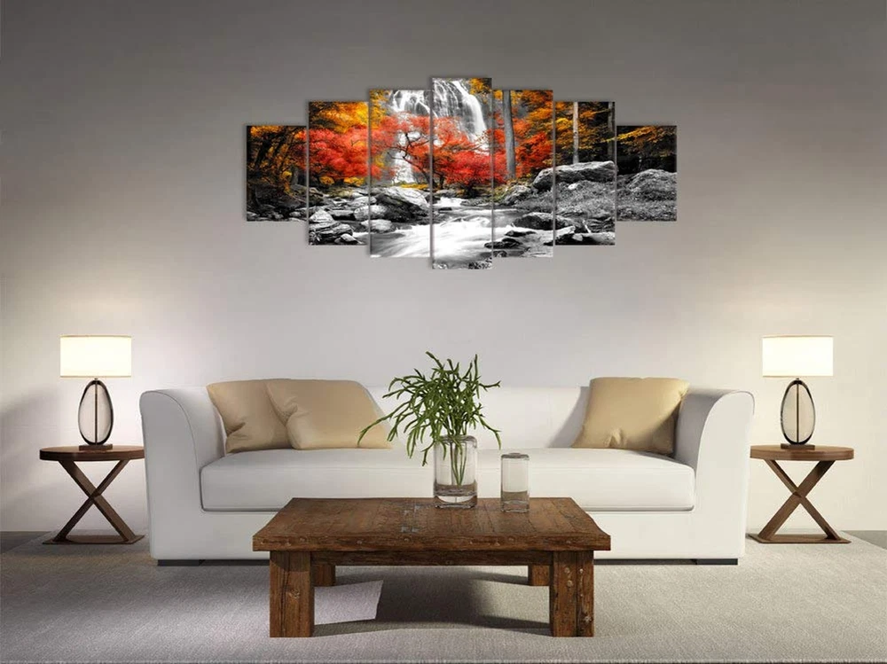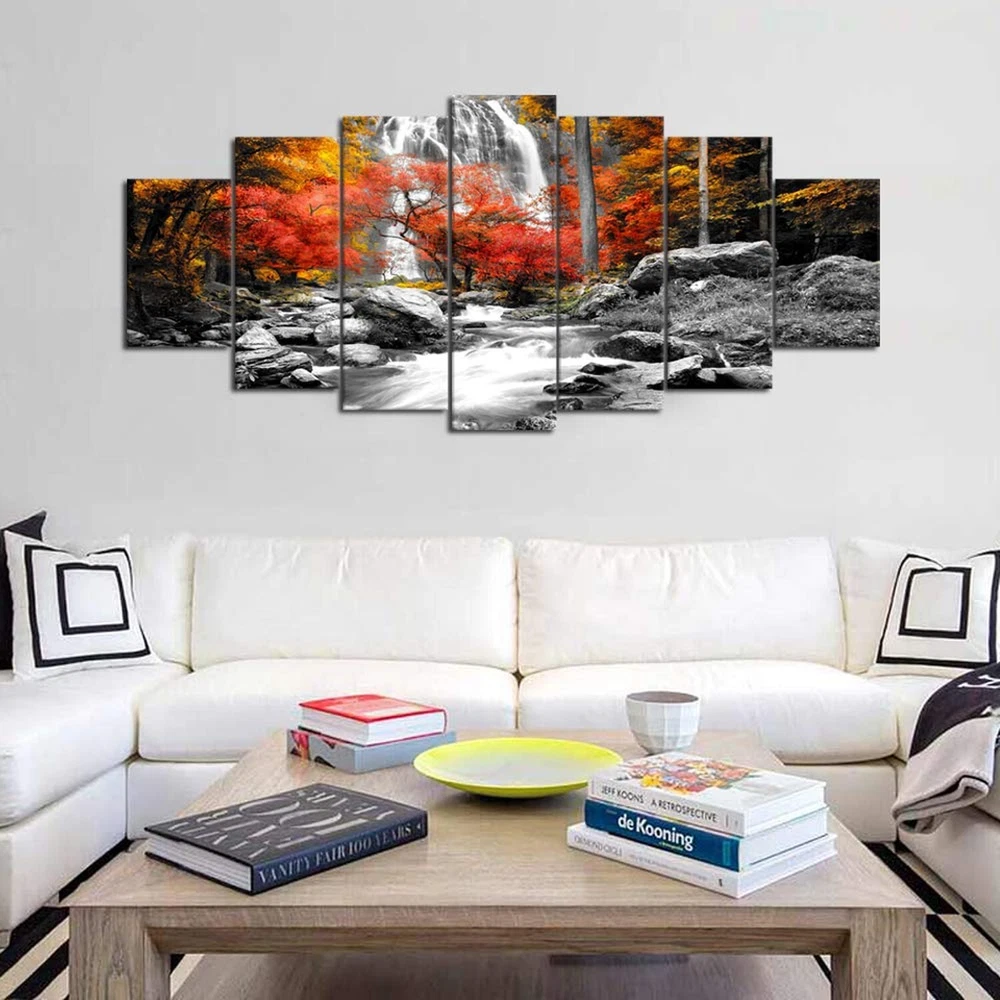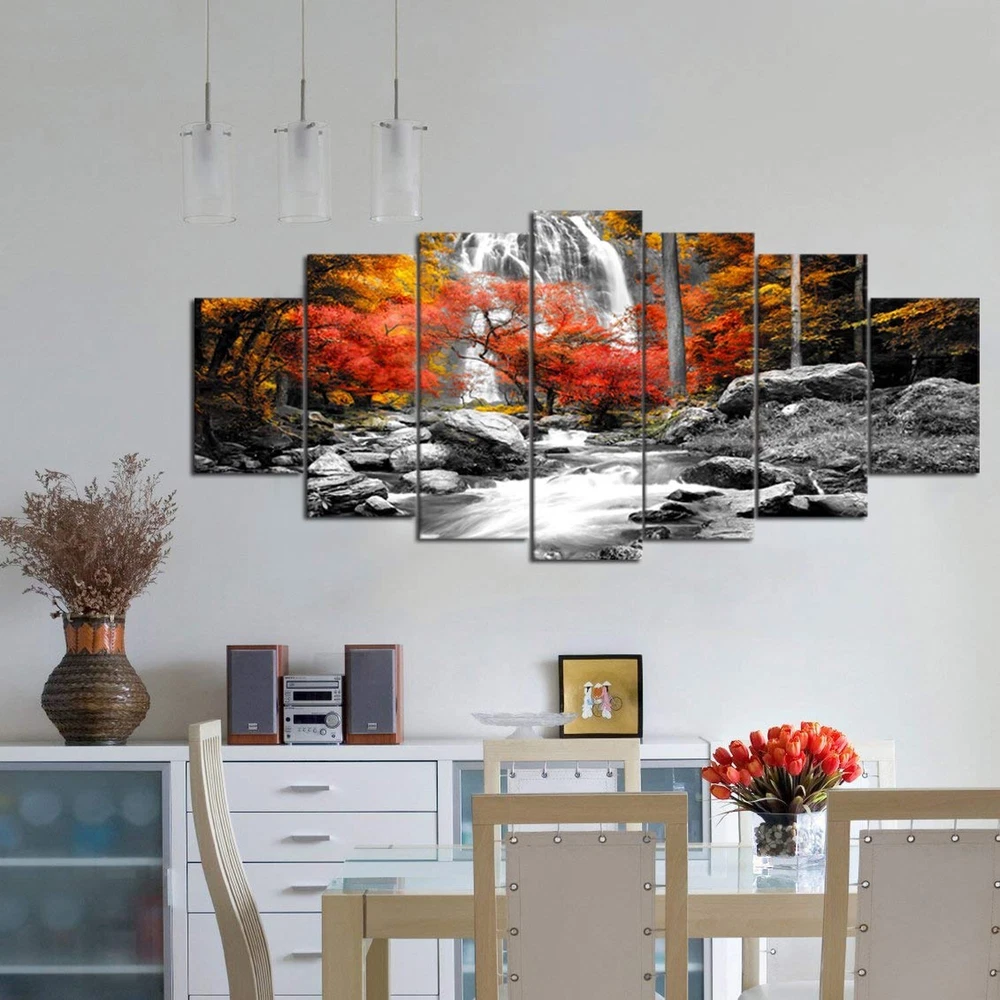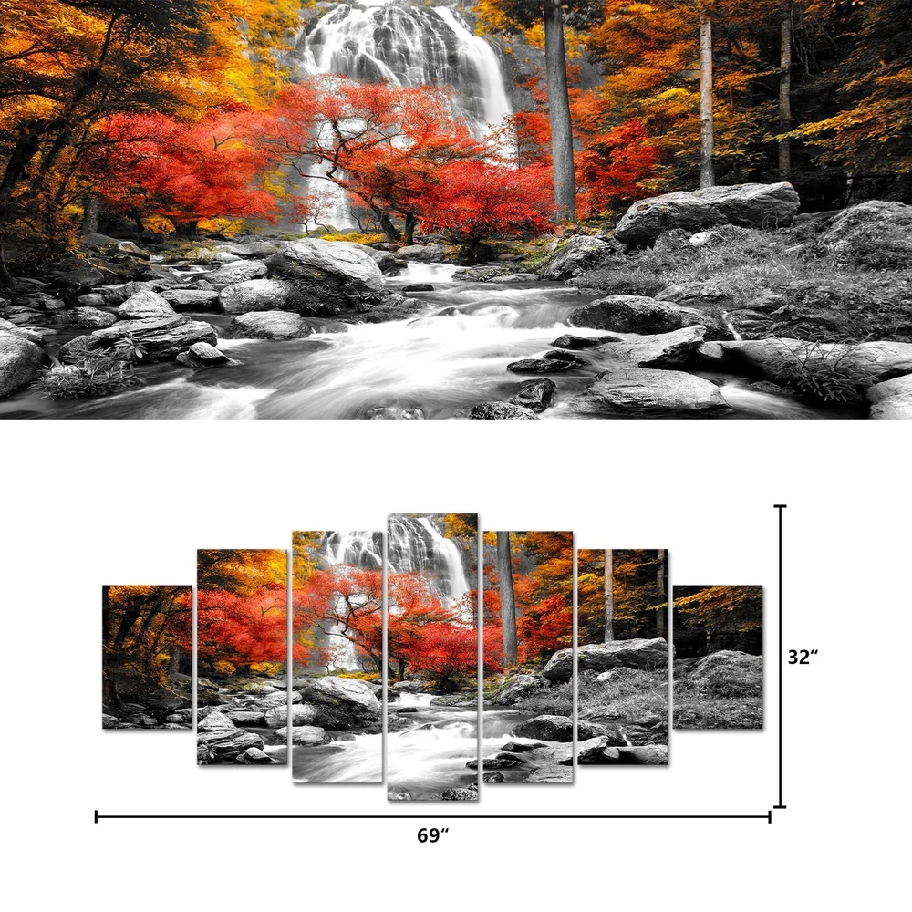 Visual Art Decor Black White Red Canvas Wall Art Autumn Yellow Orange Trees Forest Waterfall Lake Picture Prints for Modern Home Living Room Office Decoration (7 Pieces) Product Details Product Dimensions: 70 x 1 x 32 inches Item Weight: 7.24 pounds Manufacturer: Xiamen Visual Beauty Item model number: VA190726-2 Is Discontinued By Manufacturer: No Date First Available: September 1, 2014 Size: 7 Piece Canvas Wall Art, Overall is 70inch width x 32inch height Lightweight & Easy to hang: Included mounting hardware, making it a breeze to install on any wall Easy to Clean: Simply wipe clean with a damp cloth, making maintenance effortless for everyday life Durable & Long-Lasting: Built to withstand the test of time, our canvas wall art is made with premium materials and expert craftsmanship, ensuring it stays beautiful for years to come Perfect for bathroom decor, bedroom decor, office decor, living room decor, guest room decor, master room decor, boys room decor, girls room decor Canvas Wall Art Ready to Hang