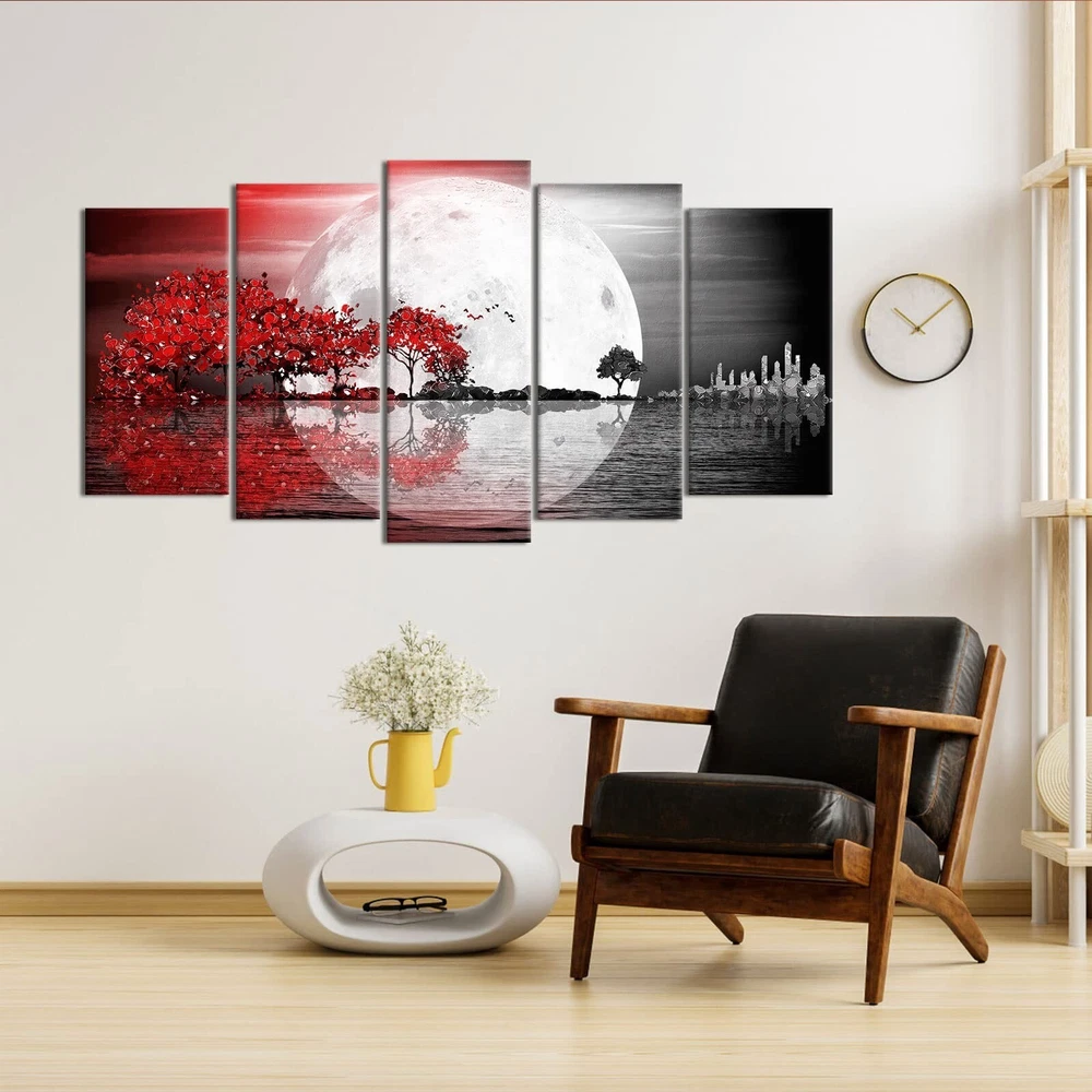 Visual Art Decor Large 5 Pieces Abstract Landscape Canvas Wall Art Black and White Full Moon Seascape Red Trees Painting Pritned on Canvas Artwork for Living Room Bedroom OfficeWall Decoration (Red, Product Details Size: LxH-60"x32" Color: Red Brand: Visual Art Decor MPN: Does not apply UPC: Does not apply EAN: Does not apply Recommended Uses For Product: Interior wall decoration in living rooms, bedrooms, or offices Indoor Outdoor Usage: Indoor Color Family: Black and White Orientation: Landscape Color: Red Item Shape: Rectangular Pattern: Abstract Style: Art Deco Theme: Nature Wall Art Form: Painting Room Type: Living Room Mounting Type: Wall Mount Frame Type: Wrapped Canvas Special Features: High-quality display, Easy installation, Unique design Number of Items: 5 Age Range Description: Adult Number Of Panels: 5 Brand Name: Visual Art Decor Paint Type: Watercolor Material: Pine Wood Paper Finish: Metallic Frame Material: Wood Item Weight: 5.9 Pounds Size: LxH-60"x32" Item Dimensions L x W: 60"L x 32"W Unit Count: 5 count Giclee Artwork, High Quality Eco-solvent Canvas Prints .Museum Exhibition Display Wrapped,Premium Artwork Stretched and Framed, Ready to Hang.All installation hardware kit attached Size:12"x24"x2 panels+12"x28"x2 panels+12"x32"x1 Panel (total 5 panels,W-60"x H-32"),Xlarge,Great pieces to liven up and energize any wall or room Gallery wrapped on pine wood bars, the image continues around the sides. Neatly taped on the back with no staples or tacks visible Any problems,please feel free to contact us,we treasure your purchase experience much.And due to different brand of monitors, actual wall art colors may be slightly different from the product image