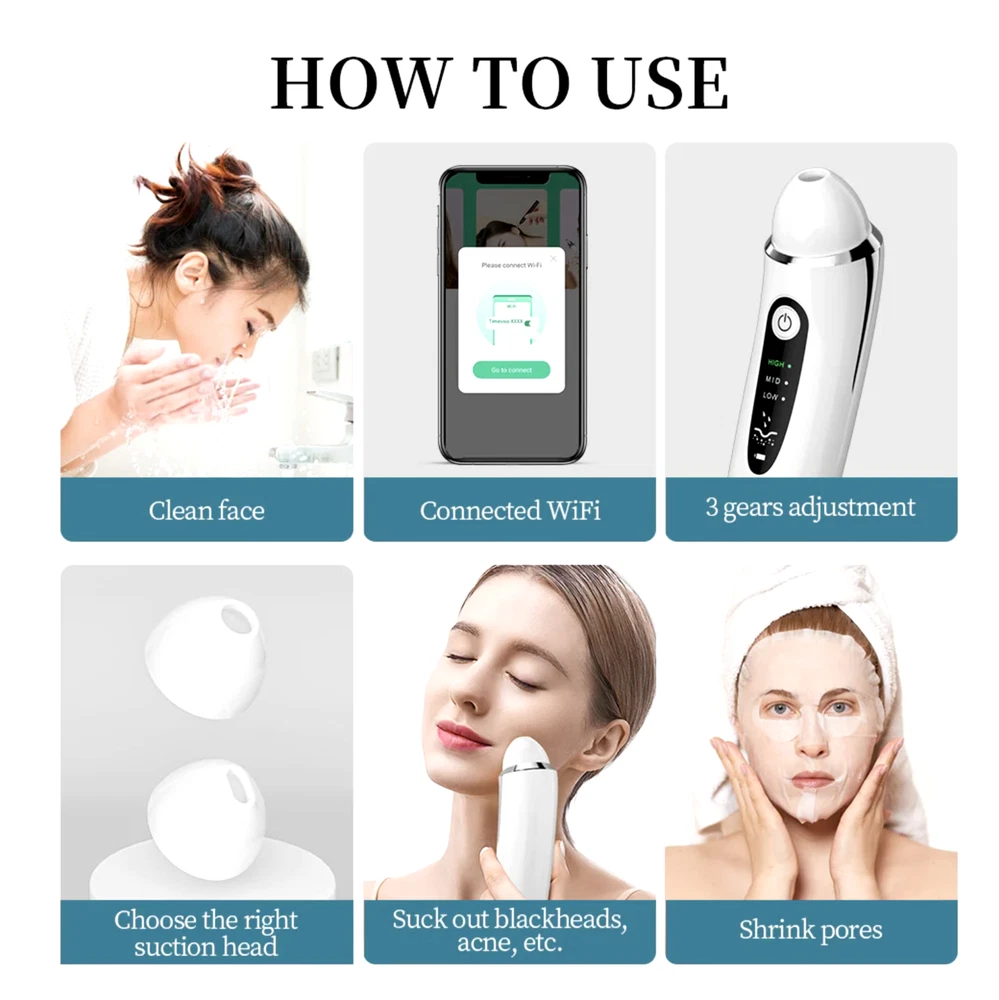 π[3 Modes] eXempt blackheads are equipped with powerful suction power, 3 modes, different intensity adjustments, can remove blackheads and acne; smooth skin, lift and tighten; modes are divided into smooth, normal, and strong, which can provide for your skin Deeper cleaning; Equipped with a variety of suction heads, through which different suction heads can meet the cleaning needs of various parts. π[WIFI Visible HD] 5 Million high-definition pixels WIFI connection is visible, allowing users to see their skin clear, thereby targeted operations, LED lights to illuminate the skin, even in the dark can see the skin, obviously, it is safe and effective. The product can be connected to mobile phones, tablets, notebooks, diversified connections, and is more convenient to use. π[Safe and skin-friendly] The blackhead meter does not contain any harmful and toxic chemicals. The blackhead vacuum cleaner uses a physical method, and occasionally the skin turns red, which is a normal phenomenon; environmentally friendly ABS material, safe and skin-friendly, helps you rejuvenate your skin and welcome a better new life. π[Charge fast and portable] USB charging speed is fast, battery life is long, the product is small and easy to carry. It can be put in a backpack or pocket and is a must-have for travel and home; 3 modes of electronic display are clear at a glance, and the warm battery reminder makes it easy to understand the battery status of the product. π[Precautions] First use a towel to heat the skin of the operation site for 5 minutes to open the pores; then use a blackhead suction device to suck out the blackheads in the same direction, but be careful not to stay in the same place for more than 3 seconds to damage the skin; use a cold towel Apply to the skin that has been manipulated to shrink pores.