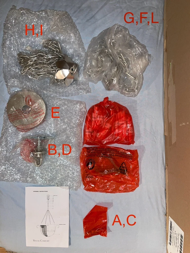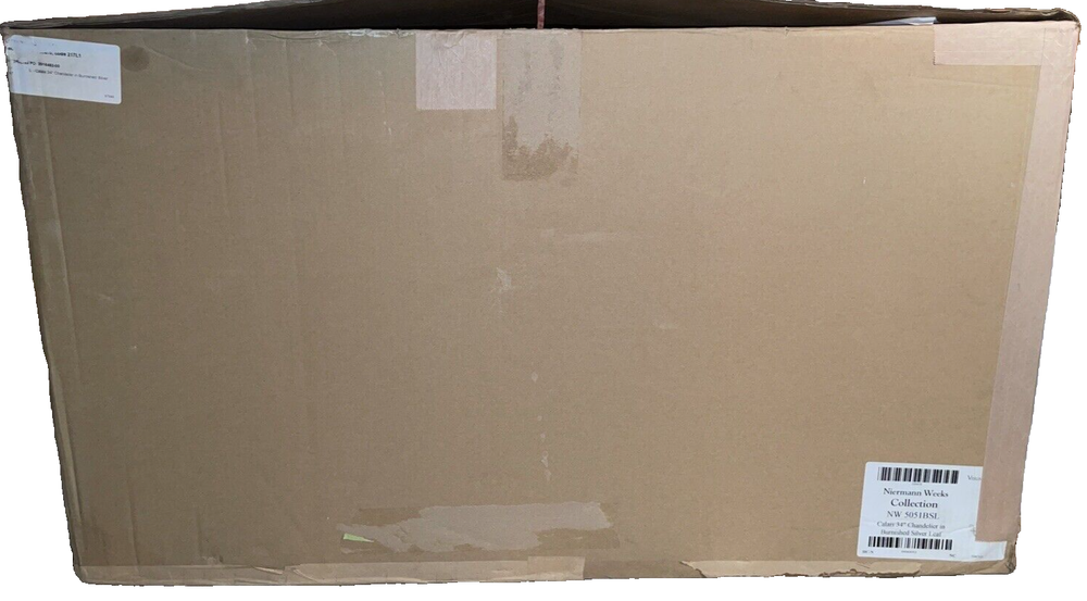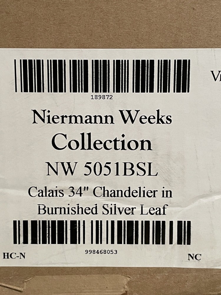 Visual Comfort Calais Chandelier The Visual Comfort Calais 34" Chandelier is a stunning piece that will bring classic glamour to any space. The six-light fixture features sparkling feathers of glass that are delicate and engaging. The chandelier is perfect for an entryway or dining room and is sure to make a statement. New in open box (purchased for remodel but never installed) Hand-applied Burnished Silver Leaf finish MSRP $4,999 (54% off) All components accounted for (see picture above) Along with components itemized in diagram above, also includes a spare glass rods (all sizes) and pliers to be used during installation. 72" (6 ft) corded chain ('L' in parts diagram photo, above) Designed by Niermann Weeks for Visual Comfort Signature Collection Shipping: Large box (38x38x22); please contact me for accurate shipping estimate. Should be able to ship, insured, to any location in CONUS via UPS. Additional insulation added around chandelier components to protect during shipping.