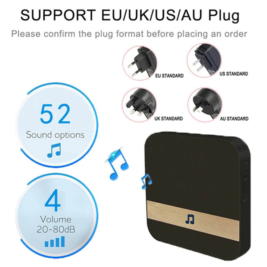 SAFE & SECURE SHOPPING 100% SATISFACTION GUARANTEED FAST SHIPPING You may also like Visual Doorbell Receiver for Smart Wireless WiFi Video Doorbell EU Plug Black Product Description Visual Doorbell Receiver for Smart Wireless WiFi Video Doorbell EU Plug Black Features: Easy to pair with the doorbell, easy for installation. Low power consumption. Compatible with smart video doorbells. Wifi connection, more convenient. Practical with its waterproof material. Specifications: EU plug only Colour: Black Ringtones: Music (52 types) Power supply mode: socket direct charge Power supply voltage: 110-220V Power consumption: 10mW Working frequency: 433Mhz Sensitivity: -110dB Volume: up to 100dB Type: Visual doorbell machine Scope of application: furniture smart doorbell Product size: 80x80mm Specifications: This is a good partner for a visual doorbell. Fine-quality material makes it more practical. Easy to pair with the doorbell, easy for installation. Low power consumption. Compatible with smart video doorbells. Wifi connection, more convenient. Practical with its waterproof material. Package Included: 1 * Doorbell Chime 1 * Instructions Payment Shipping Returns Contact Us Payment Payment should be completed within 7 days after buyer places the order,or else an unpaid case will be opened in order to cancel the transaction. If you can not pay in time, please contact us. All of the items will be shipped to buyer's EBAY address,please confirm your address on Ebay before you buy.Your order will be usually shipped out the same or next business days once the payment is made and cleared. Shipping All items will be checked before packing. All items are new and of high quality. If to USA, we will ship your order by EDIS, it will take about 8 to 12 business days to you, and you can track it on line. If to other country, we will ship your order by China Post or Singapore Registered Air Mail, it will take about 15-21 working days to you, you aslo can track it on line. Delivery time is about 14-28 business days and it may take up to 8 weeks to some European countries and South American countries due to strict custom inspection. We ship worldwide. Please note that some countries will have custom duty or tax for certain items. It is the buyer's responsibility to pay all endued custom duty or tax. We are not responsible for any custom duty or tax since our price do not include this charge. As shipping is affected by many unsteady factors: customs, flights, weather, war, trade policy ,etc, some shipments do get delayed sometimes. If you have not received your shipment within 15 days from payment, please contact us. We will track the shipment and get back to you as soon as possible with a reply. Our goal is customer satisfaction! Returns 30-day Warranty with Exchange for defective, malfunctioned, incorrect or parts-missing items. Please notify us and return the item with all parts and accessories packed and marked "FOR EXCHANGE" within 14 days of receipt. If defective, malfunctioned or parts-missing items are no longer available, a refund may be issued. All returning postage costs will be the responsibility of the buyers under all circumstances. Contact Us If you encounter any problems about anything, please feel free to contact us and we will do our best to assist you solve the issue. If you are not satisfied in anyway, please feel free to let us know and give us a second chance to correct it before you decide to leave any neutral or negative feedback. Please contact us through eBay link if you have any questions. We will reply you within 24- 48 hours. Please check you spam mail if no response for 48 hours. Copyright © 2022 Tongtool On Jul 17, 2024 at 18:07:02 PDT, seller added the following information: