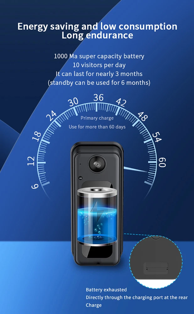 Features: HUMAN AND MOTION DETECTION - The video doorbell help you keep an eye out for deliveries, watch for porch pirates, or just check on the weather, distinguish between people and other motion accurately, sensitivity is adjustable, real alert will be send to your APP INFRARED INTELLIGENT SWITCHING - Equipped with infrared , at night, Intelligently switch to infrared mode. The is clearly visible,You can see clearly without WIDE-ANGLE VISUAL DOORBELL - 125 Degrees ultra wide angle lens let you see more 2 WAY AUDIO - Designed with built-in microphone and speaker, you can talk to visitors through two-way audio feature of this video doorbell for home with app, no matter wherever you are EASY INSTALLATION - This wire-free video door bell is 1000 capacity powered, working for you around 3-4 month with a full , no wire needed, you can install Andoe doorbell beside your door with adhesive tape or screws easily CLOUD STORAGE - No needed, all video recorded by this doorbell will be stored in cloud, which is safer and more convenient to check - This video doorbell is compatible with iOS and Android phones, find the App in /App Store, only internet supported INDOOR HIGH BASE STATION SIGNAL INTENSITY INCREASE BY 100% - With its own signal enhancement function the transmission distance is longer, better through wall performance and wider coverage Specifications: Resolution: 1280*720 Recording : 5m Audio decoding: g 711/s The system supports android4.3 or ios9.0 or higher : 1000mah, 2 months of permanent Storage: support 32G, fat format Material: ABS Item Size: 106 * 45 * 24 mm / 4.17 * 1.77 * 0.94 inch Package Size: 13 * 8 * 5.5 / 5.12 * 3.15 * 2.17 inch Package Weight: 178g / 6.28oz Package List: E24374 1 * Doorbell 1 * Jingle Doorbell Receiver 1 * User Manual (English)