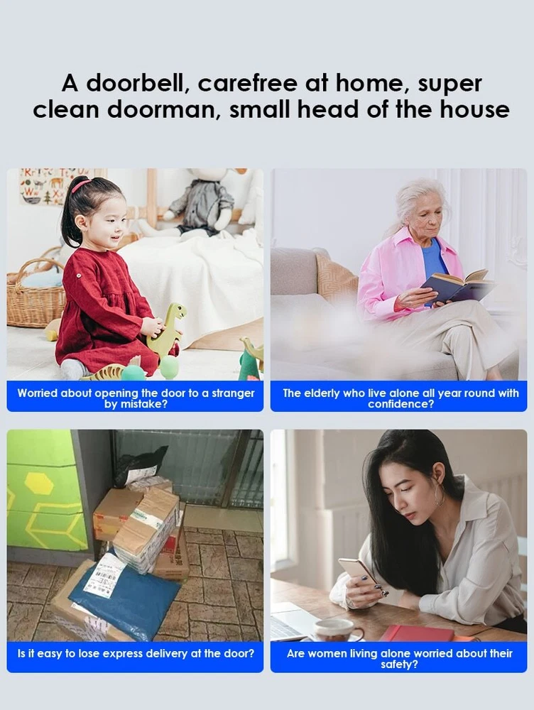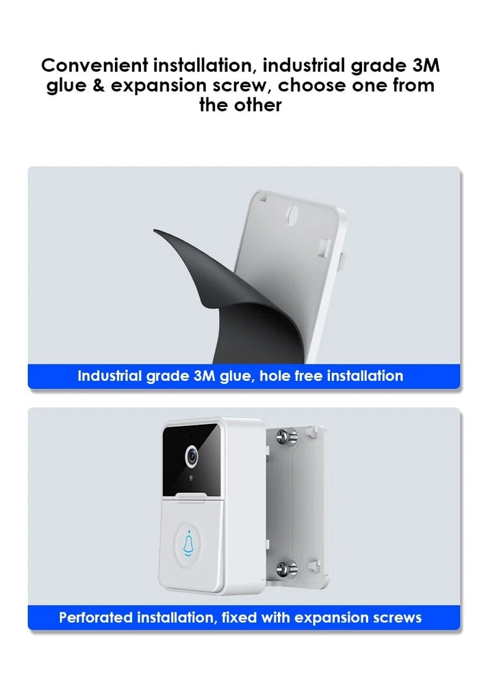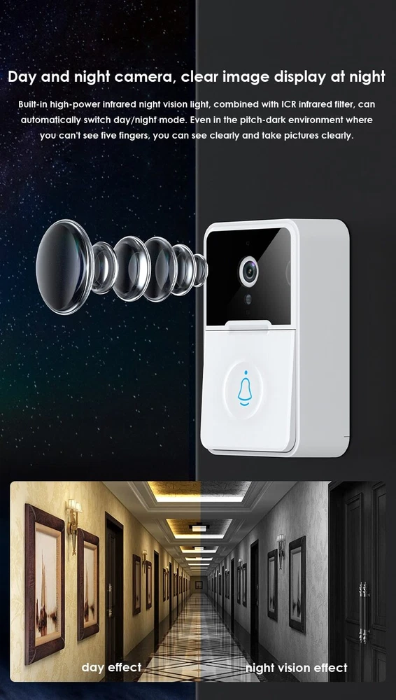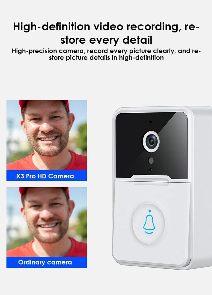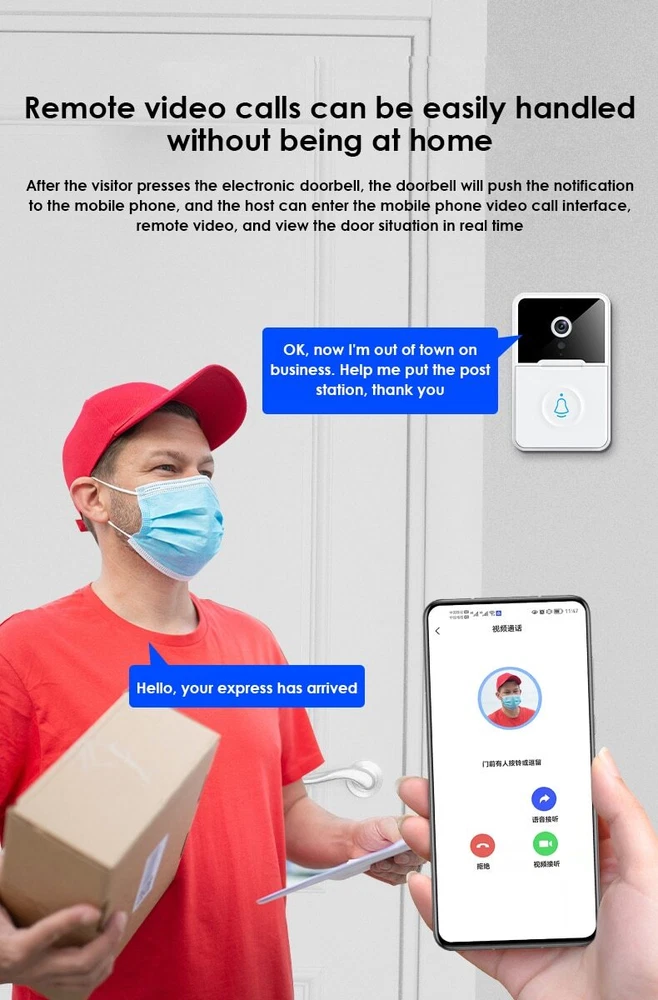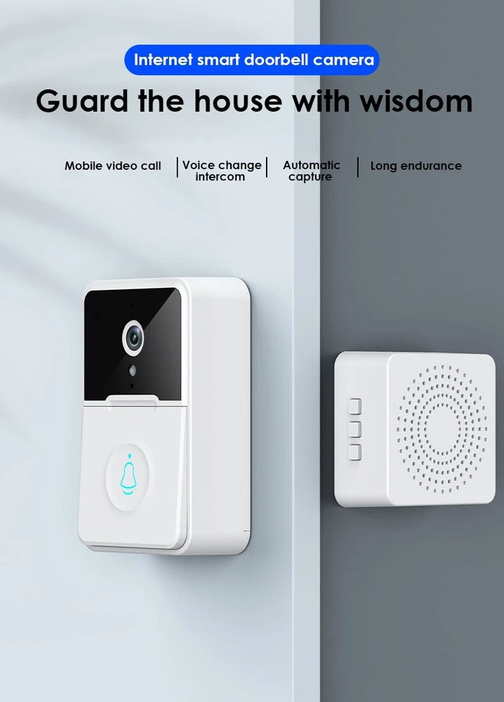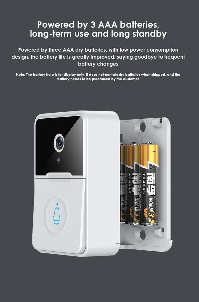 Description: Connection mode; Bluetooth &wifi Viewing angle: 60 ° Pickup distance: 3M Battery: 3 AAA batteries (excluding dry batteries, which need to be purchased by the customer) Storage Cloud Night vision lamp: 850n night vision lamp Doorbell size: 73*46*25mm Ding Dong machine size: 43*41*32mm Specifications: 1. Remote video calls can be easily handled without being at home After the visitor presses the electronic doorbell, the doorbell will push the notification to the mobile phone, and the host can enter the mobile phone video call interface, remote video, and view the door situation in real time 2. Two way call, intelligent voice change, girls feel at ease at home alone Two way voice design, with high-power speakers and high-sensitivity microphones, the visual call in front of the door is clear and smooth. Support voice change intercom, easily change boys, and easily deal with various situations 3. High definition wide-angle lens safety protection without dead angle With the new generation of wide-angle lens, you can have a panoramic view of the situation in front of the door, so that there is no "safety corner" left in the door, and multiple visitors can also see it one by one 4. Full encryption and automatic cyclic coverage of cloud storage Visitor records are saved in the cloud, and data encryption is more secure. You can view visitor records through mobile app anytime and anywhere, and you know the situation at home like the palm of your hand 5. The day and night dual-purpose camera can clearly display the night image Built in high-power infrared night vision lamp, combined with ICR infrared filter, can automatically switch day / night mode. Even in the dark environment where you can't see your fingers, you can see clearly and shoot clearly Package Included: 1 * doorbell camera, 1* indoor Ding Dong machine, 1*Adhesive sticker, 4* screw, 1* user manual Notes: This product uses three No.7 batteries, which customers need to buy separately undefined