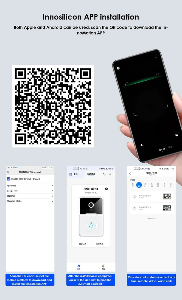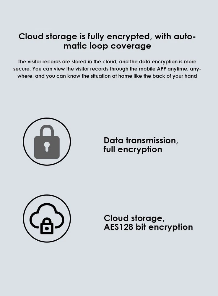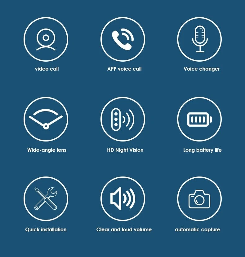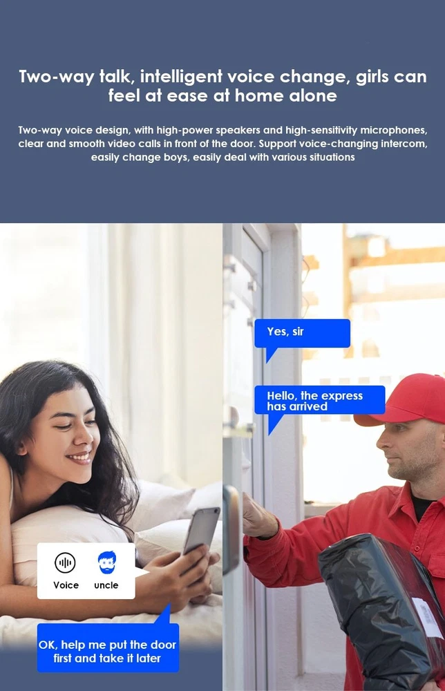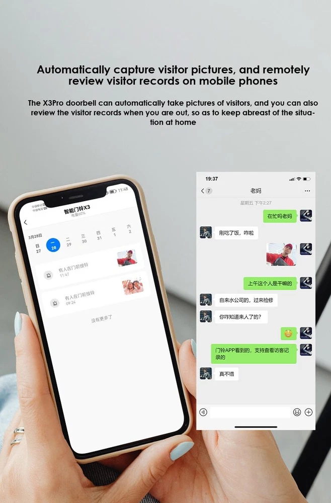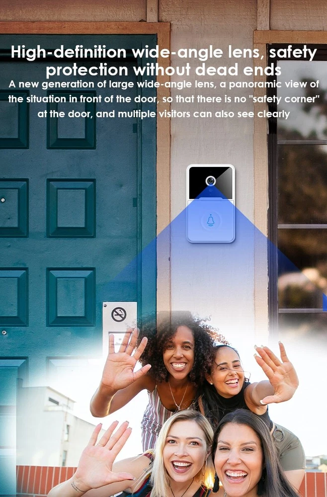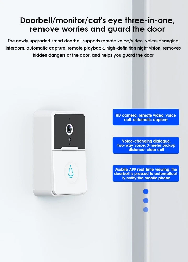 Description: Connection mode; Bluetooth &wifi Viewing angle: 60 ° Pickup distance: 3M Battery: 3 AAA batteries (excluding dry batteries, which need to be purchased by the customer) Storage Cloud Night vision lamp: 850n night vision lamp Doorbell size: 73*46*25mm Ding Dong machine size: 43*41*32mm Specifications: 1. Remote video calls can be easily handled without being at home After the visitor presses the electronic doorbell, the doorbell will push the notification to the mobile phone, and the host can enter the mobile phone video call interface, remote video, and view the door situation in real time 2. Two way call, intelligent voice change, girls feel at ease at home alone Two way voice design, with high-power speakers and high-sensitivity microphones, the visual call in front of the door is clear and smooth. Support voice change intercom, easily change boys, and easily deal with various situations 3. High definition wide-angle lens safety protection without dead angle With the new generation of wide-angle lens, you can have a panoramic view of the situation in front of the door, so that there is no "safety corner" left in the door, and multiple visitors can also see it one by one 4. Full encryption and automatic cyclic coverage of cloud storage Visitor records are saved in the cloud, and data encryption is more secure. You can view visitor records through mobile app anytime and anywhere, and you know the situation at home like the palm of your hand 5. The day and night dual-purpose camera can clearly display the night image Built in high-power infrared night vision lamp, combined with ICR infrared filter, can automatically switch day / night mode. Even in the dark environment where you can't see your fingers, you can see clearly and shoot clearly Package Included: 1 * doorbell camera, 1* indoor Ding Dong machine, 1*Adhesive sticker, 4* screw, 1* user manual Notes: This product uses three No.7 batteries, which customers need to buy separately undefined