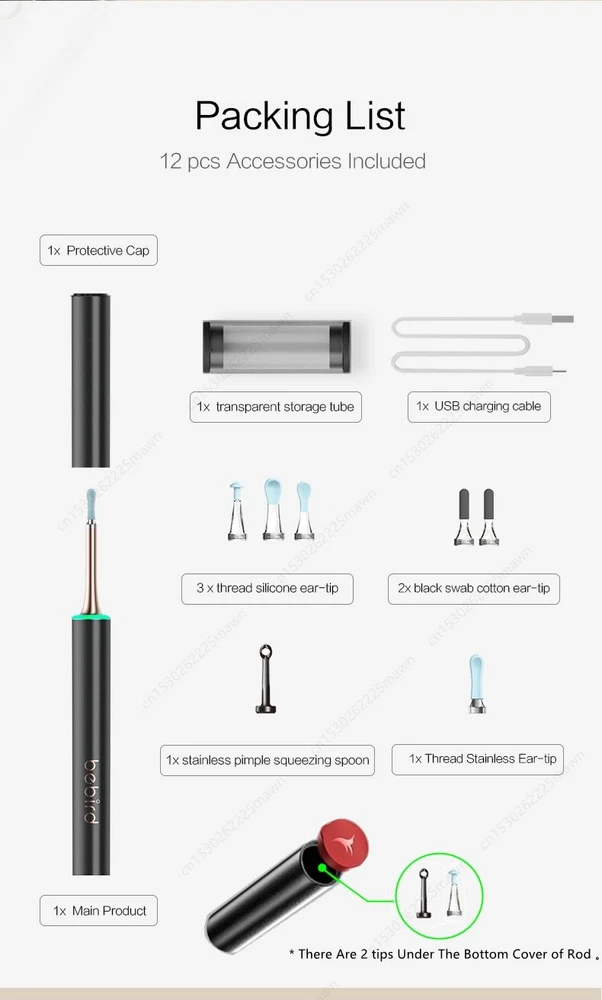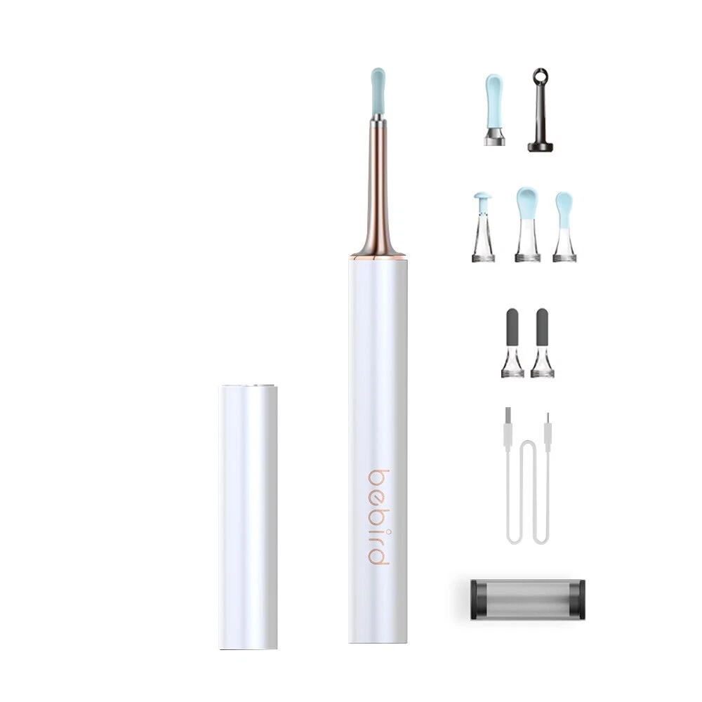 Bebird T15 Visual Ear Cleaner Minifit 2in1 Acne Wax Removal Tool HD1080P Otoscope IP67 Waterproof Endoscope Health Care Specification The Smart Visual Ear-Clean T15 is the Newest Generation of Bebird Visual Sticker. With WICE 4.0 Technology. Visual More Clearer. More Convenient. More Safety. Connection: Wireless WIFI Pixels: 5 Mega-pixels Lens diameter: 10-50mm Battery capacity: 300mAh Inpute current: DC 5V Charging time: 85min, Image transmission rate: 30fps. Rod Weight: 25g Image Sensor : CMOS Gyroscope : 6 axis Features Rapid WiFi visual connection. No connection is required to open picking ears. Use optical lens and high performance 300W pixel. The CMOS sensor has a clear picture, 20X amplifying ear canal & 100° viewing angle. 13 lens combination & 6 LED lights. IP67 waterproof lens. Water washable. Adapt to dry ear, oil ear and other complex environment. 3 axis smart directional gyroscope quick positioning, screen is not bias & shake. High-end OV chip video coding technique, hand-eye synchronous exciting picking! Strong WiFi signal, penetrating power, avoid delay. More safety protection. Earpick head buckle, over-hot earpick protection, timing automatic shutdown, children lock and anti frost cracking protection. Smart constant temperature control. Prevent low temperature & ear burning . Otoscope: 25°C non-inductive temperature. Earpick body: 32°C palm's temperature. Long endurance. Built-in 300mAh large capacity battery. Package included 1* Earpick Body, 1*Metal&Silicone Tip, 1*Metallic Pimple Popper ,1* Small Q-elastic Tip, 1* Large Q-elastic Tip, 2* Black Sponge Tip, 1* Annular Tip, 1* Type-C Charging Cable NOTICE: The Acne Clean Tip At the Top Of Rod, It has a Cover. Open the Cover, You can Find it. Otitis media and other diseases ears can safely picking. Children over 3 years old should be accompanied by adult.