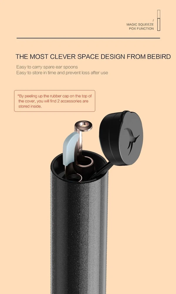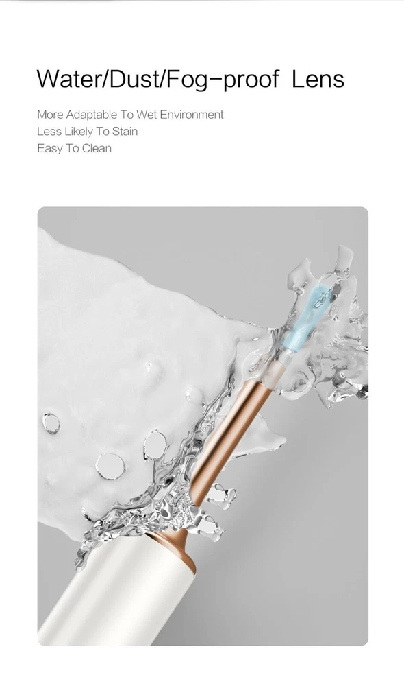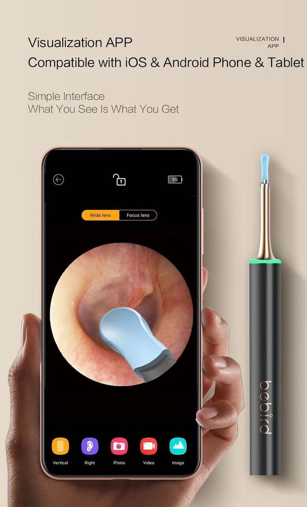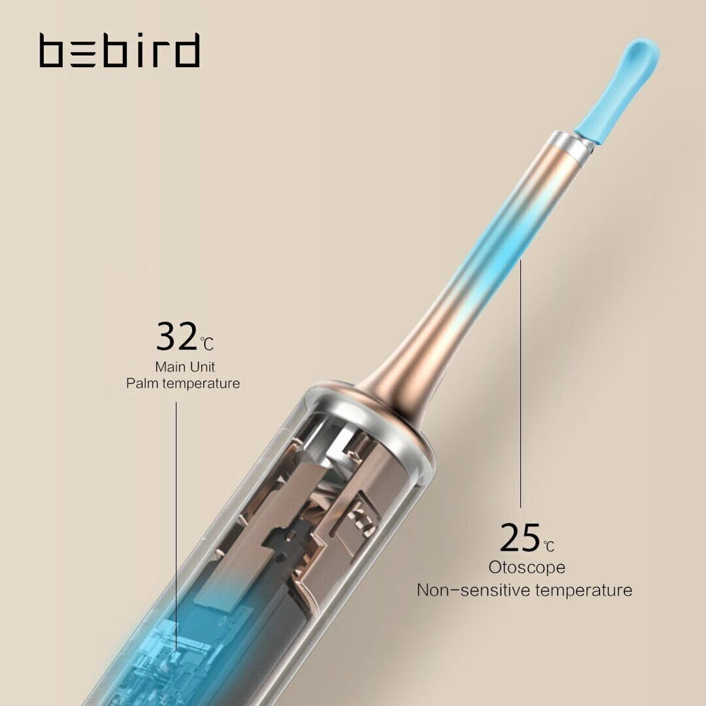 Bebird T15 Visual Ear Cleaner Minifit 2in1 Acne Wax Removal Tool HD1080P Otoscope IP67 Waterproof Endoscope Health Care Specification The Smart Visual Ear-Clean T15 is the Newest Generation of Bebird Visual Sticker. With WICE 4.0 Technology. Visual More Clearer. More Convenient. More Safety. Connection: Wireless WIFI Pixels: 5 Mega-pixels Lens diameter: 10-50mm Battery capacity: 300mAh Inpute current: DC 5V Charging time: 85min, Image transmission rate: 30fps. Rod Weight: 25g Image Sensor : CMOS Gyroscope : 6 axis Features Rapid WiFi visual connection. No connection is required to open picking ears. Use optical lens and high performance 300W pixel. The CMOS sensor has a clear picture, 20X amplifying ear canal & 100° viewing angle. 13 lens combination & 6 LED lights. IP67 waterproof lens. Water washable. Adapt to dry ear, oil ear and other complex environment. 3 axis smart directional gyroscope quick positioning, screen is not bias & shake. High-end OV chip video coding technique, hand-eye synchronous exciting picking! Strong WiFi signal, penetrating power, avoid delay. More safety protection. Earpick head buckle, over-hot earpick protection, timing automatic shutdown, children lock and anti frost cracking protection. Smart constant temperature control. Prevent low temperature & ear burning . Otoscope: 25°C non-inductive temperature. Earpick body: 32°C palm's temperature. Long endurance. Built-in 300mAh large capacity battery. Package included 1* Earpick Body, 1*Metal&Silicone Tip, 1*Metallic Pimple Popper ,1* Small Q-elastic Tip, 1* Large Q-elastic Tip, 2* Black Sponge Tip, 1* Annular Tip, 1* Type-C Charging Cable NOTICE: The Acne Clean Tip At the Top Of Rod, It has a Cover. Open the Cover, You can Find it. Otitis media and other diseases ears can safely picking. Children over 3 years old should be accompanied by adult.