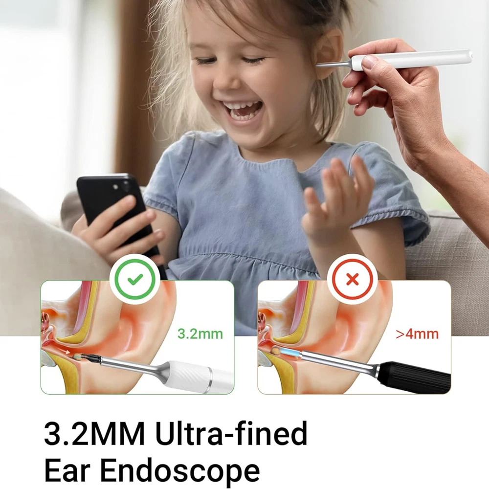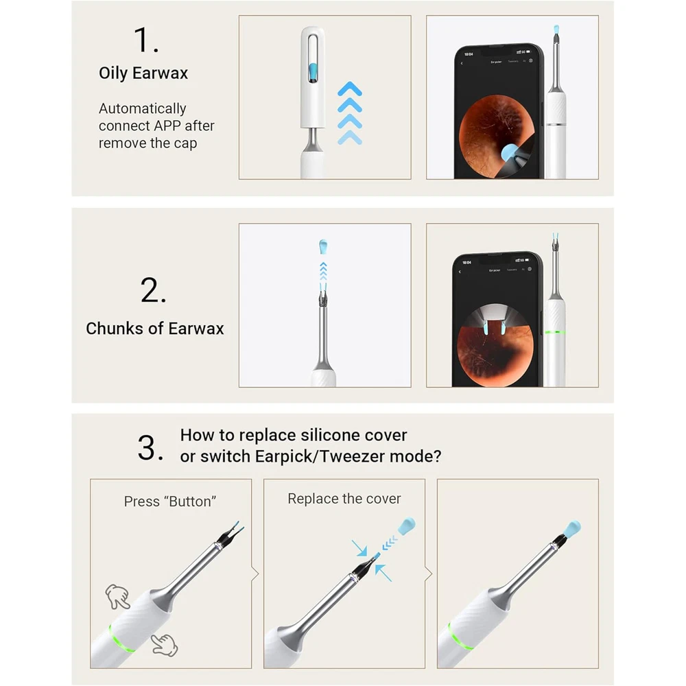 Features: Omnidirectional Gyroscope Stabilizer: This visual ear cleaning tool features an all-around gyroscope stabilizer, ensuring and precise operation for a and comfortable ear cleaning experience. Intuitive Directional Control: The tool's omnidirectional gyroscope allows for easy navigation, enabling you to whichever ear you point to, whether you're sitting or lying down. Clear Inner Ear View: With this visual ear cleaning tool, you can clearly see inside your ear, making the cleaning process more efficient and enjoyable, and allowing you to live a more comfortable . Tweezers: The set includes tweezers for removing larger pieces of ear wax, providing a thorough and comprehensive cleaning solution. Visual Ear Spoon: The visual ear spoon allows for a smooth and satisfying ear cleaning experience, ensuring that every cleaning session is efficient and comfortable. Specifications: Color: blue, white(optional) Product netweight: 29g Pixel: 10 pixels Lens diameter: 3.2mm : -ion 230 mAh Working : About 60mins : About 60mins Gyroscope: Intelligent Gimbaled Gyroscope Port:Type -C Packing Size: 85*17.5*200mm Package Weight: 105g Package List: W23804W 1 * 6 *Replaceable ear spoon cover 2 * cleaning for lens or ear spoon 1 * cable