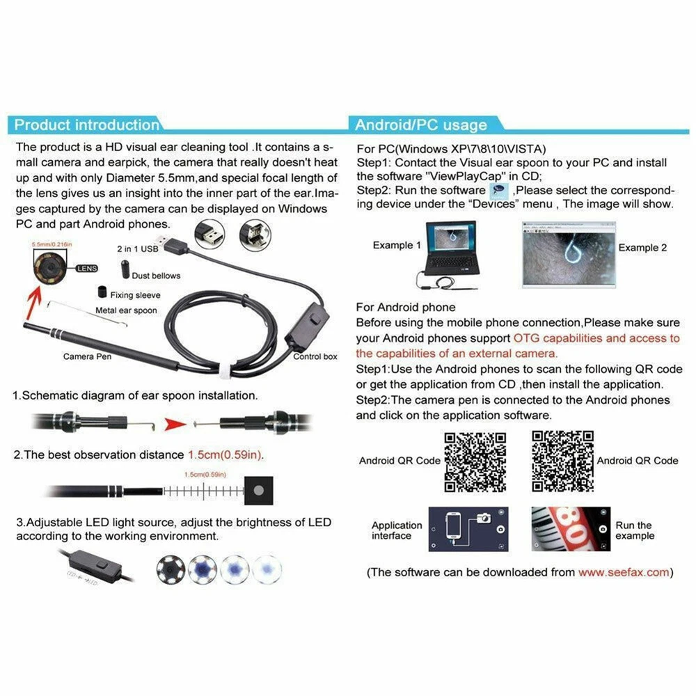 Product Description Features: With electronic micro-camera, you can achieve real-time observation of the whole process of dig earwax through the USB data cable. Ultra small lens with HD pixels, easy access ear canal and see more clearly. 6pcs LED lamp brightness can be adjusted by dimmer button of the control box according to your need. A essential tool for each family. Multifunctional ! It not only can check the ear canal, but also can check the eardrum, mouth, gums, throat, nasal cavity, scalp hair root and other body parts. Specifications: Connecting: For Windows PC, for android system with OTG function Lens: 5.5mm Pixel: 0.3MP Focus distance: 1.5cm Material: plastic, metal Pen length: About 15cm Package size: 23x8.5x3cm Color: black Digital USB Mini Camera Easy Computer Installation Guide: Windows 7/10: Connect the USB to the Computer. The device driver will be automatically installed. Go to START. Search for the Windows app ‘Camera’. Open the Camera app. Hint: Change the camera if it shows the Webcam by clicking on the camera icon, Select USB 2.0 PC CAMERA. MAC OS: 1. Connect the USB to the Computer. 2. The device driver will be automatically installed. 3. Go to Launchpad. 4. Search for QuickTime Player. 5. Open QuickTime Player and select “New Movie Recording”. 6. Select USB 2.0 PC CAMERA if different camera is showing. Android mobile devices: Note: Compatible devices must support USB OTG Function. Download CameraFi2 app from Google Playstore Open the CameraFi2 app Plug the USB into your phone after the app is running. If you plug the device in before running the app, it will NOT work. Package included: 1x Pen Camera 2x Earpicks 1x Dust bellows 1x Manual 1x Type-C converter If you have any questions, please feel free to contact us via ebay. We usually respond within 24 hours. Payment Shipping Returns Contact Us We accept all verified payments from ebay. Orders will be shipped after receiving cleared payment. Payment due within 7 days after auction ends and for buy it now listings. We ship most of our orders within 24 hours, and may up to 48 hours for. If you want faster shipping way. Please contact us before making payment. Sometimes due to problems with our transportation company system, your shipping information may be delayed to update. We recommend that you try again after 3-4 days. If you still haven't checked the shipping information, you can contact us by ebay message. Always believe we can figure things out with communication, if it comes to return, the pacakge must be intact and the same as you receive. If you have any questions, please feel free to email our service specialists 24 Hours a Day, 7 Days a Week. We will reply you ASAP. Return/refund is accepted within 30 days after the buyer receives the item. NO exchange will be accepted after 30 days from the date when the item is received. Please contact us first before returning your product!!! If you have any questions, our Customer Service staffs welcome you to email us. We strive to answer all questions and resolve any problems as quickly as possible. You can contact us 7*24, we will reply at the first time, and we will surely solve your problems. Note: 1.We try our best to reply to your emails as soon as possible, however, due to high volume of daily incoming emails and time zone difference, we may not be able to reply your emails immediately. Please allow 1 business days for us to response. If you do not receive any reply from us, please check your email ensuring your mailbox has not reached full size. 2.Due to some ISP SPAM filter settings, you may not be able to receive our replies; if you have problems receiving our emails, you may need to use a different email account to contact us. 3.Please give us the opportunity to resolve any problem. We understand the concerns and frustrations you might have, and will try our best to resolve the issues. Please email us before leaving any negative feedback or open any dispute on PayPal. 4.We care about our valued customers, and will always try to help you. So if you have any problems, please e-mail us immediately. Payment We accept all verified payments from ebay. Orders will be shipped after receiving cleared payment. Payment due within 7 days after auction ends and for buy it now listings. Shipping We ship most of our orders within 24 hours, and may up to 48 hours for. If you want faster shipping way. Please contact us before making payment. Sometimes due to problems with our transportation company system, your shipping information may be delayed to update. We recommend that you try again after 3-4 days. If you still haven't checked the shipping information, you can contact us by ebay message. Returns Always believe we can figure things out with communication, if it comes to return, the pacakge must be intact and the same as you receive. If you have any questions, please feel free to email our service specialists 24 Hours a Day, 7 Days a Week. We will reply you ASAP. Return/refund is accepted within 30 days after the buyer receives the item. NO exchange will be accepted after 30 days from the date when the item is received. Please contact us first before returning your product!!! Contact Us If you have any questions, our Customer Service staffs welcome you to email us. We strive to answer all questions and resolve any problems as quickly as possible. You can contact us 7*24, we will reply at the first time, and we will surely solve your problems. Note: 1.We try our best to reply to your emails as soon as possible, however, due to high volume of daily incoming emails and time zone difference, we may not be able to reply your emails immediately. Please allow 1 business days for us to response. If you do not receive any reply from us, please check your email ensuring your mailbox has not reached full size. 2.Due to some ISP SPAM filter settings, you may not be able to receive our replies; if you have problems receiving our emails, you may need to use a different email 