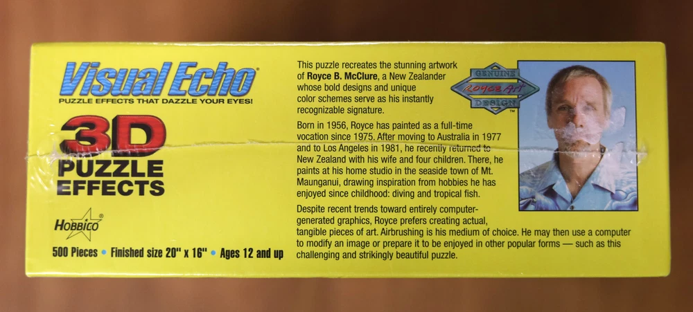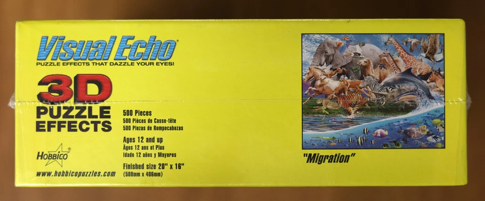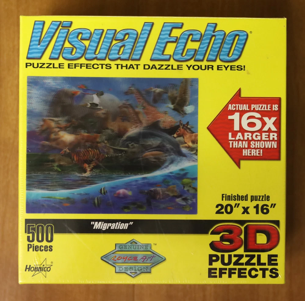 This is a brand new sealed 500 piece puzzle. This puzzle features stunning artwork by Royce B. McClure, a New Zealander. The artwork is titled "Migration" and features a wide variety of animals both on land and under the sea. This puzzle has special 3D effects that dazzle your eyes! It looks holographic! The finished size will be 20 inches by 16 inches.