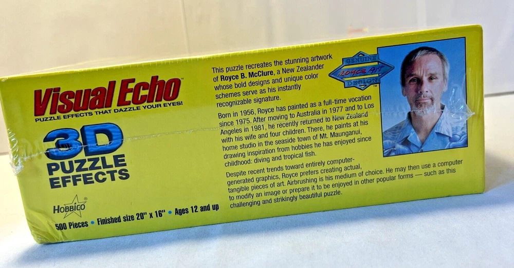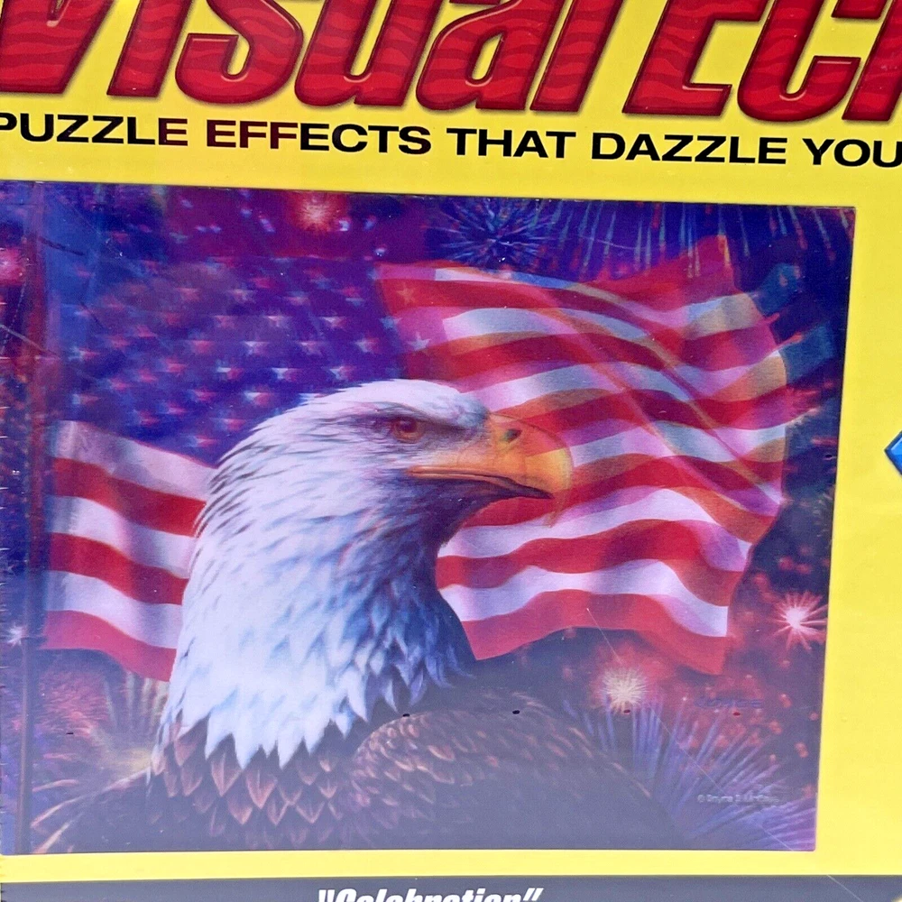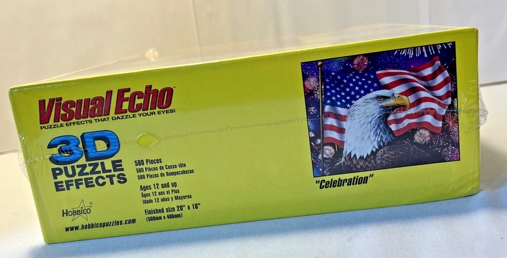 Celebrate America with this American Flag Bald Eagle 3D puzzle from Hobbico Visual Echo from 2004. With 500 pieces, this puzzle is perfect for puzzle enthusiasts of all levels. The puzzle features a stunning 3D Puzzle Effects image of the iconic American eagle and flag. . This puzzle is a great addition to any puzzle collection and is perfect for family gatherings or solo relaxation. The puzzle is still sealed and comes with all the pieces included. Get ready to put your puzzle-solving skills to the test and enjoy the challenge of this American Flag Bald Eagle puzzle. Finished size is 20" x 16". C7 * *Feel confident when purchasing from me -- I consistently deliver outstanding customer service and have achieved the Ebay Top Rated Plus seal.