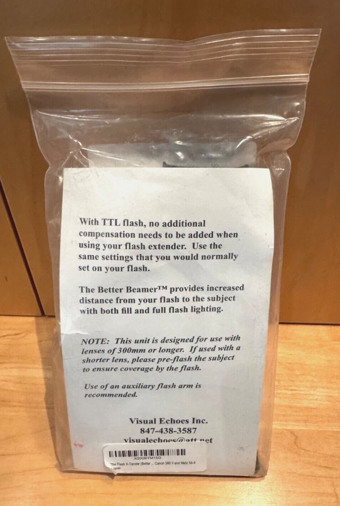 You are bidding on a NEW Better Beamer Flash Extender by Visual Echoes. It is model number FX-3. This item has never been used and is still in its factory packaging. See the photos for exactly what you will receive. I will ship via USPS Ground Advantage so you will receive this item promptly. Here is some info from the manufacturer: The Visual Echoes FX3 Better Beamer Flash Extender will help increase the reach of Canon 580EX, 580 EX II, 600EX-RT, Nikon SB-700 and Metz 54MZ-4 flash units, and increases the flash output by about 2 to 3 f/stops. It focuses and concentrates the output of the flash into a narrow beam via the Fresnel panel that gets positioned in front of the flash. This allows shooting at greater distances and shooting with smaller apertures. The Better Beamer is designed to be used with lenses 300mm and longer, and its rugged, injection-molded plastic side supports are attached to the flash head by a sturdy elastic "hook-and-loop" band. The rigid supports hold the Fresnel screen in place in both horizontal and vertical formats. Excellent for wildlife and birding photography, where long-distance fill-flash is often required, especially with a bright sunlight background. The use of fill flash opens up the shadows without the appearance that a flash was used. When used with TTL flash metering, exposure is automatically set by the camera and flash, and no special compensation is required. Reduces the drain on battery power by two-thirds.